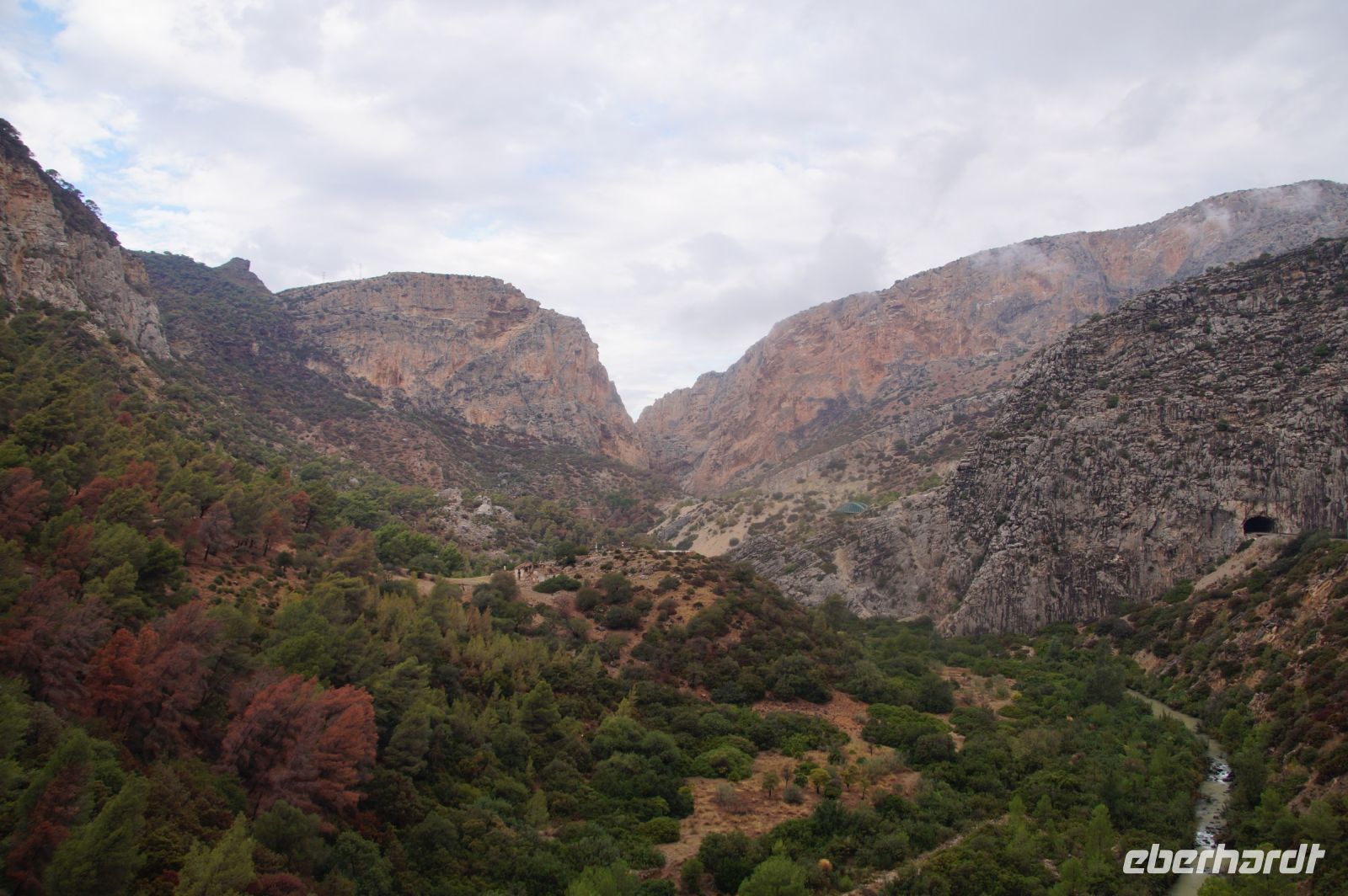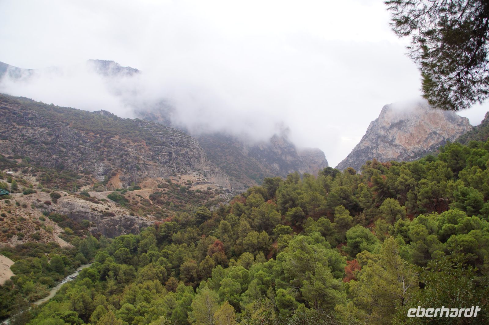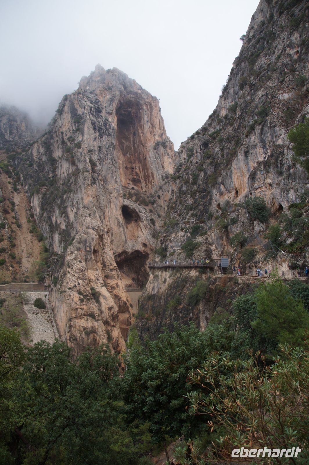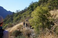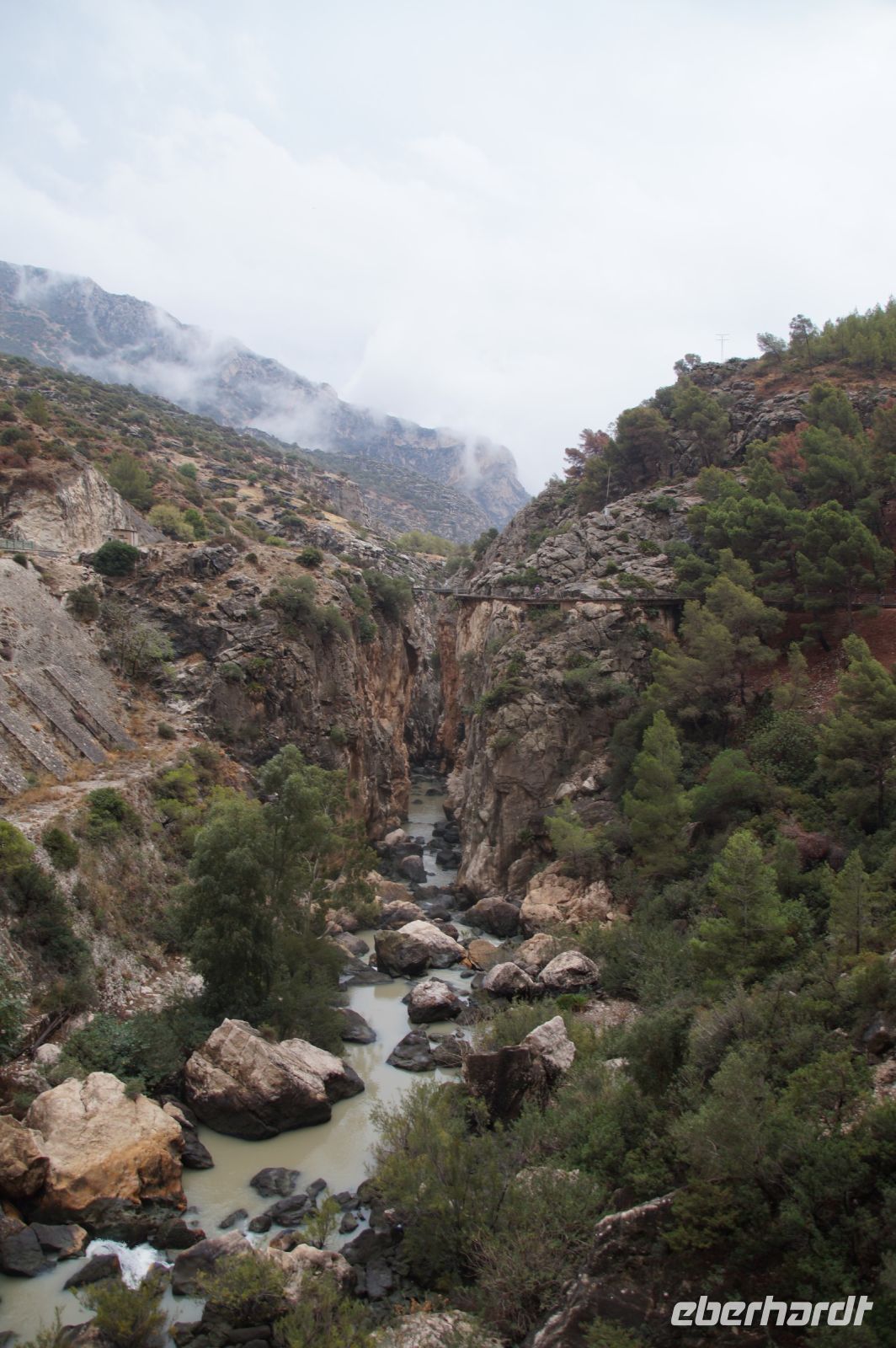 Steilwände wechselten sich mit lieblicheren und baumbewachsenen Abschnitten ab, bis wir schließlich in der letzten Schlucht über eine Hängebrücke liefen, die durchaus nichts für Leute ist, die nicht schwindelfrei sind, obwohl man hier absolut sicher ist. Danach ließ man die Schlucht hinter sich, musste nur noch treppab und - auf gehen, bis man endgültig festen Boden unter den Füßen hatte, dann ging es bergab, dem Dorf el Chorro entgegen.