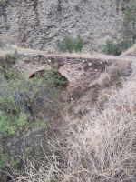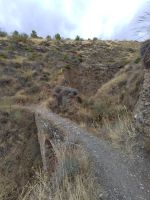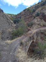 An der Stierkampfarena vorbei gehen wir zu den La Cuenca-Gärten (Jardines de la Cuenca), von wo aus wir in den Tajo hinunterschauen. Tajo hat hier nichts mit dem Fluss Tajo in Zentralspanien bzw. Tejo in Portugal zutun. Der bekannte Fluss, der längste auf der iberischen Halbinsel, hieß bei den Römern Tagus, der Tajo de Ronda kommt hingegen von "taliare" 'schneiden', bzw. vom Partizip "taliatus". Gewissermaßen der Einschnitt von Ronda. Der Fluss der hier durch fließt, der ihn geschaffen hat, ist der sedimentreiche Guadalevin (von arab. wadi l-laban, 'Milchfluss'). Über die Brücke El Puente Viejo (die alte Brücke, die zweitälteste der drei Brücken von Ronda) verlassen wir die Neustadt Mercadillo ('Märktchen') und betreten die Altstadt (La Ciudad). Das "Märktchen" ist um ein vielfaches größer als die Stadt, hat sich aber erst so richtig nach dem Bau der 98 m hohen Puente Nuevo im 18. Jhdt. entwickelt. Erst mit deren Fertigstellung kam man kompfortabel auf die andere Seite der Schlucht.