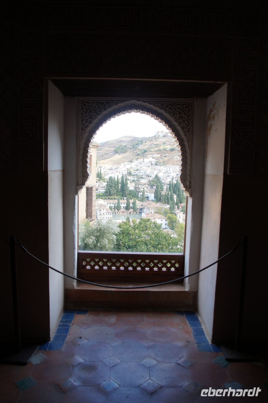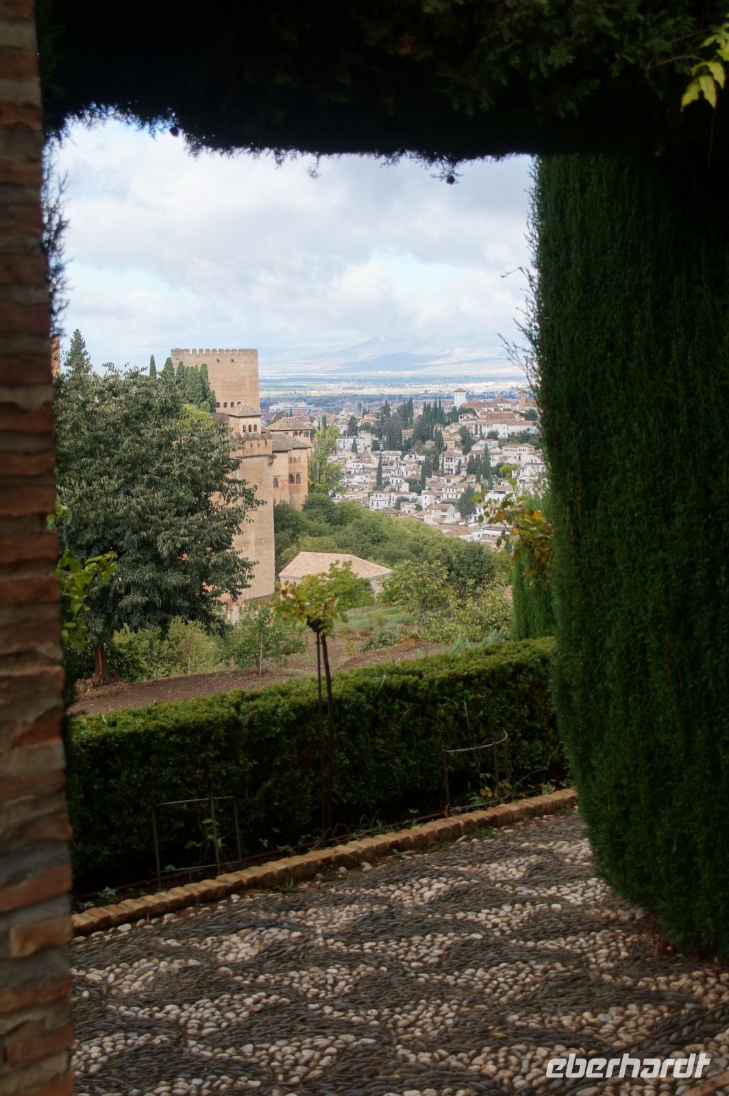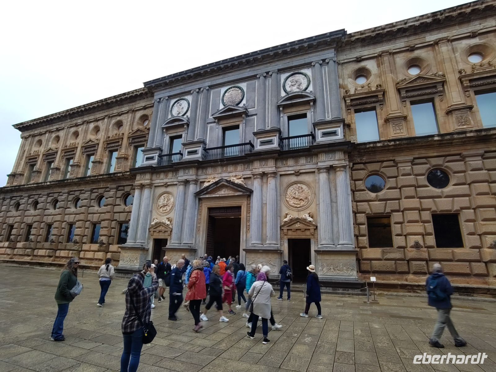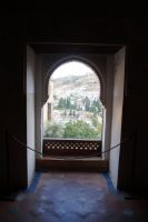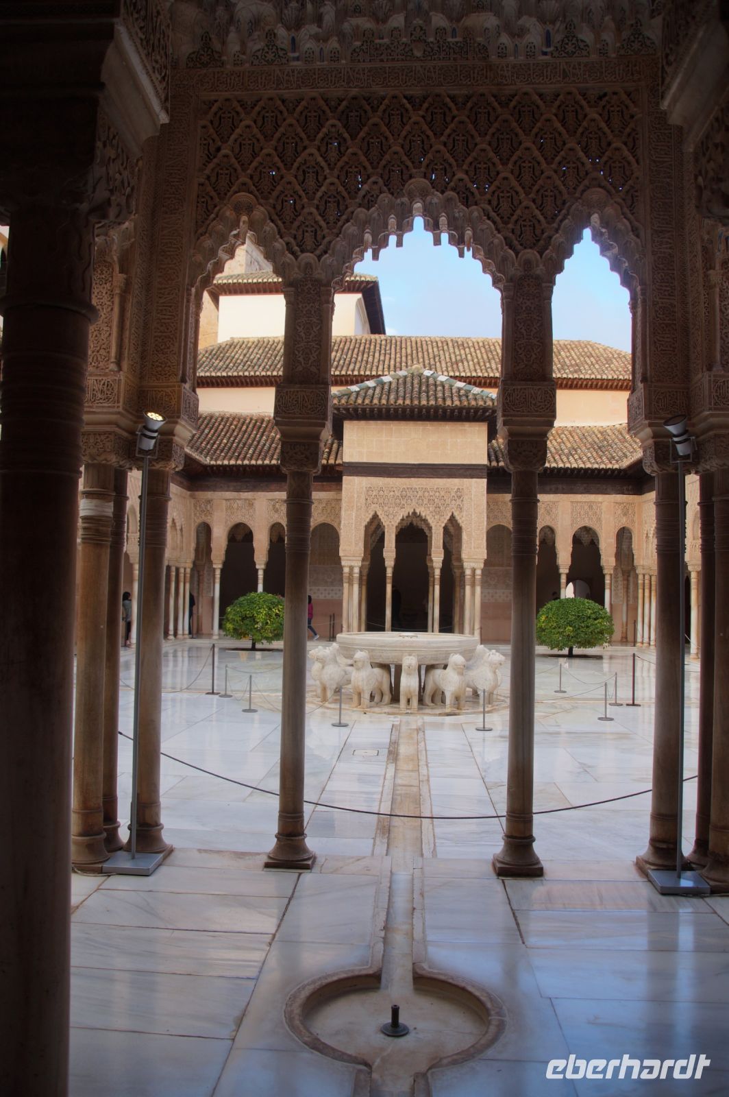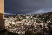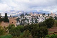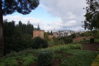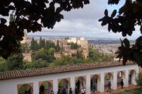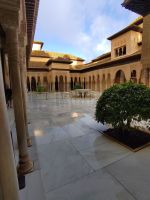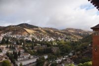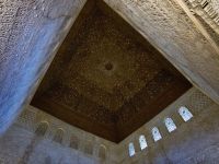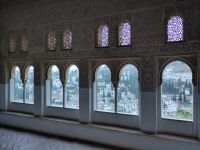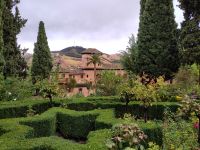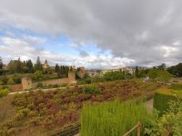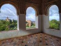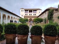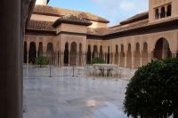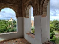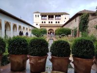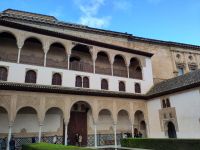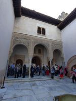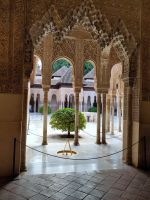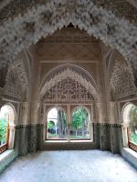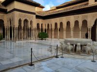 Danach betreten wir den Haram, den Privatbereich des Palastes, dessen Zentrum der Löwenhof ist. Wir sehen die Muqarnas, die architektonischen Stalaktiten, welche an Muhammads Flucht vor den Häschern aus Mekka erinnern sollen, als er sich in einer Höhle versteckte und die Spinnen ihre Netze vor den Eingang webten, so, dass die Höhle so wirkte, als habe sie seit Jahren niemand betreten. Wir sehen auch das Gemälde von den Sultanen Granadas, es folgen noch spektakuläre Aussichten auf den Albaycín und den Sacromonte und dann sind wir aus den Palästen auch schon wieder heraus. Seit neuestem sind die Tore des Palastes Karls V. zur Gartenseite hin geöffnet, was ihn gleich freundlicher wirken lässt, auch weil man jetzt durch die gegenüberliegende Tür wieder hinaus schauen kann.