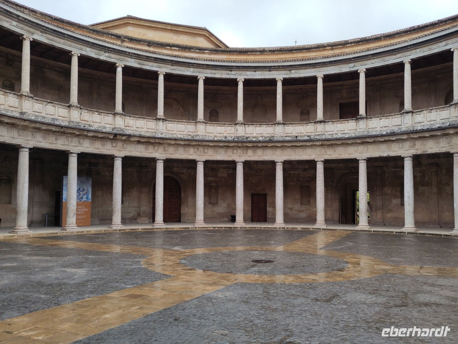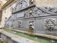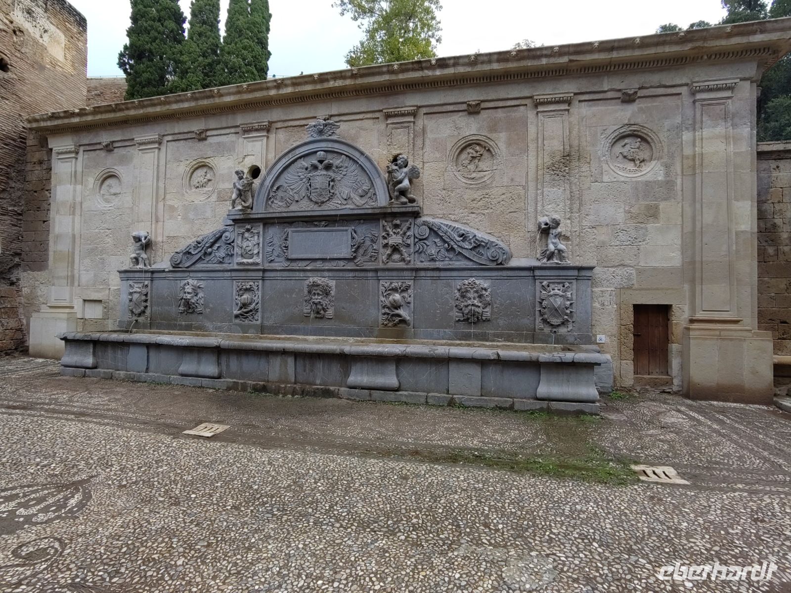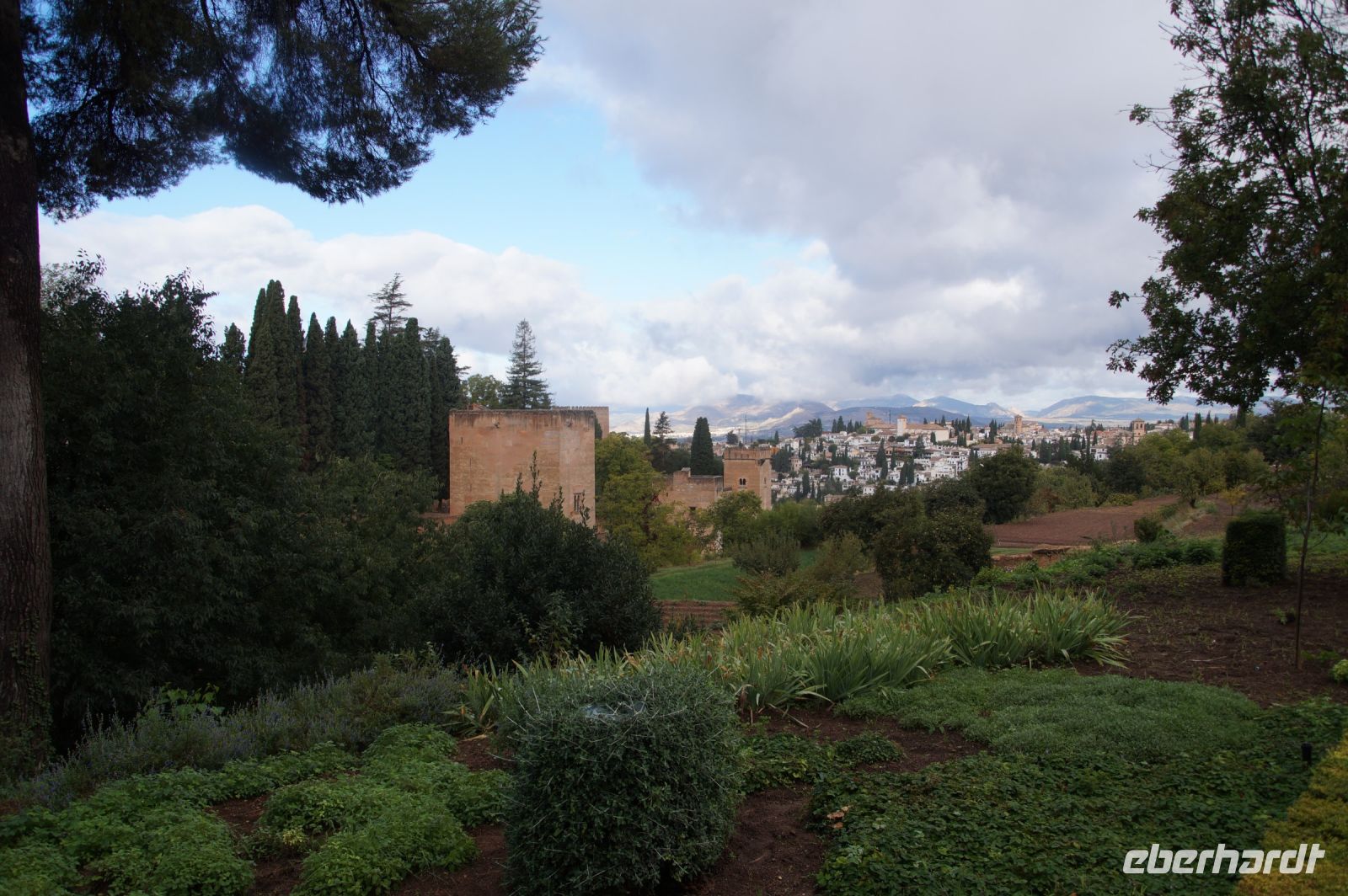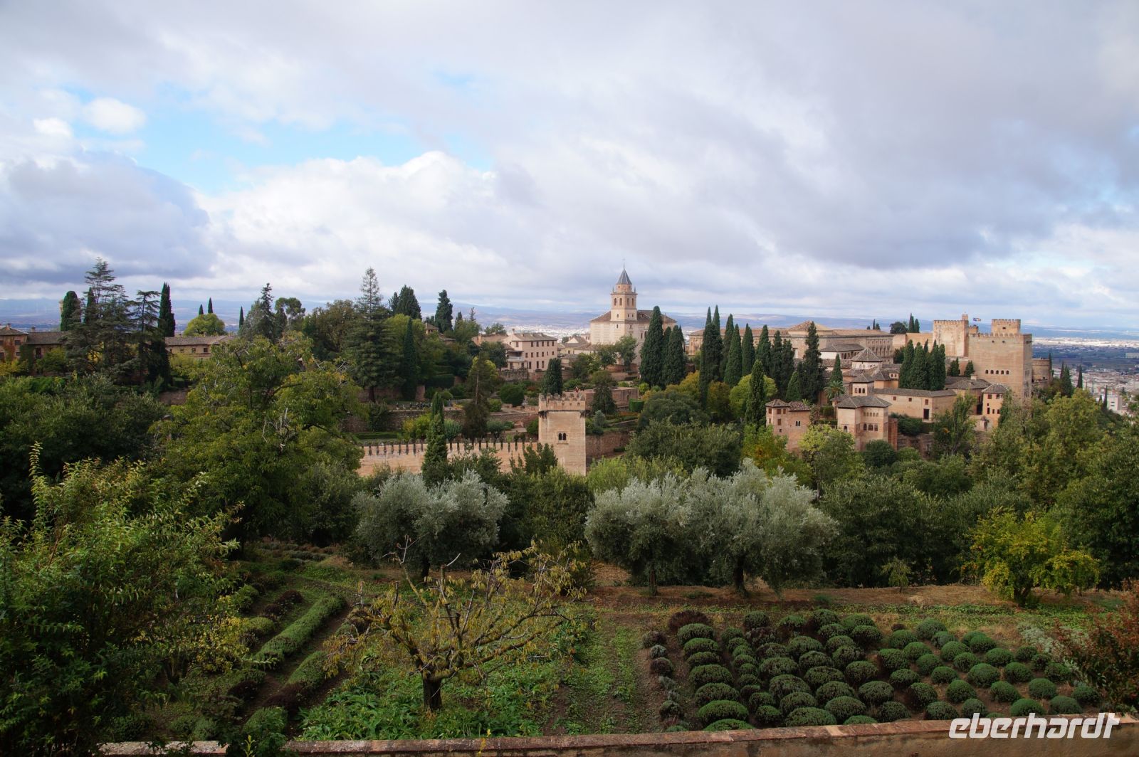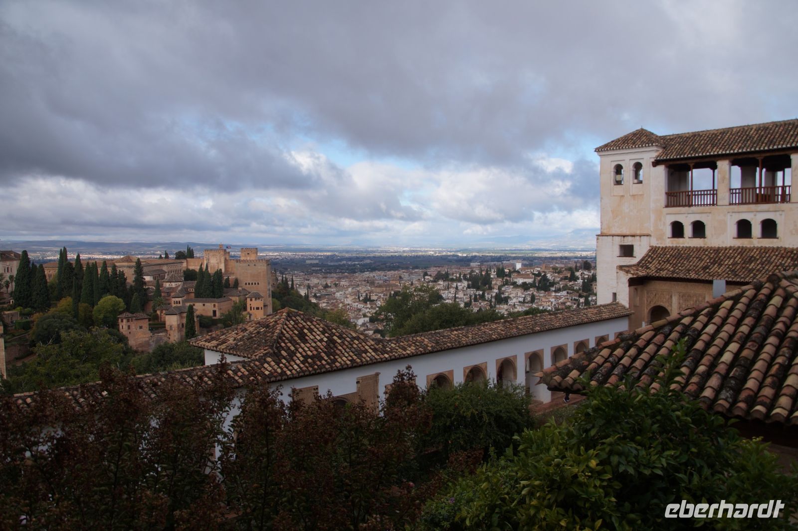 Danach betreten wir den Haram, den Privatbereich des Palastes, dessen Zentrum der Löwenhof ist. Wir sehen die Muqarnas, die architektonischen Stalaktiten, welche an Muhammads Flucht vor den Häschern aus Mekka erinnern sollen, als er sich in einer Höhle versteckte und die Spinnen ihre Netze vor den Eingang webten, so, dass die Höhle so wirkte, als habe sie seit Jahren niemand betreten. Wir sehen auch das Gemälde von den Sultanen Granadas, es folgen noch spektakuläre Aussichten auf den Albaycín und den Sacromonte und dann sind wir aus den Palästen auch schon wieder heraus. Seit neuestem sind die Tore des Palastes Karls V. zur Gartenseite hin geöffnet, was ihn gleich freundlicher wirken lässt, auch weil man jetzt durch die gegenüberliegende Tür wieder hinaus schauen kann.