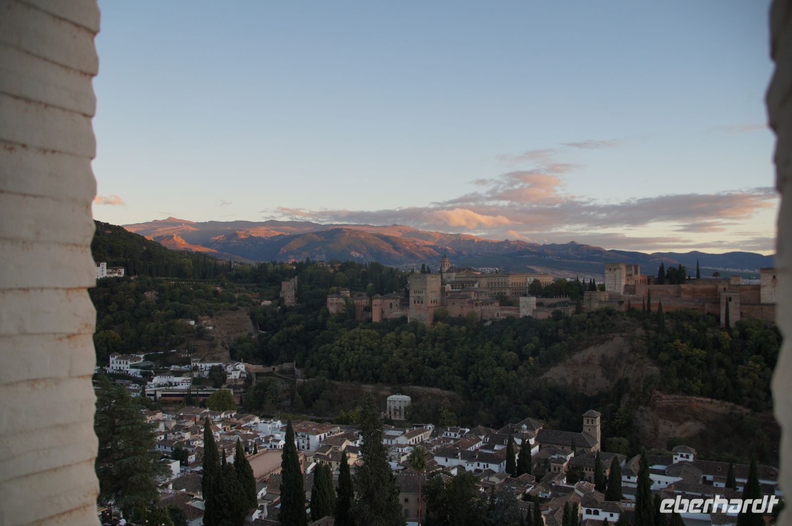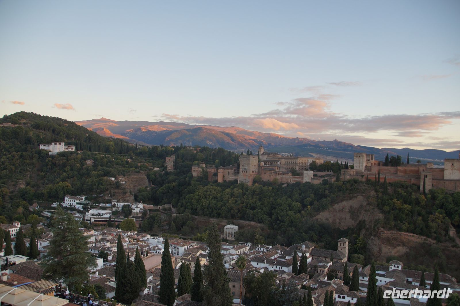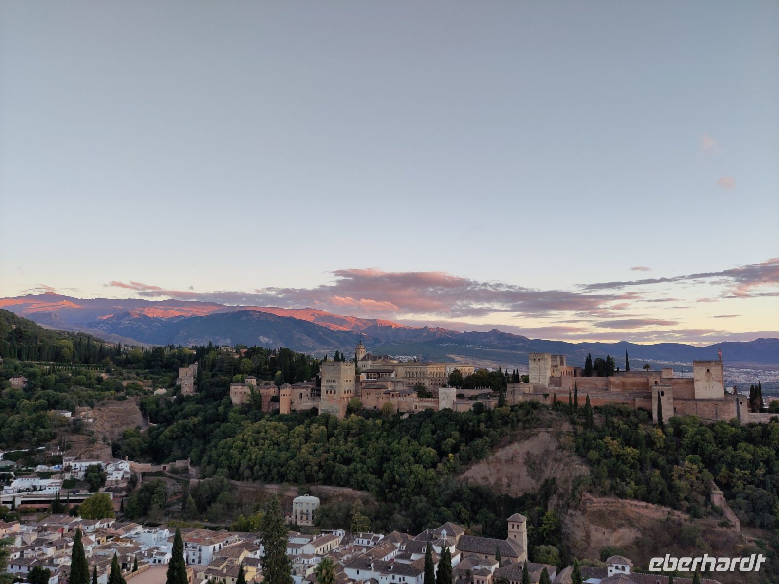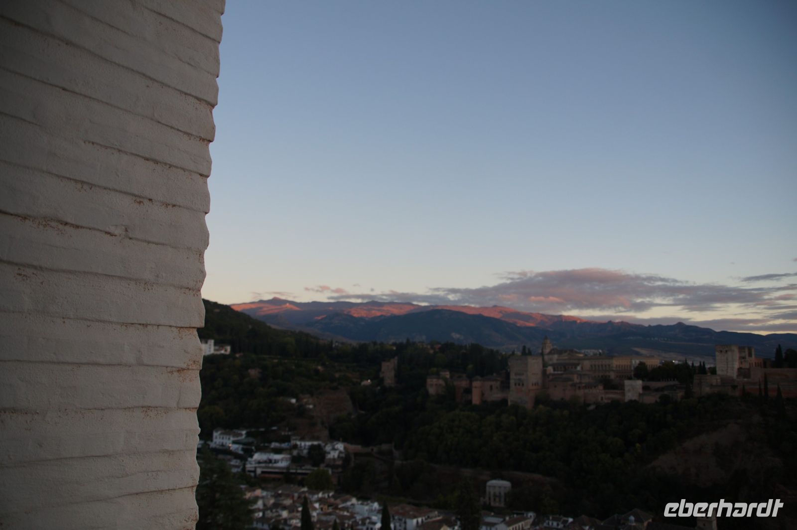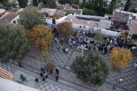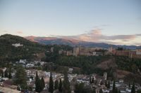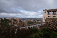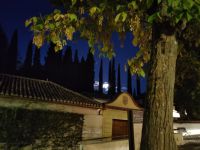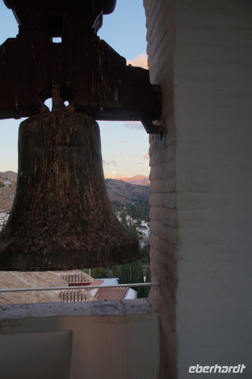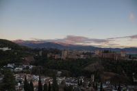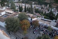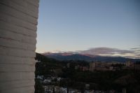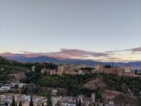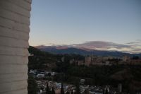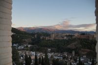Später wandern wir vom Hotel aus los, die Cuesta del Rey Chico (Anstieg des Kleinen Königs, gemeint ist Abu Abdallah = Boabdil) hinunter, überqueren den Darro (< dat aurum = gibt Gold) und steigen hoch zum Mirador San Nicolás, nicht ohne zuvor einen Schlenker um die 2003 im andalusisch-magribinischen Stil errichtete neue Moschee gemacht zu haben. Vom Mirador aus hat man den besten Blick auf die Alhambra, die wir im Sonnenuntergang sehen wollen. Einige wechseln rüber zum Garten der Moschee, aber hier stört ein Baum die Sicht, wir kehren zurück zum Mirador San Nicolás. Beim Blick in die geöffnete Kirche sehen wir, dass der Kirchturm zugänglich ist. Spontan steigen wir hinauf und sind hier oben fast allein.