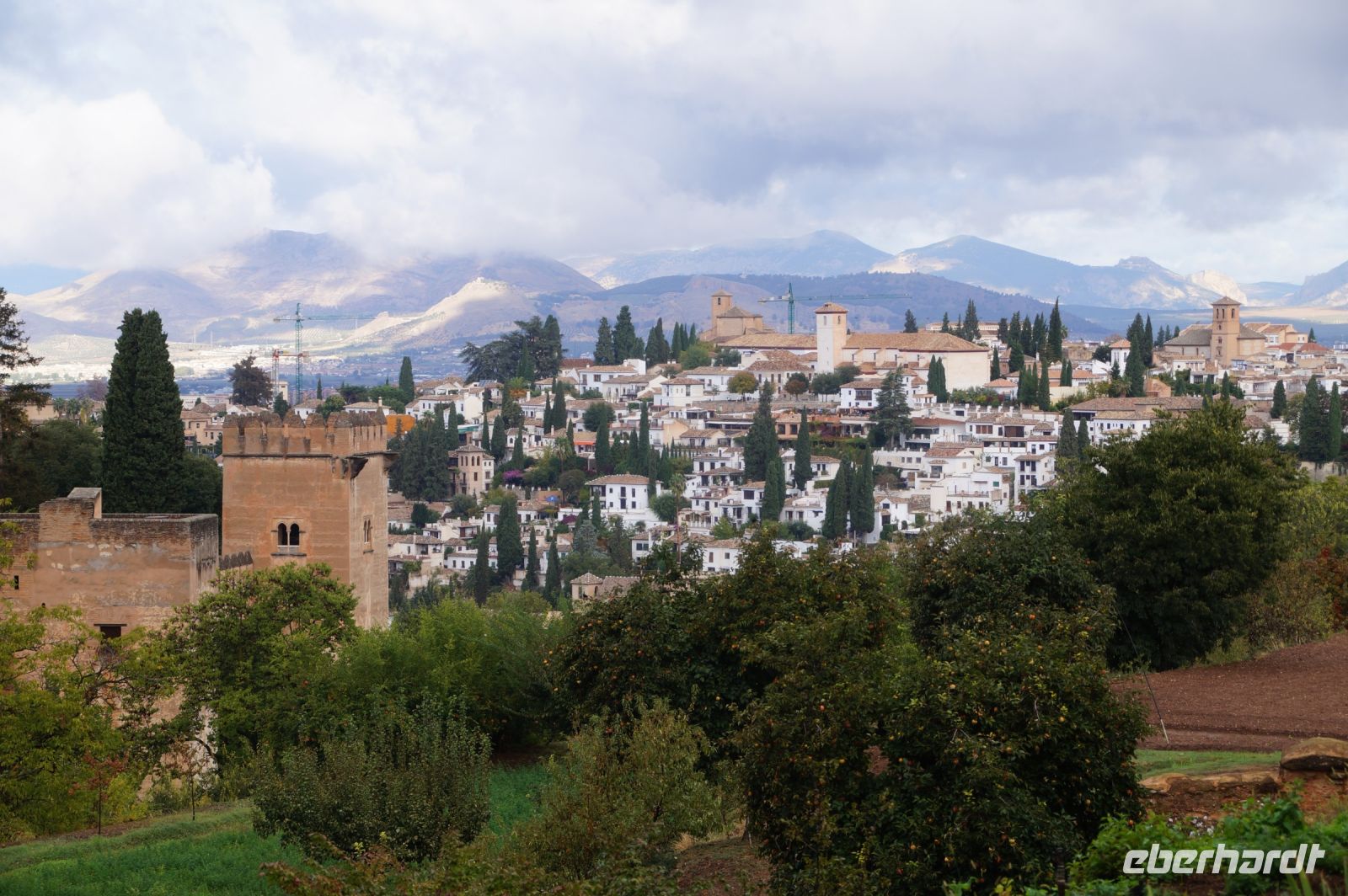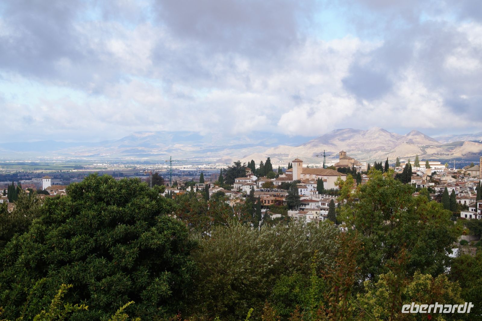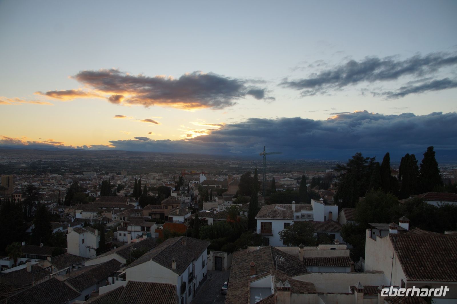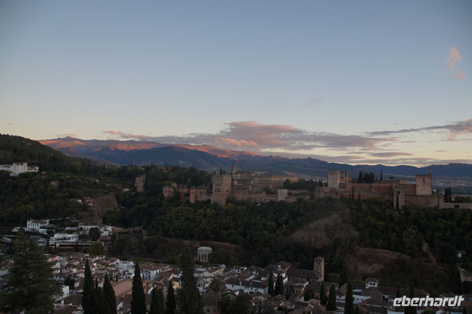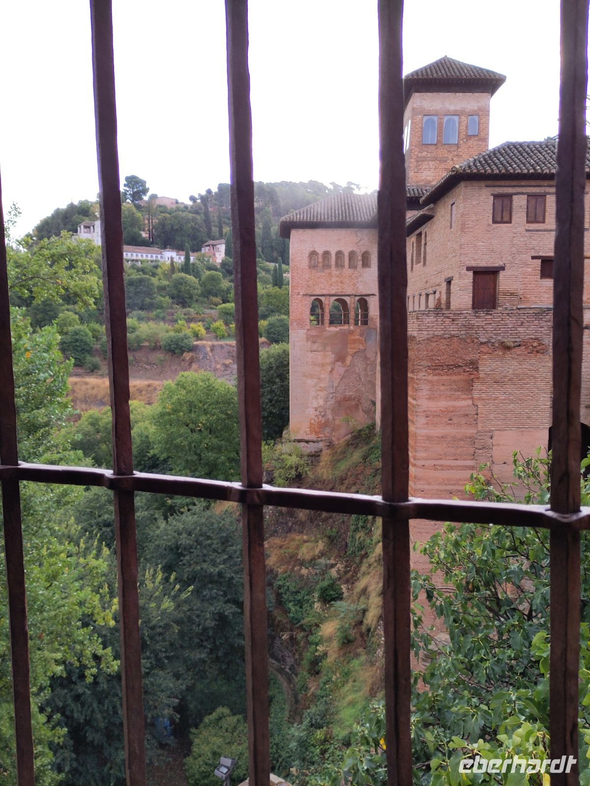 Später wandern wir vom Hotel aus los, die Cuesta del Rey Chico (Anstieg des Kleinen Königs, gemeint ist Abu Abdallah = Boabdil) hinunter, überqueren den Darro (< dat aurum = gibt Gold) und steigen hoch zum Mirador San Nicolás, nicht ohne zuvor einen Schlenker um die 2003 im andalusisch-magribinischen Stil errichtete neue Moschee gemacht zu haben. Vom Mirador aus hat man den besten Blick auf die Alhambra, die wir im Sonnenuntergang sehen wollen. Einige wechseln rüber zum Garten der Moschee, aber hier stört ein Baum die Sicht, wir kehren zurück zum Mirador San Nicolás. Beim Blick in die geöffnete Kirche sehen wir, dass der Kirchturm zugänglich ist. Spontan steigen wir hinauf und sind hier oben fast allein.