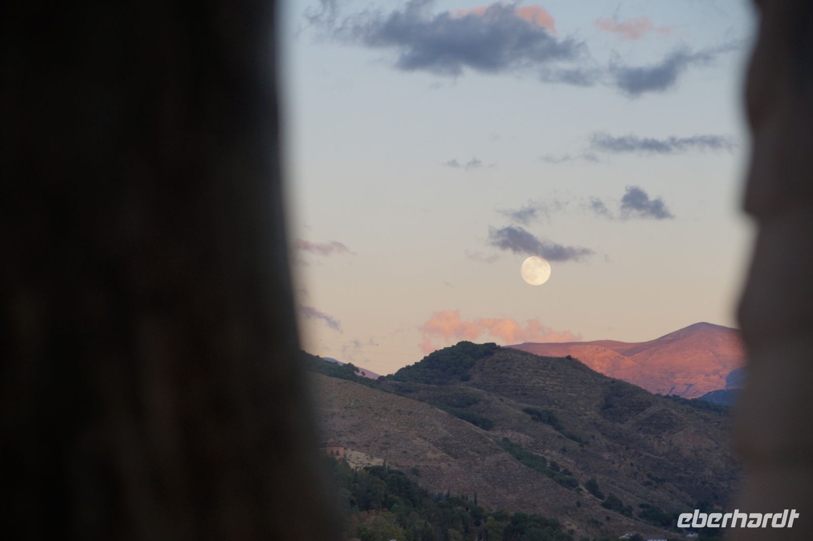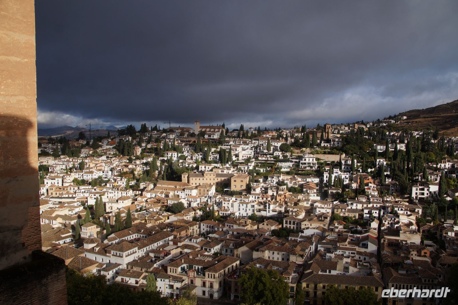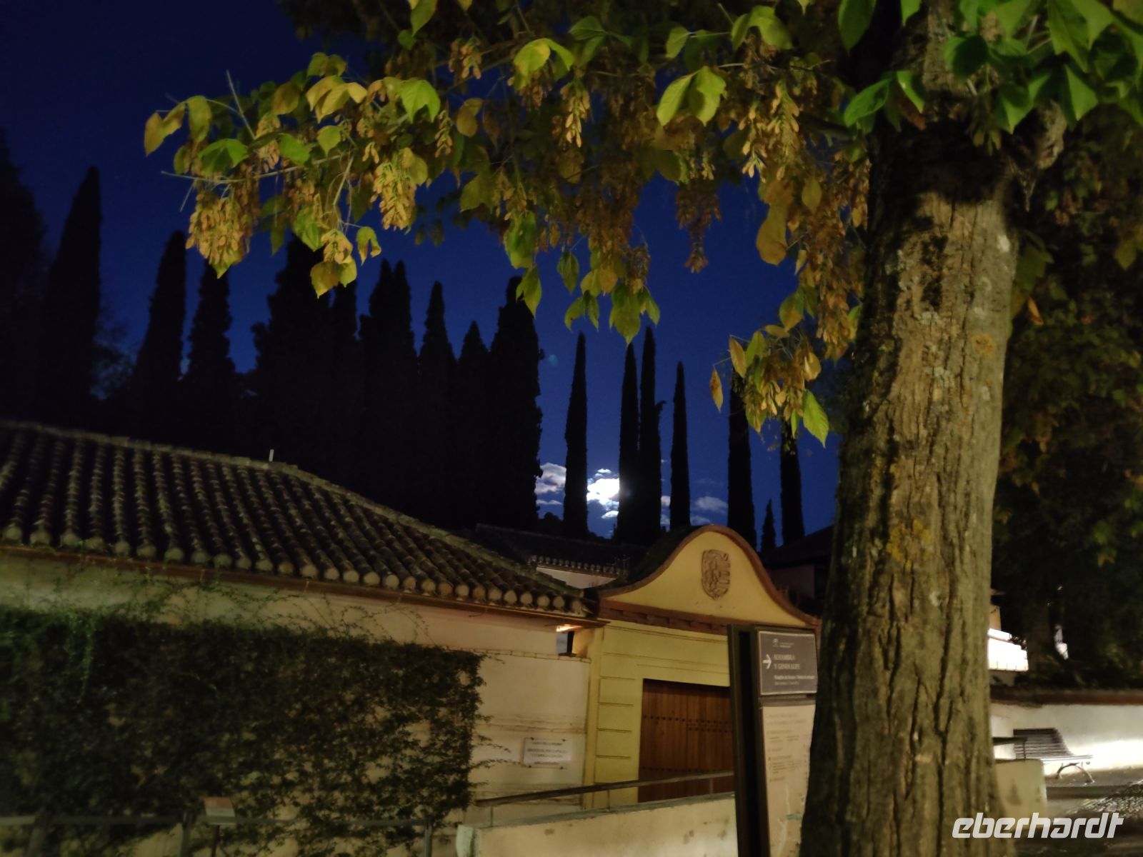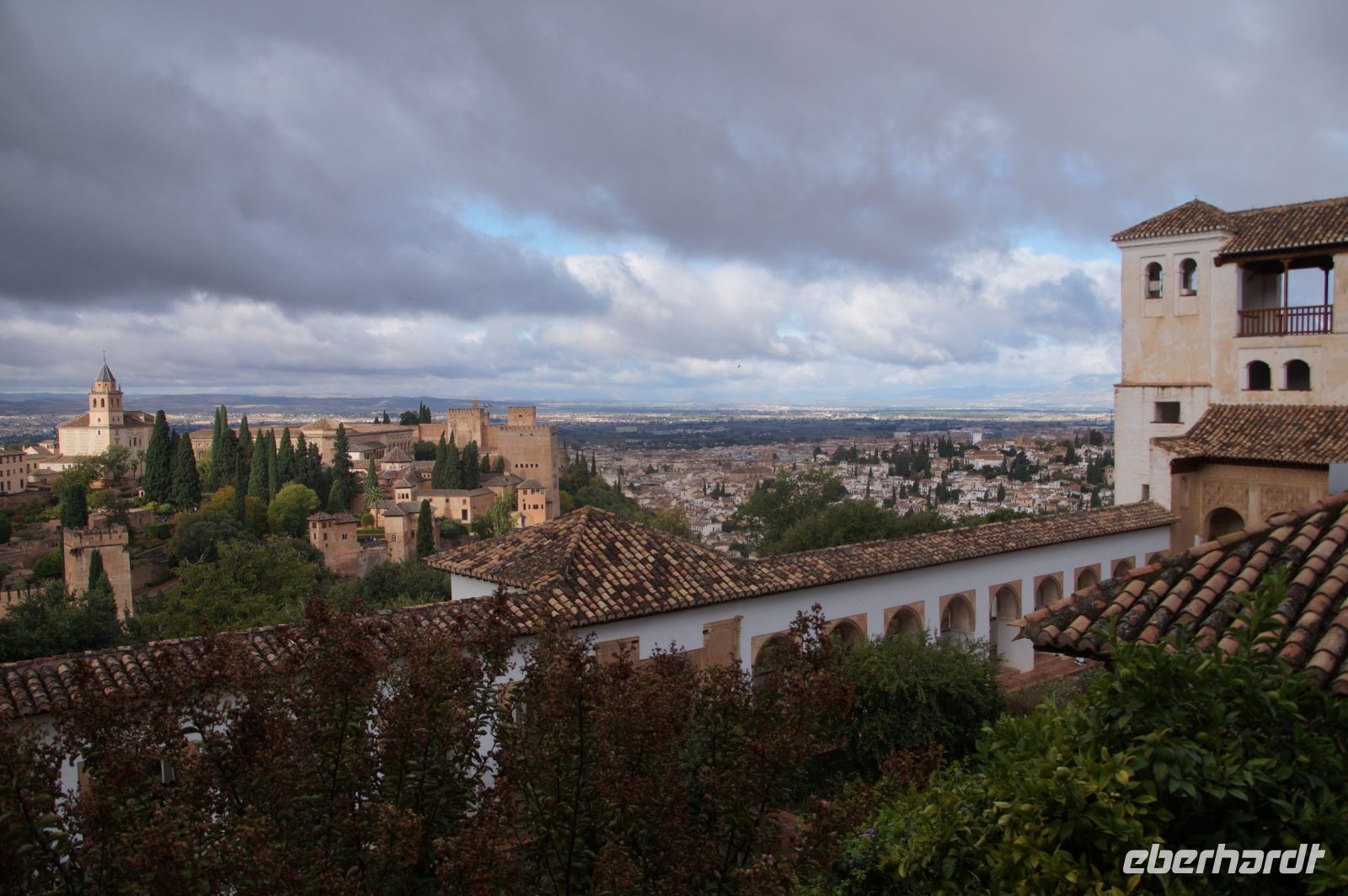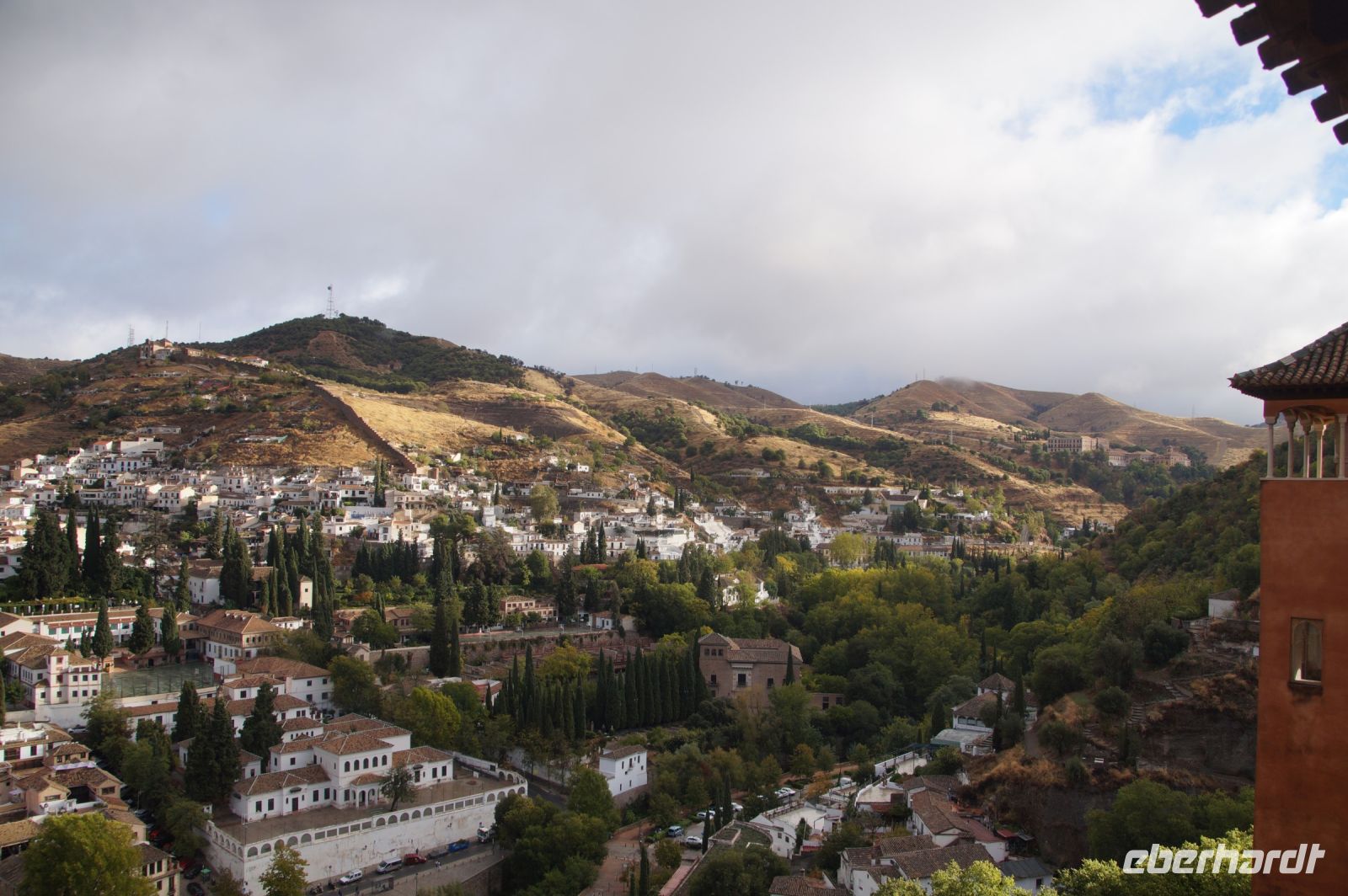 Später wandern wir vom Hotel aus los, die Cuesta del Rey Chico (Anstieg des Kleinen Königs, gemeint ist Abu Abdallah = Boabdil) hinunter, überqueren den Darro (< dat aurum = gibt Gold) und steigen hoch zum Mirador San Nicolás, nicht ohne zuvor einen Schlenker um die 2003 im andalusisch-magribinischen Stil errichtete neue Moschee gemacht zu haben. Vom Mirador aus hat man den besten Blick auf die Alhambra, die wir im Sonnenuntergang sehen wollen. Einige wechseln rüber zum Garten der Moschee, aber hier stört ein Baum die Sicht, wir kehren zurück zum Mirador San Nicolás. Beim Blick in die geöffnete Kirche sehen wir, dass der Kirchturm zugänglich ist. Spontan steigen wir hinauf und sind hier oben fast allein.