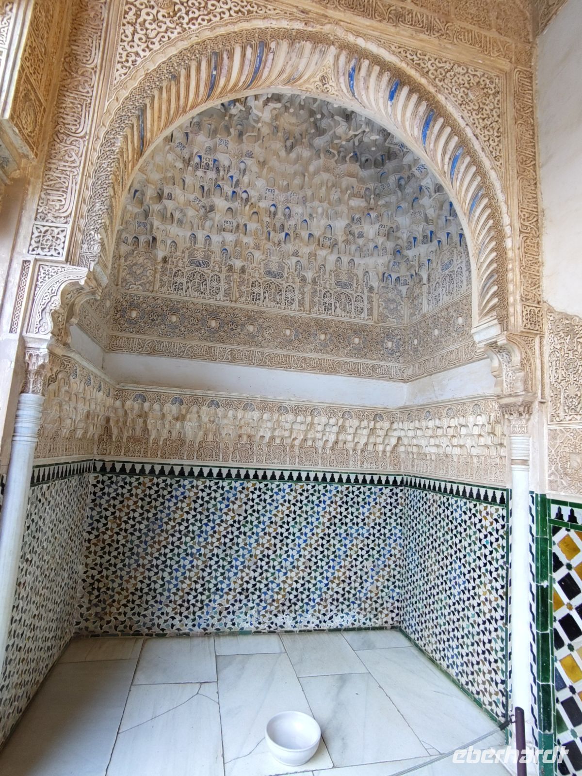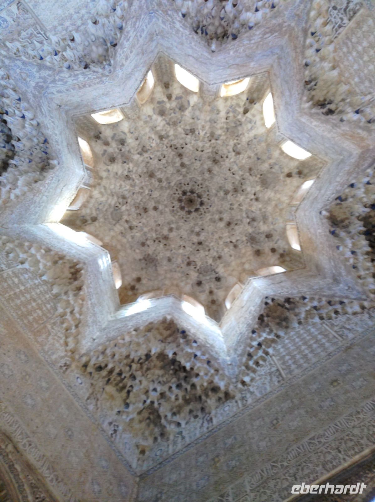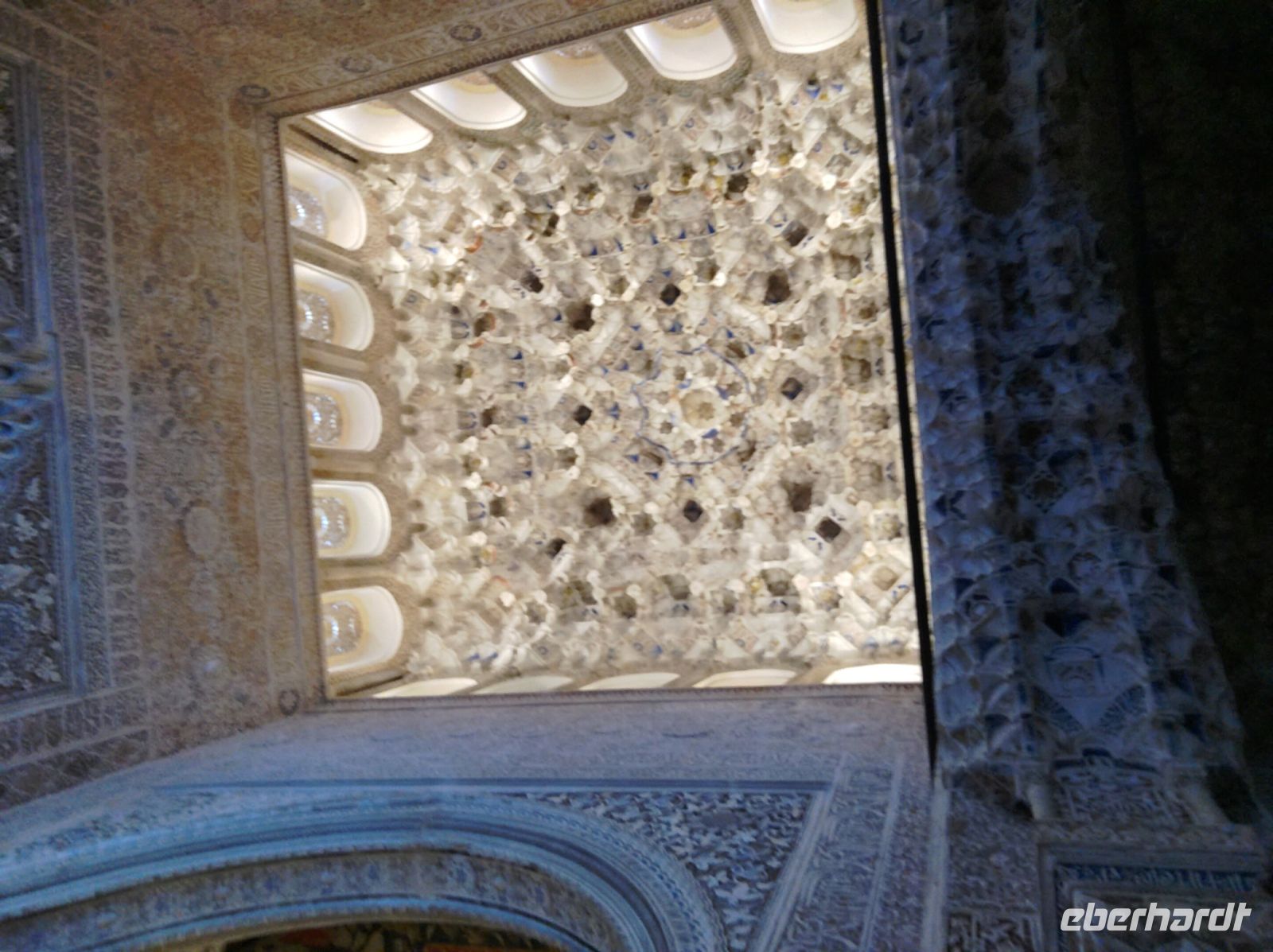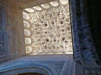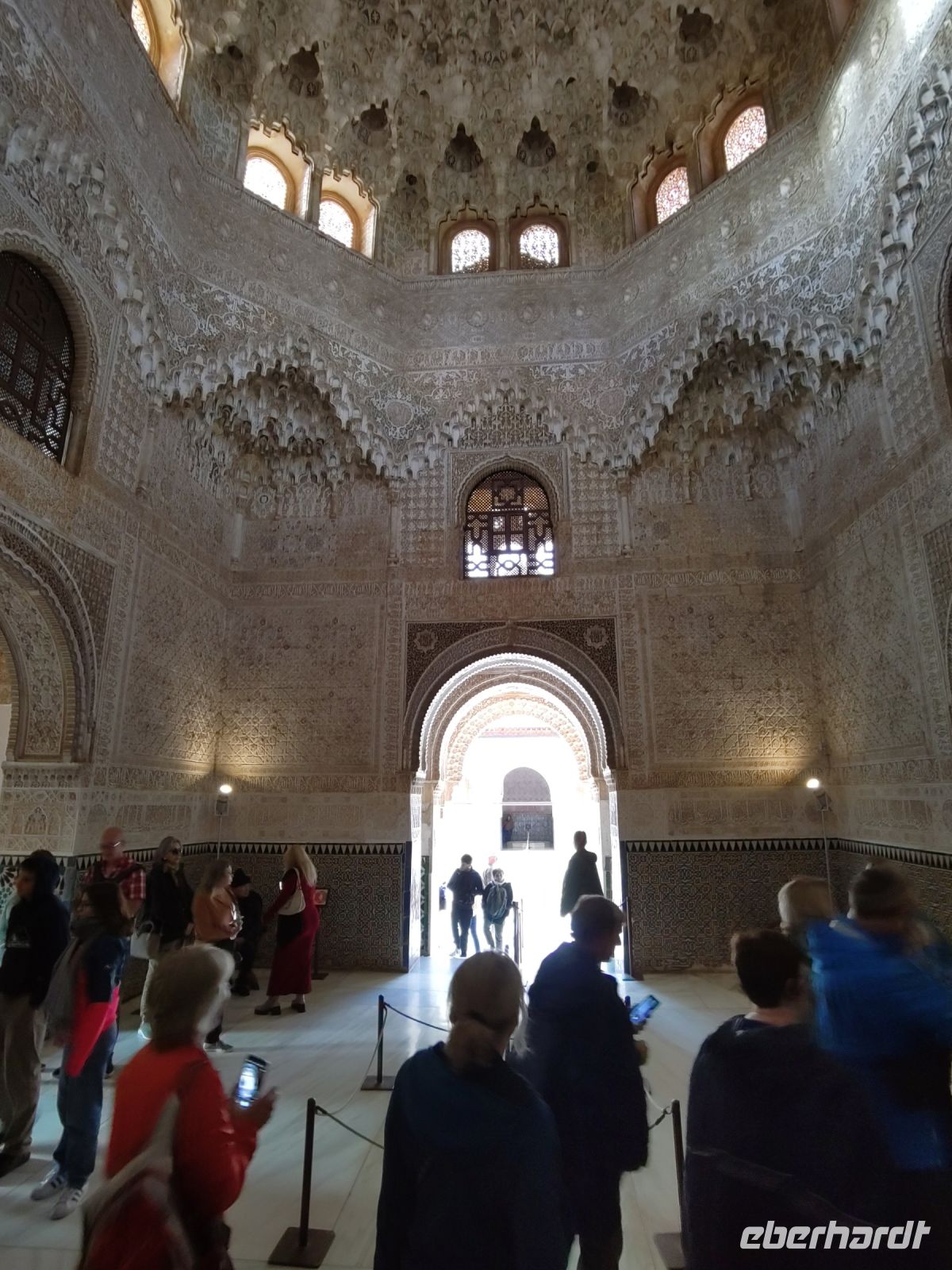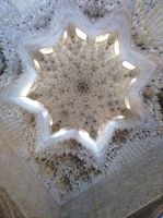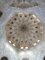 Im Torre de Comares betreten wir den Thronsaal und Pedro erklärt er uns die Darstellung an den Wänden, die Suren und Gedichte, die in Stuck gegossenen Gärten und die im Koran beschriebenen sieben Himmel an der Decke. Und wir haben Glück: Da wir recht früh dran sind, sind noch relativ wenige Leute hier.