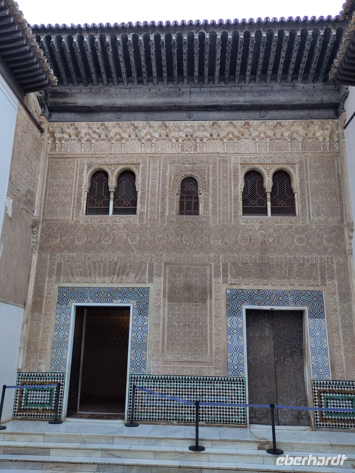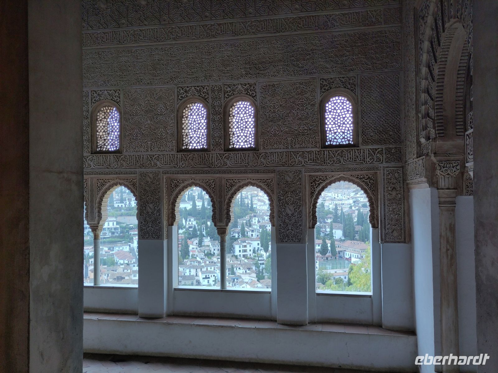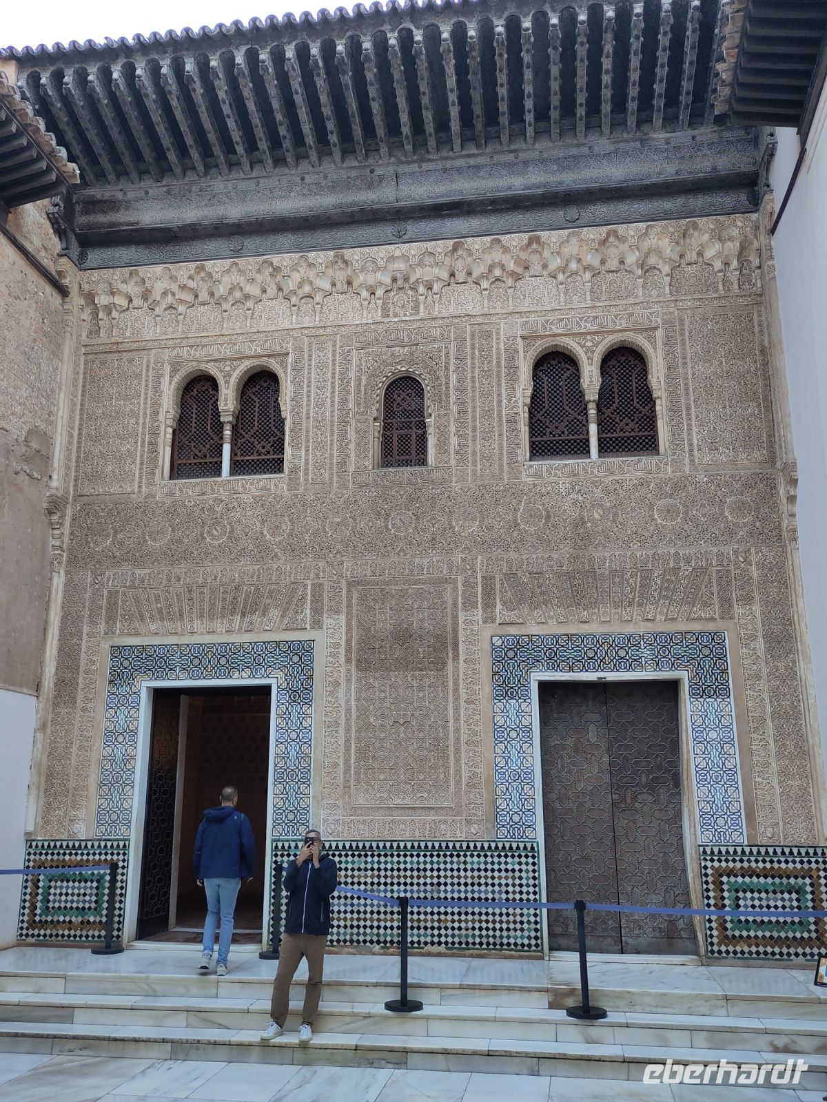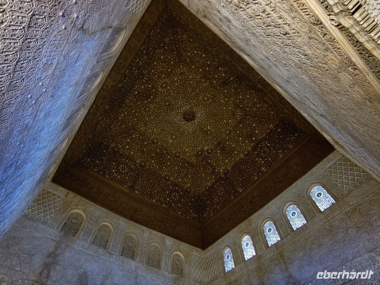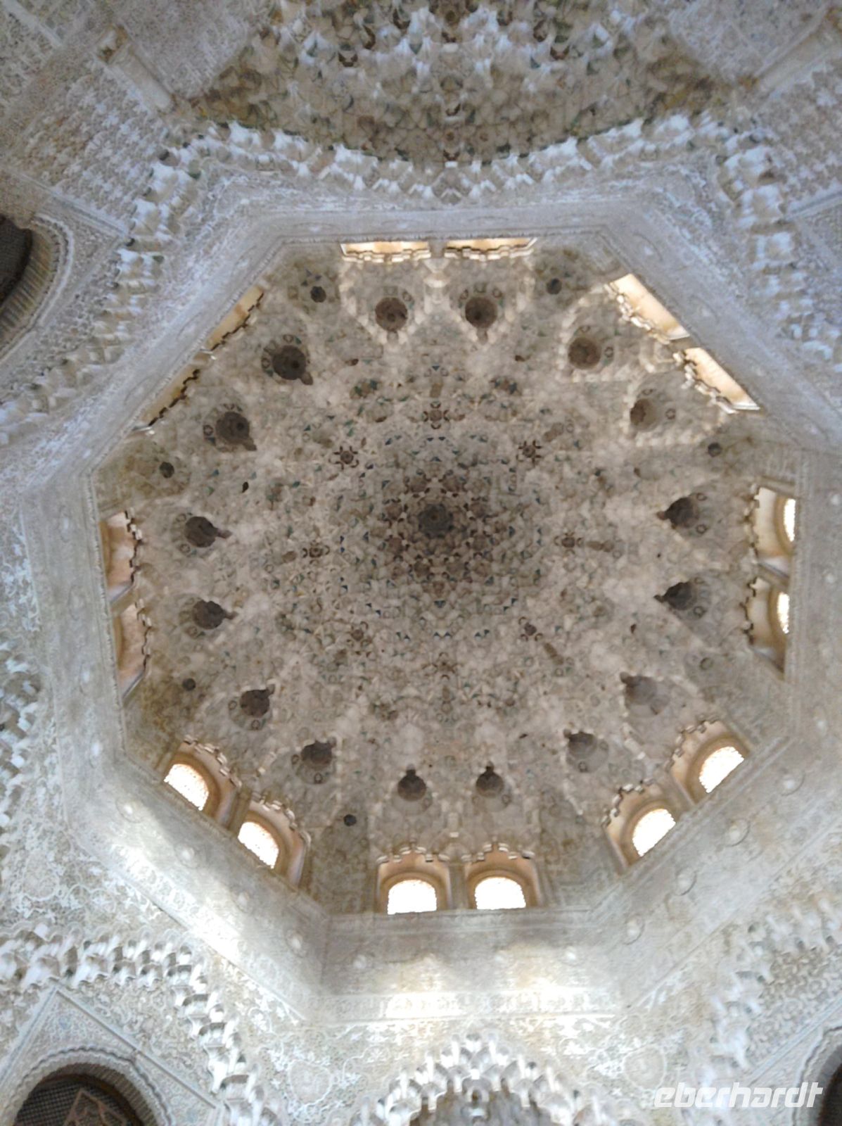 Im Torre de Comares betreten wir den Thronsaal und Pedro erklärt er uns die Darstellung an den Wänden, die Suren und Gedichte, die in Stuck gegossenen Gärten und die im Koran beschriebenen sieben Himmel an der Decke. Und wir haben Glück: Da wir recht früh dran sind, sind noch relativ wenige Leute hier.
