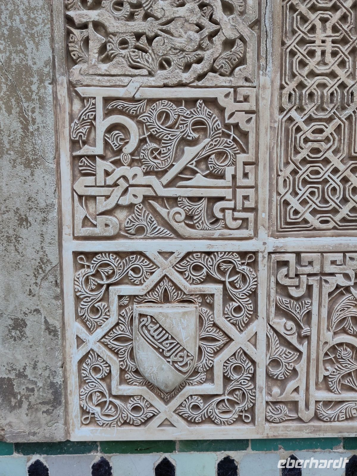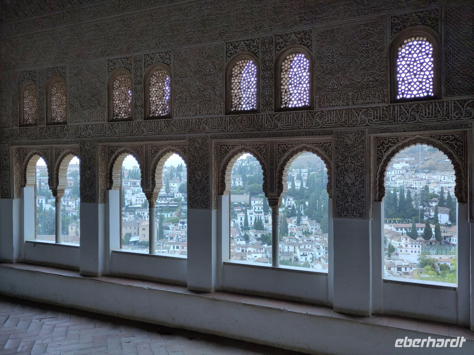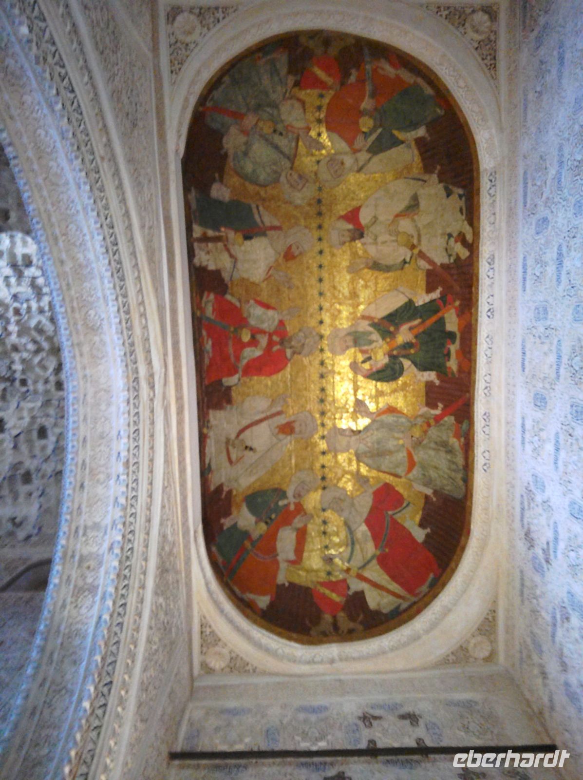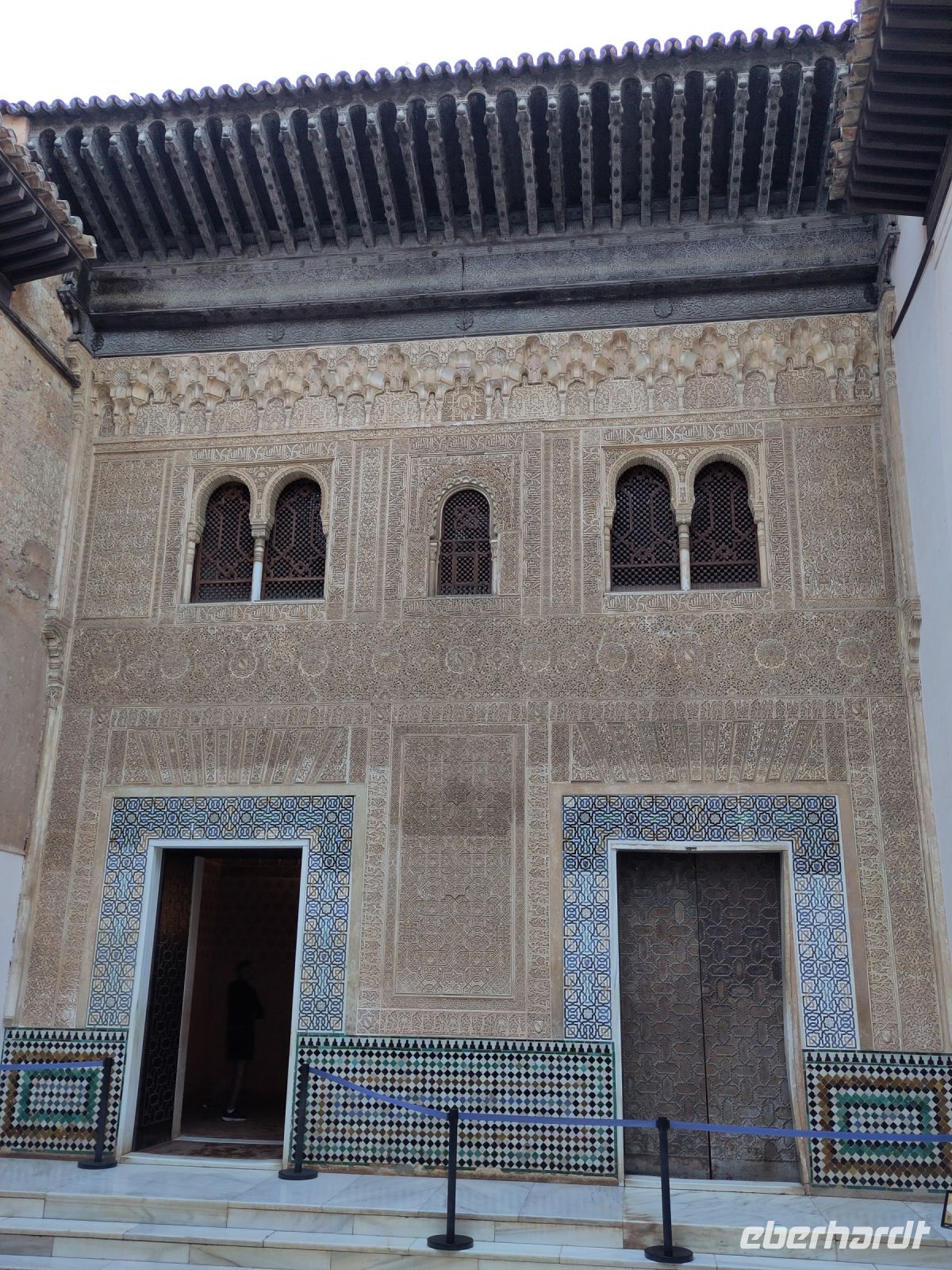 Im Torre de Comares betreten wir den Thronsaal und Pedro erklärt er uns die Darstellung an den Wänden, die Suren und Gedichte, die in Stuck gegossenen Gärten und die im Koran beschriebenen sieben Himmel an der Decke. Und wir haben Glück: Da wir recht früh dran sind, sind noch relativ wenige Leute hier.