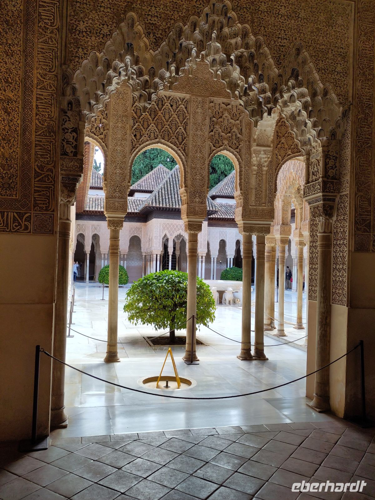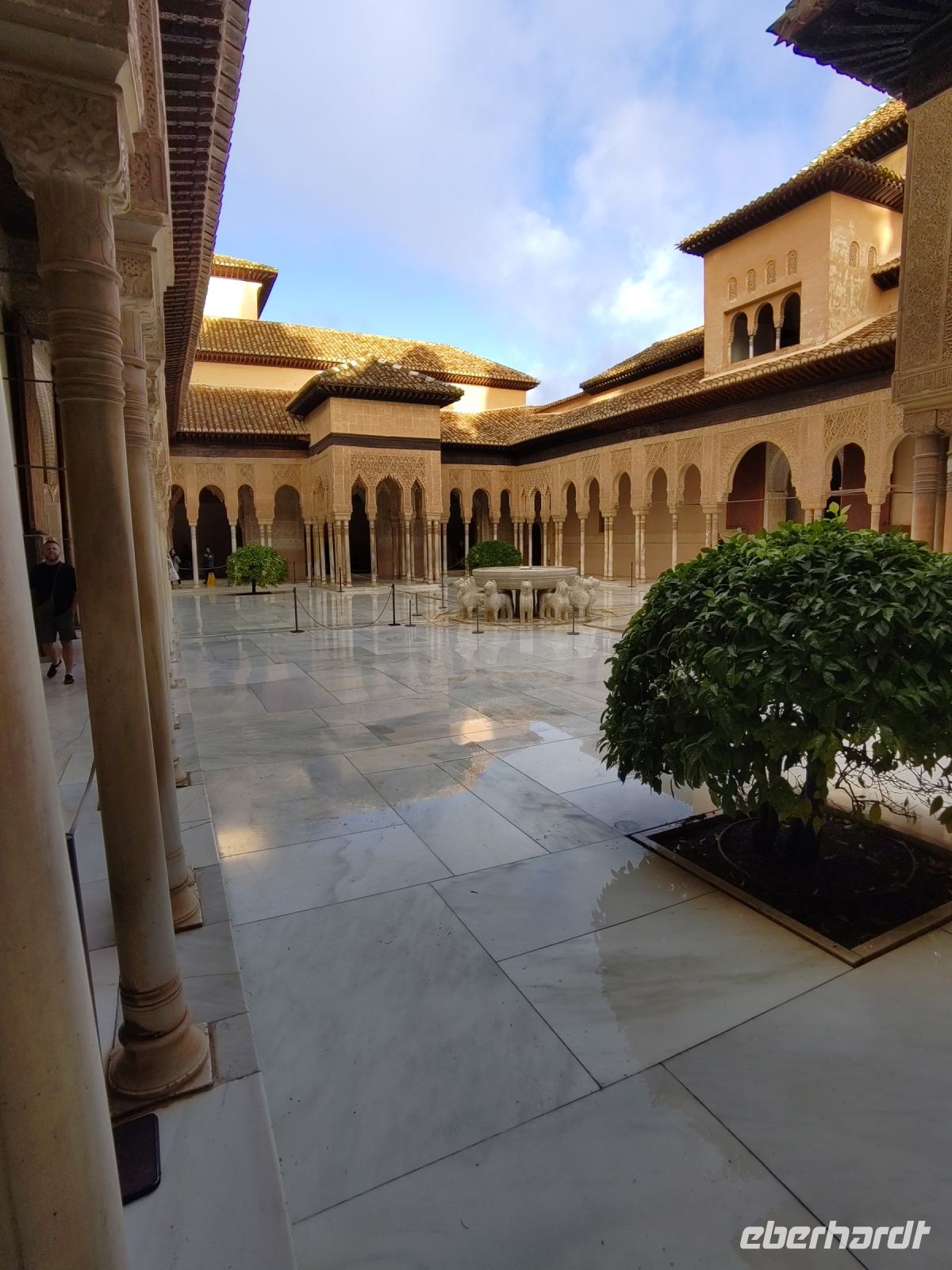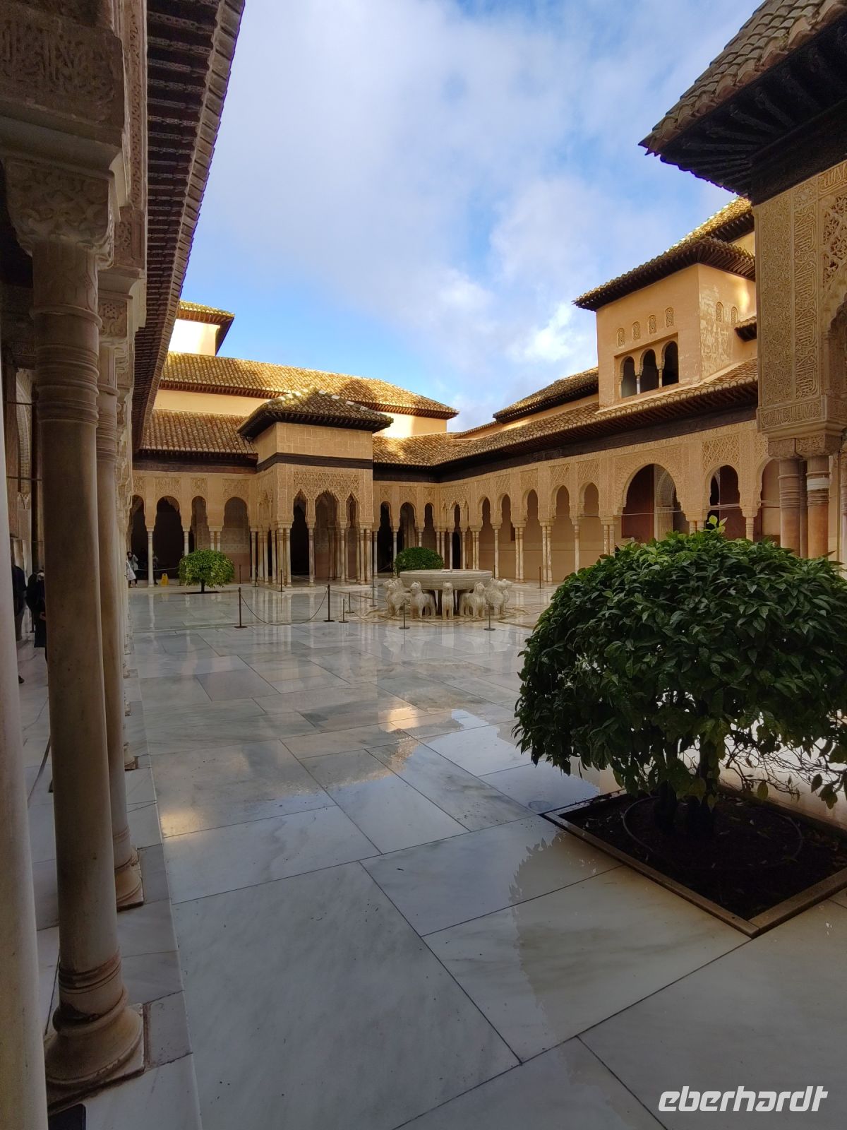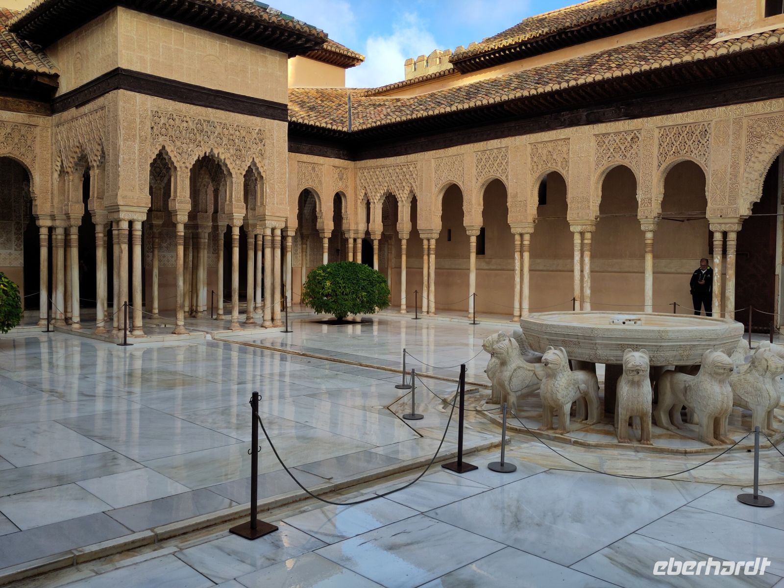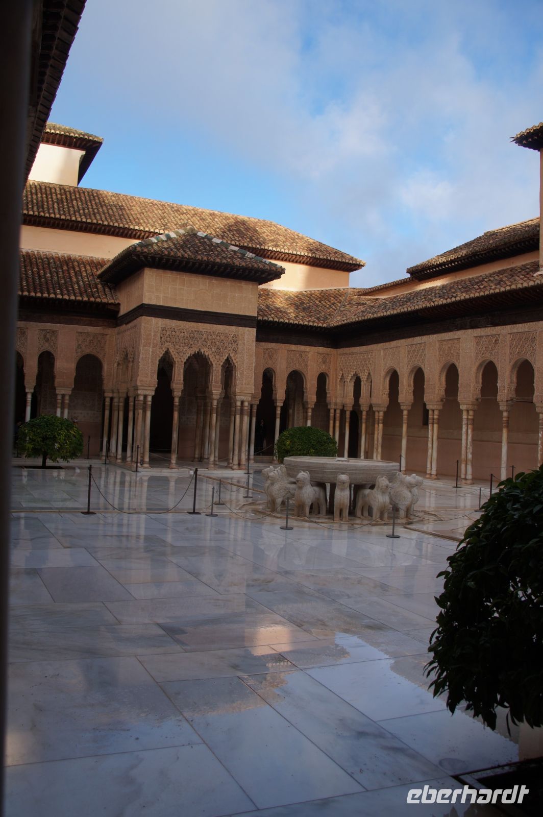 Dann gehen wir in die Paläste. Wir sehen den Mexuar, eigentlich eine Art Kanzlei, die aber in christlicher Zeit in eine Kapelle umgewandelt wurde und laufen nun von Hof zu Hof. Im Patio de Arrayanes (dem Myrtenhof) sehen wir natürlich die Spiegelung des Torre de Comares im Wasserbecken, Pedro fordert uns auf, das perfekte Foto zu schießen.