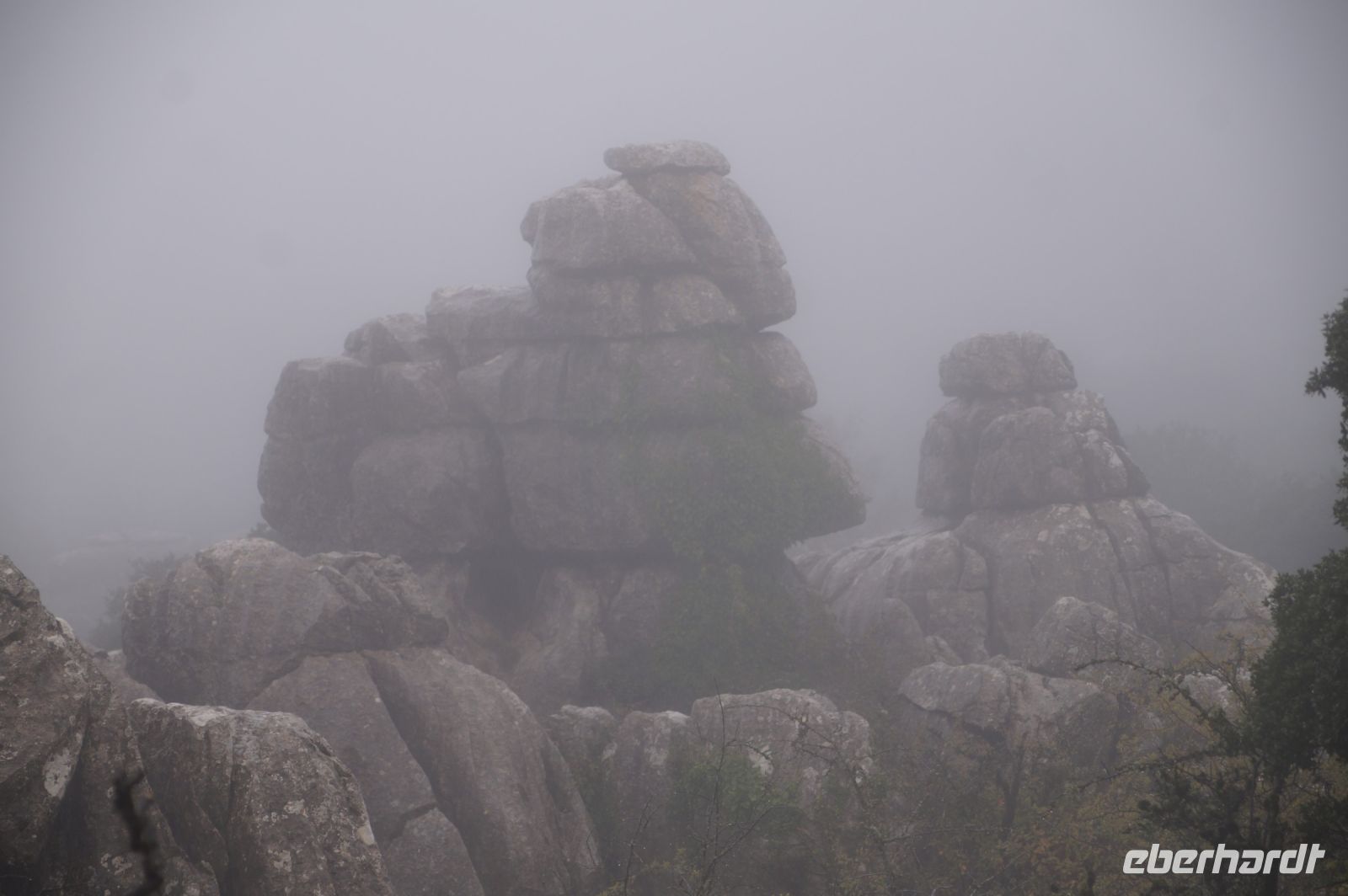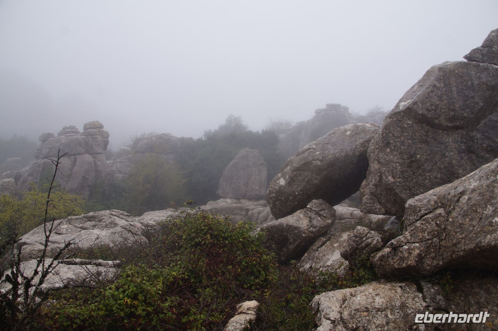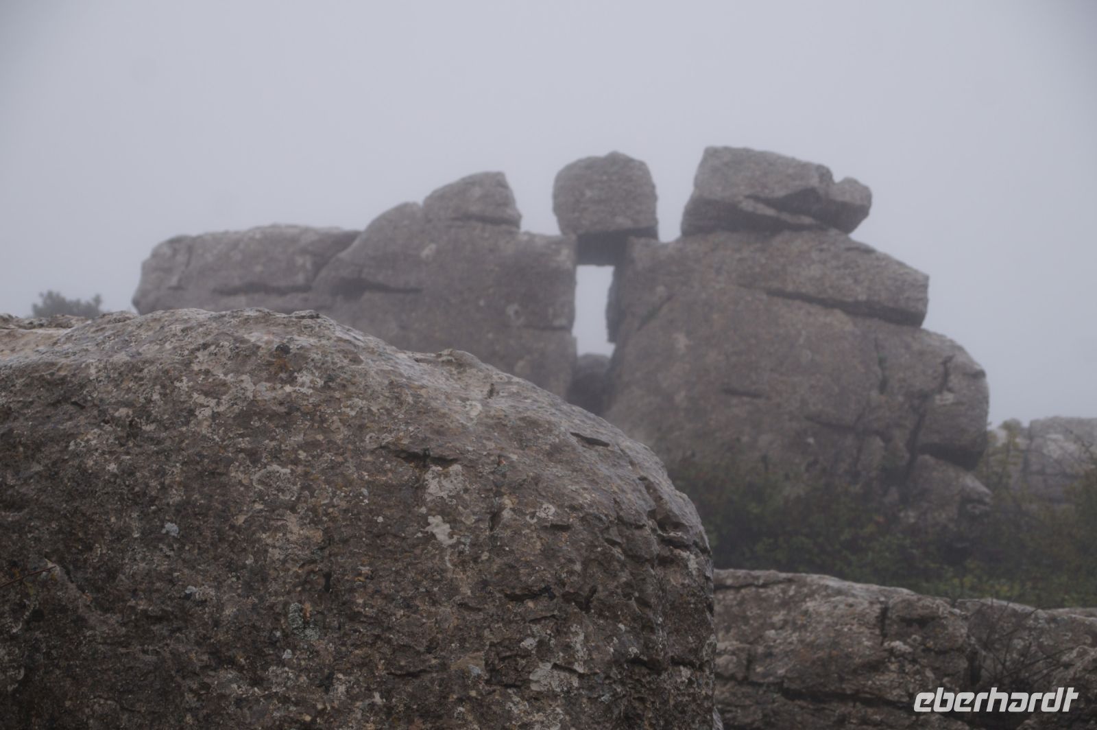 Wir - die, die Lust haben - laufen im Nebel die orangene Route zum Tornillo, dem Wahrzeichen des Torcal und sehen zwei Ammoniten, dann fahren wir nach Antequera.