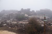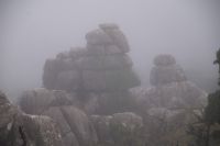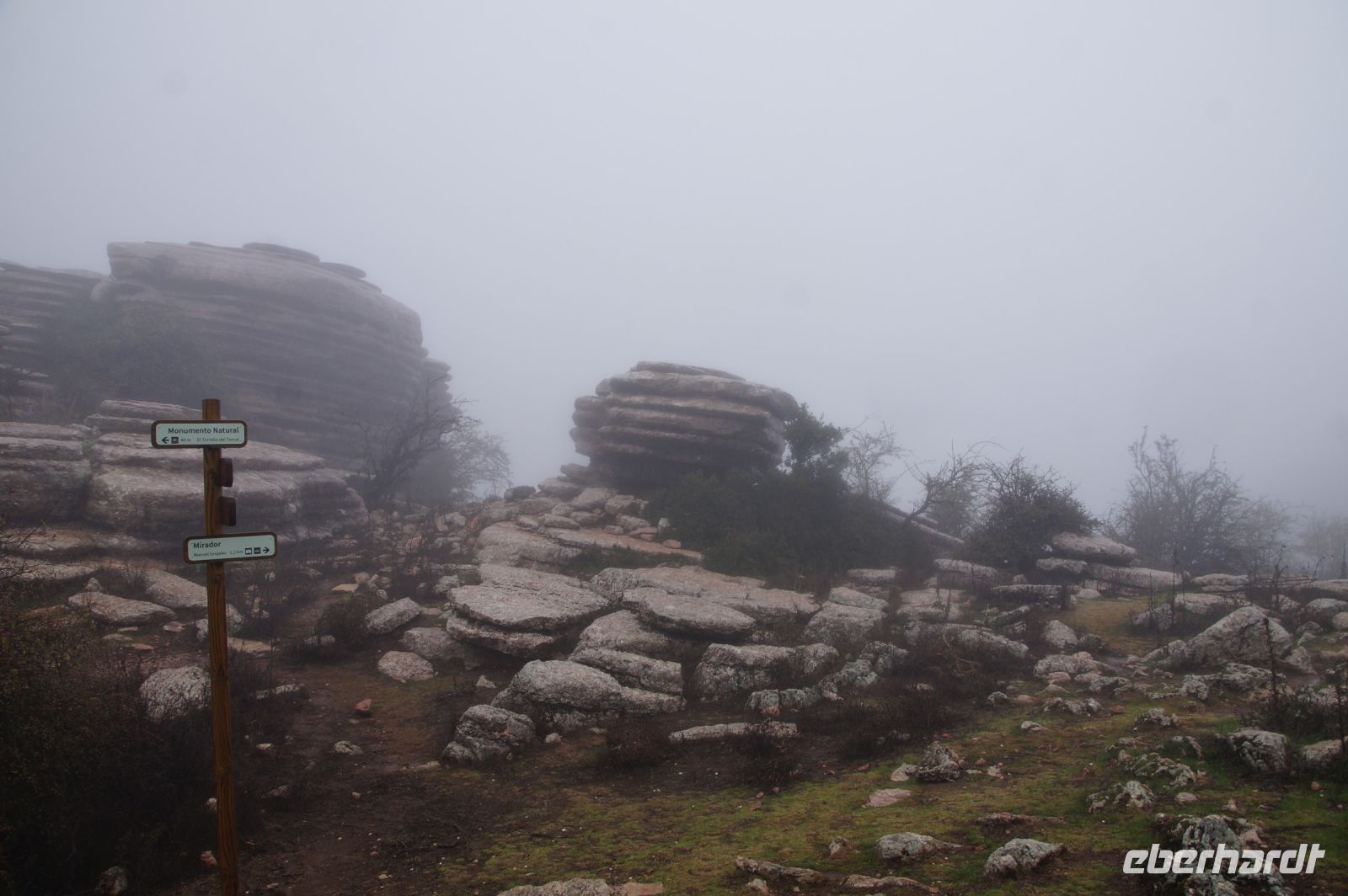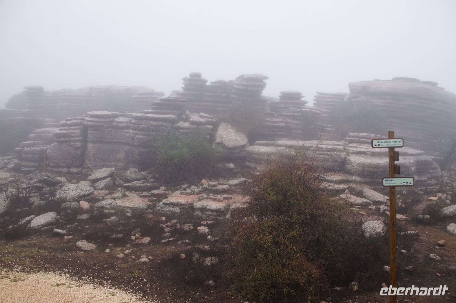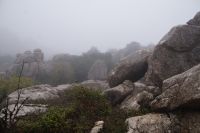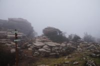 Wir verlassen den Cortijo Salinas gut gelaunt, denn für heute sind kaum noch Regenfälle angesagt. Auch der Regenradar für den Torcal de Antequera sagt, dass alles gut sei. Aber bereits lange bevor wir da sind, sehe ich, dass der Torcal in einer dichten Wolke hängt. Die leiste Hoffnung, dass die Wolke vielleicht niedriger ist, als der- Felsengarten zerschlägt sich bei der Ankunft. Teilweise können wir auf der Straße kaum zehn Meter weit schauen, oben kaum mehr als 50 Meter. Im Empfangszentrum bietet man uns einen Film zu schauen an, von einer Wanderung auf der gelben Route rät man uns ab: die Steine sind aufgrund des Regens - ja, entgegen des Regenradars regnet es - zu rutschig.