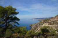 Sie kämpft sich weitgehend selbständig aus dem Dornbusch heraus und muss fast genötigt werden, sich erstmal hinzusetzen. Dabei weint sie vor Schmerz, entschuldigt sich dafür. dass sie weint und macht gleichzeitig Witze. Am liebsten will sie keine Hilfe, aber ihr müssen Dornen aus Armen und Beinen gezogen werden. Zum Glück hat sie keine Blessuren im Gesicht. Und es ist auch nichts gebrochen, aber für heute hat sie erst Mal genug. Nichtsdestotrotz müssen wir weiter, wir sind mitten im Gelände. Jetzt beginnt ein relativ steiler Abstieg (37 %), dann kommen wir durch einen Kiefernwald und sind fast am Strand von Cantarriján. Hier gibt es eine Abzweigung in Richtung der Cala de Cañuelo. Wie sollen wir weiter vorgehen? Die Gruppe entscheidet unter dem Eindruck von Simones Blessuren, den nahen Cantarriján-Strand anzusteuern, wohin auch eine Straße führt. Ich beordere Manolillo dorthin, in der Hoffnung, dass der sich in der kurvigen Straße nicht festfährt. Aber die Straße ist so eng dann doch nicht und mit dem Mikrobus geht das. Wir brechen also die Wanderung hier ab und fahren, nach einem Aufenthalt am Strand von ca. 40 Minuten zum Hotel.