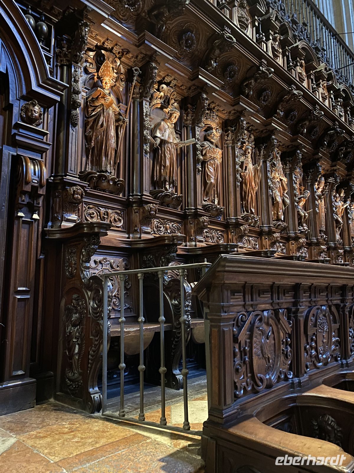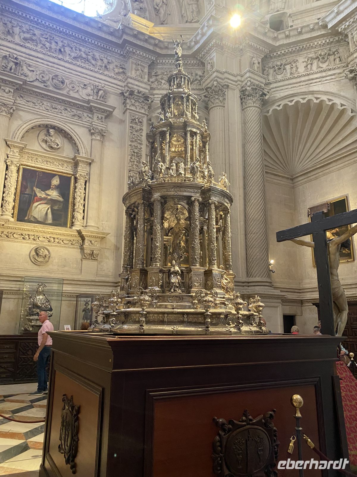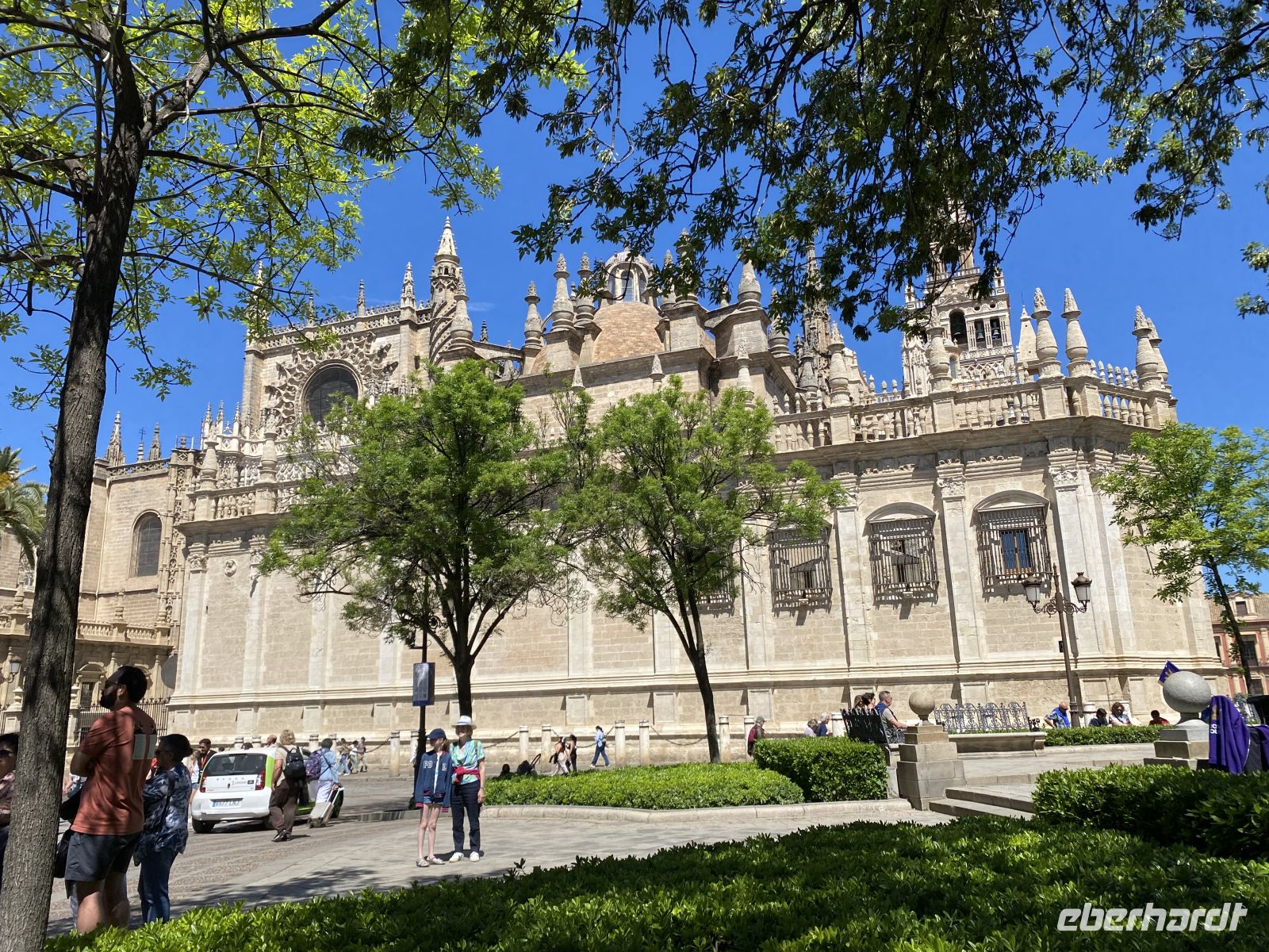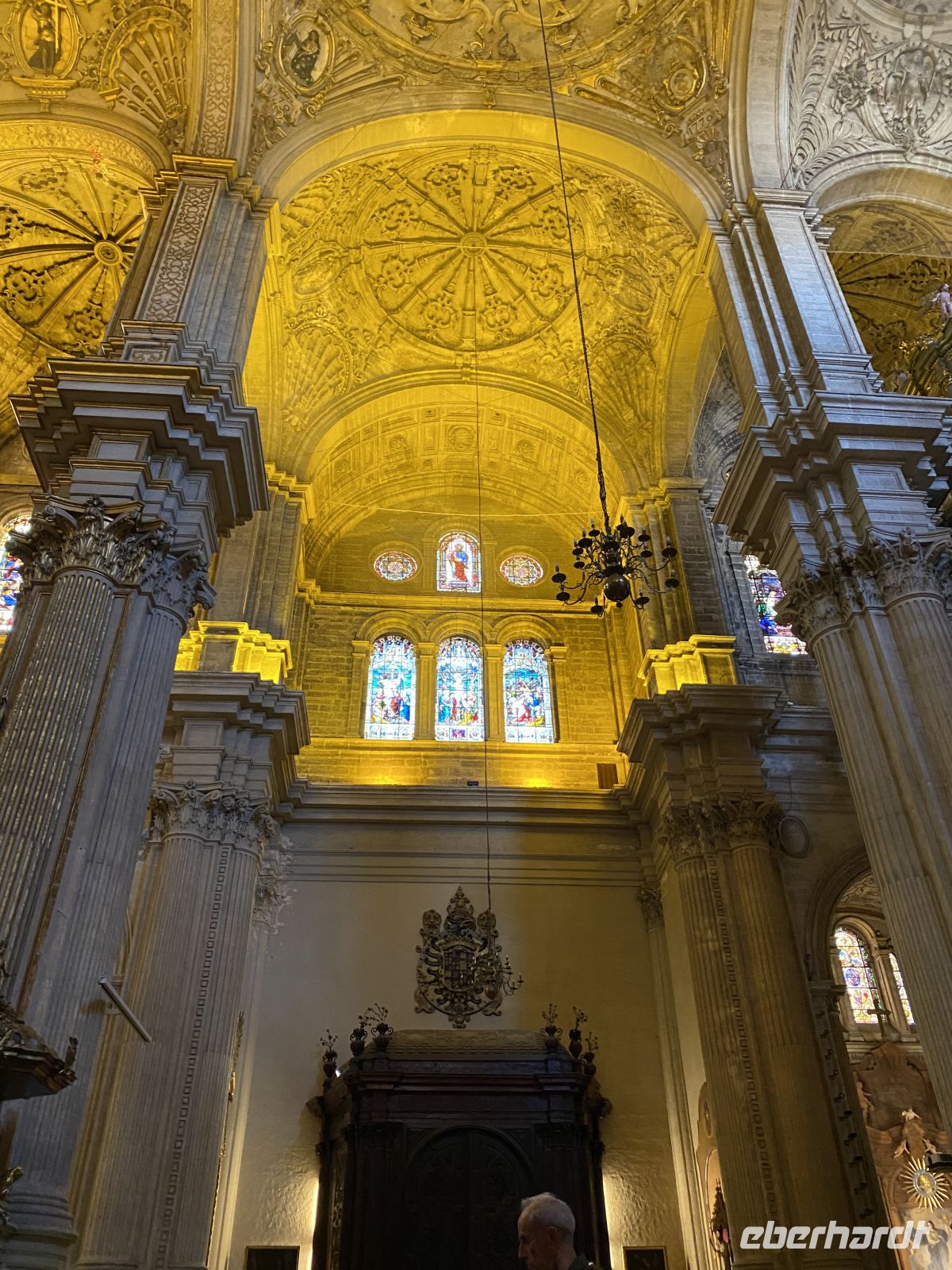 Für uns folgt nun die zweite Besichtigung und wir betreten die nahegelegene Kathedrale, die an der Stelle der Hauptmoschee im Verlaufe von 100 Jahren gebaut wurde. Mit ihren beträchtlichen Ausmaßen, sie ist 116 m lang und 76 m breit, ist sie das drittgrößte Gotteshaus der Welt. Wir betreten die Kathedrale durch die Puerta de Oriente und stehen im Innenhof, er war zur Zeit der Mauren der Ort der rituellen Waschungen vor dem Gebet in der Moschee. Der Innenraum besteht aus fünf Schiffen, sie werden überspannt von gotischen Netz- und Sterngewölben. Das Altarbild aus goldenen Reliefplatten zählt zu den größten der Welt.