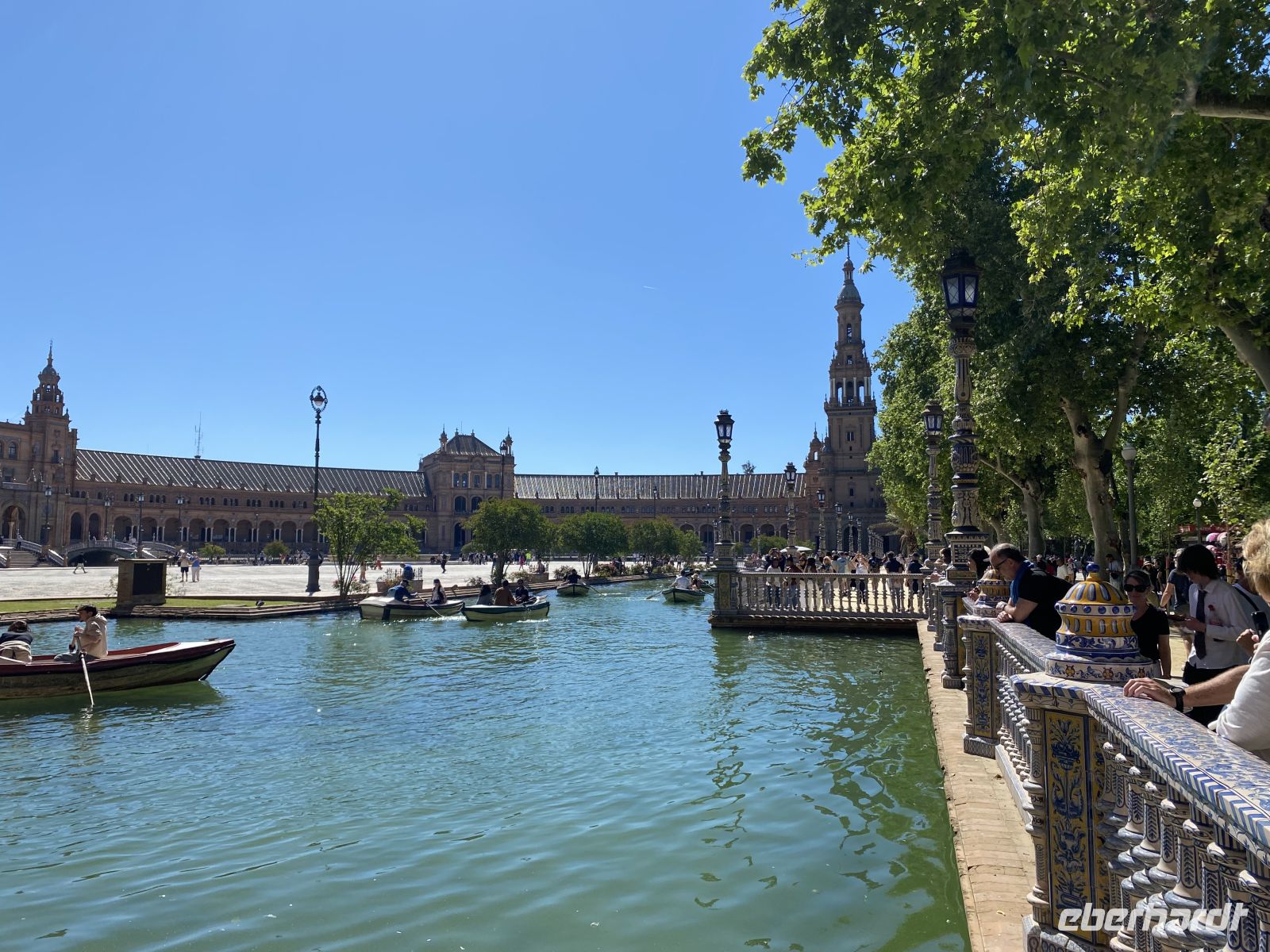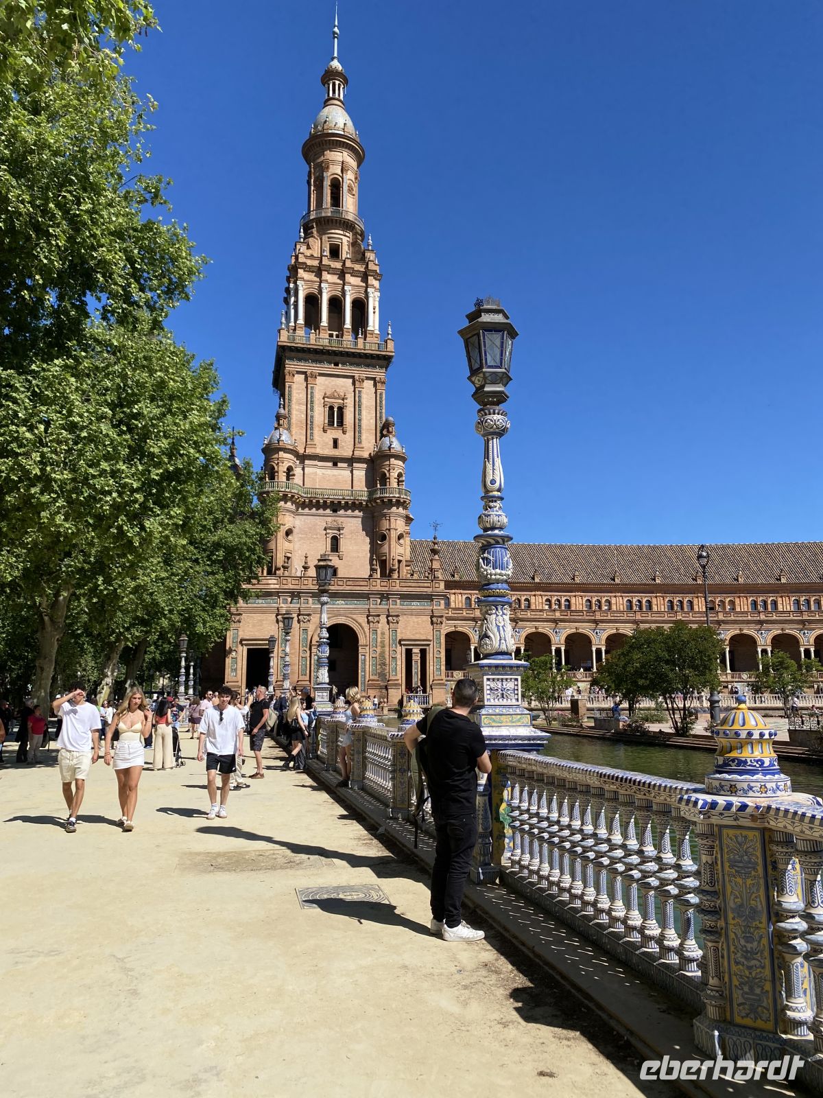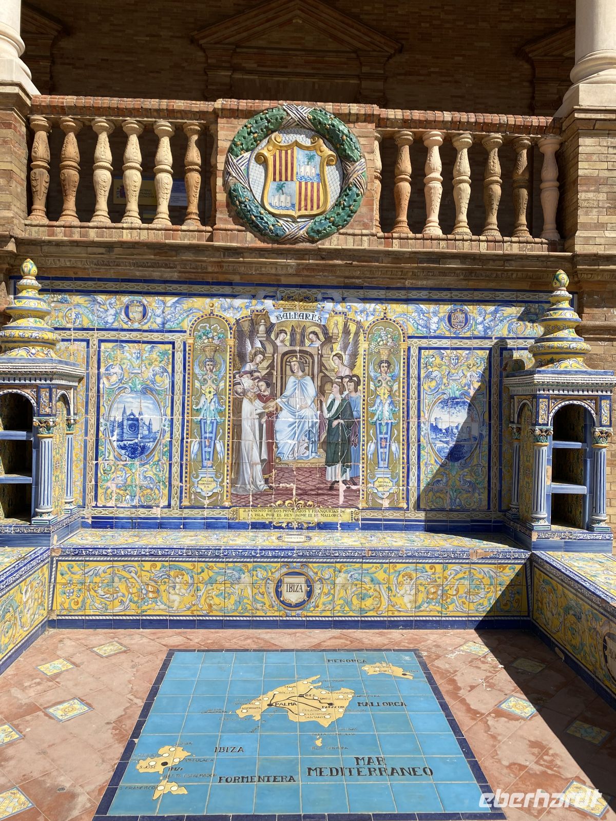 Erwartungsvoll sehen wir unserer Besichtigung in Sevilla entgegen. Wir steuern zunächst den Park Maria Luisa an, hier ist die Plaza Espana das besondere Highlight. Im Jahre 1929 wurde dieser Platz für die Ibero - Amerikanische Ausstellung gestaltet. Der halbrunde Gebäudekomplex des Architekten Anibal Gonzales erinnert mit seine Materialien wie Ziegel, Marmor und farbenfrohe Keramik an die maurischen Traditionen. In den Nischen der zwei- bis dreigeschossigen Gebäude sind auf den Kacheln alle spanischen Provinzen mit einem Ereignis aus ihrer Geschichte vertreten. Ein kleiner Wasserlauf verleiht dem Ganzen Leichtigkeit und Schwung.