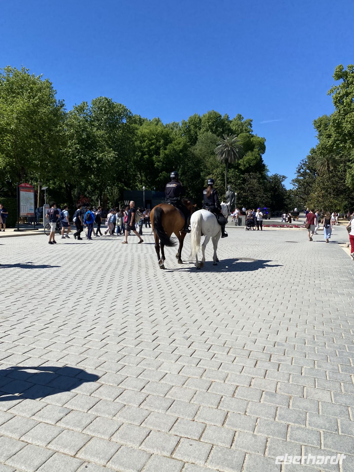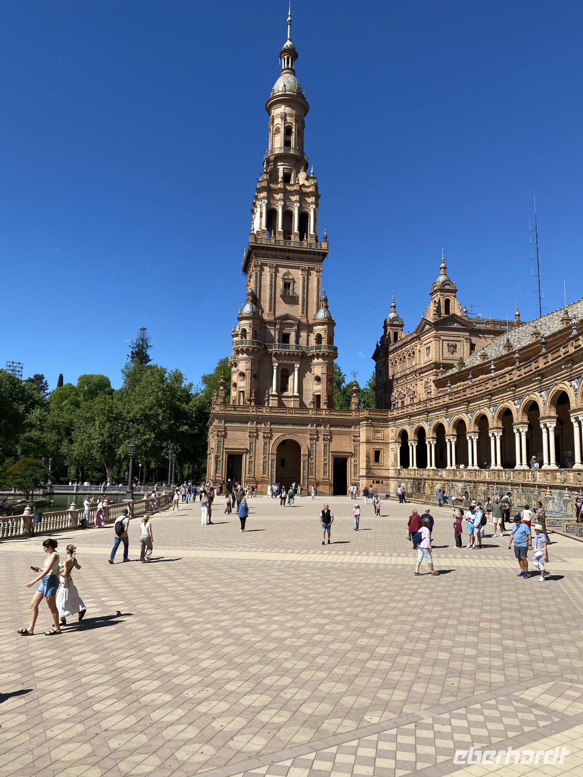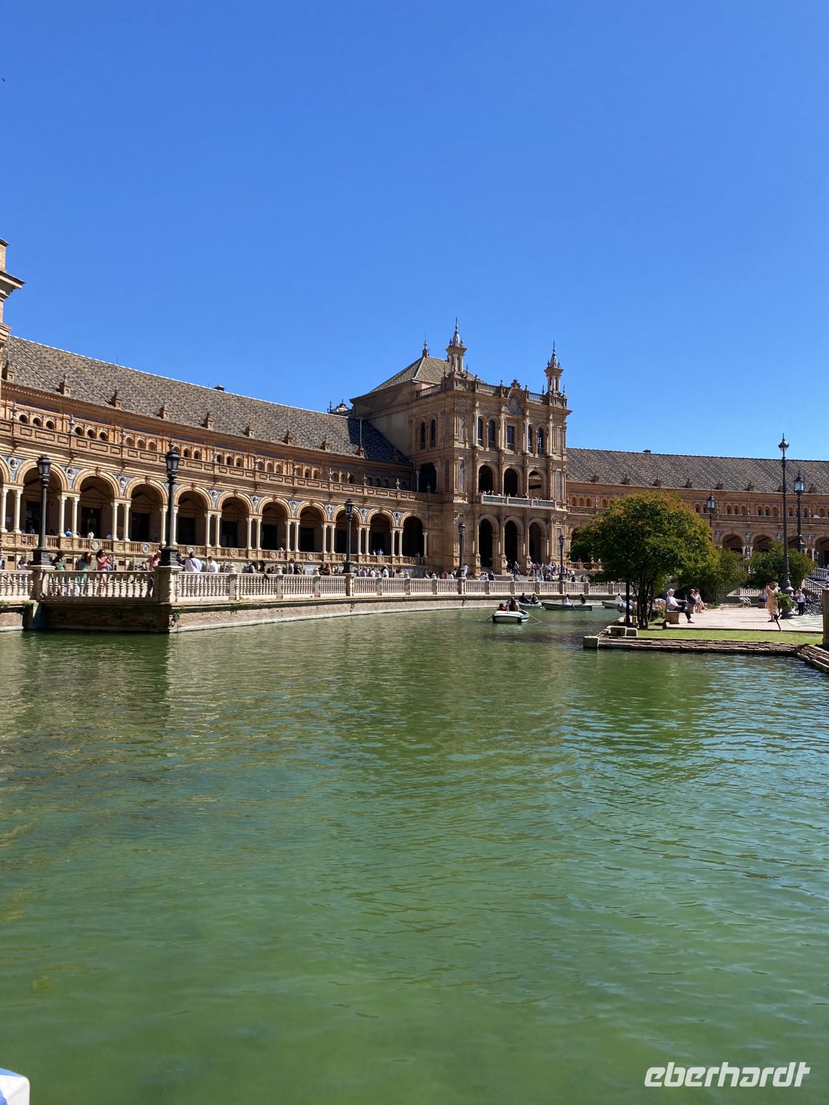 Erwartungsvoll sehen wir unserer Besichtigung in Sevilla entgegen. Wir steuern zunächst den Park Maria Luisa an, hier ist die Plaza Espana das besondere Highlight. Im Jahre 1929 wurde dieser Platz für die Ibero - Amerikanische Ausstellung gestaltet. Der halbrunde Gebäudekomplex des Architekten Anibal Gonzales erinnert mit seine Materialien wie Ziegel, Marmor und farbenfrohe Keramik an die maurischen Traditionen. In den Nischen der zwei- bis dreigeschossigen Gebäude sind auf den Kacheln alle spanischen Provinzen mit einem Ereignis aus ihrer Geschichte vertreten. Ein kleiner Wasserlauf verleiht dem Ganzen Leichtigkeit und Schwung.