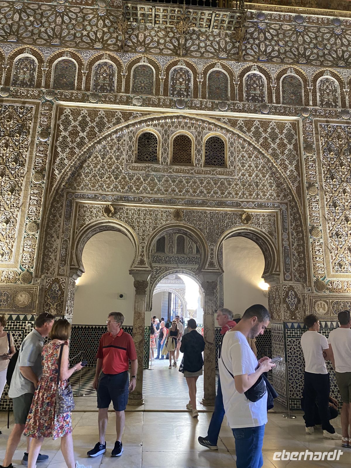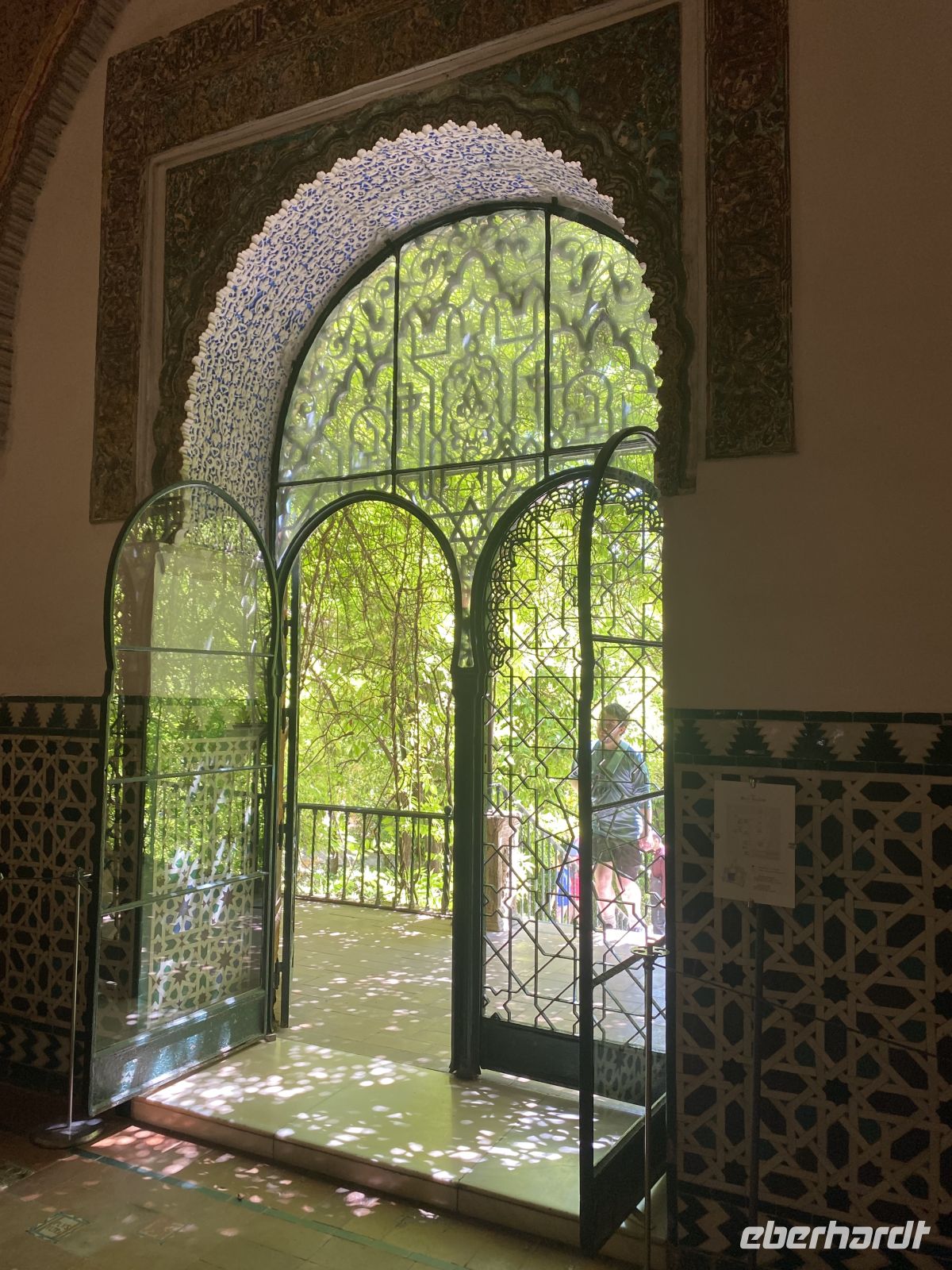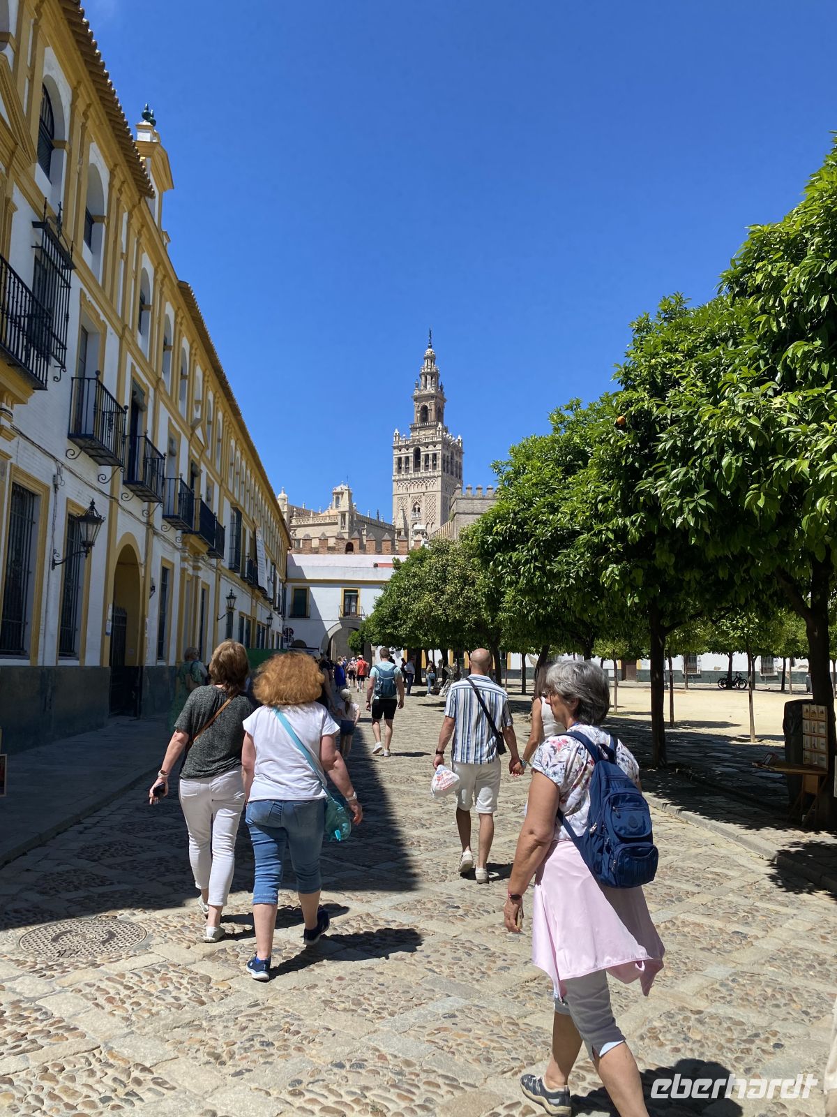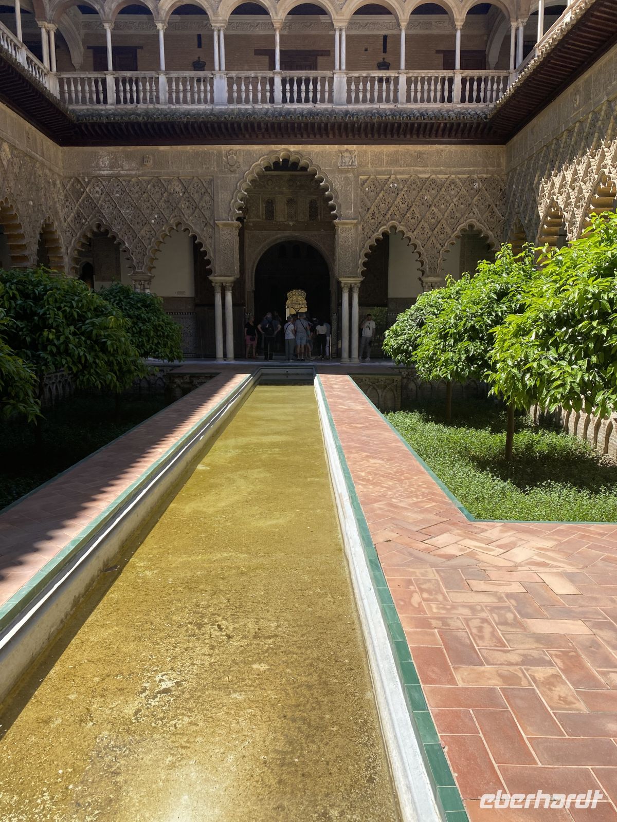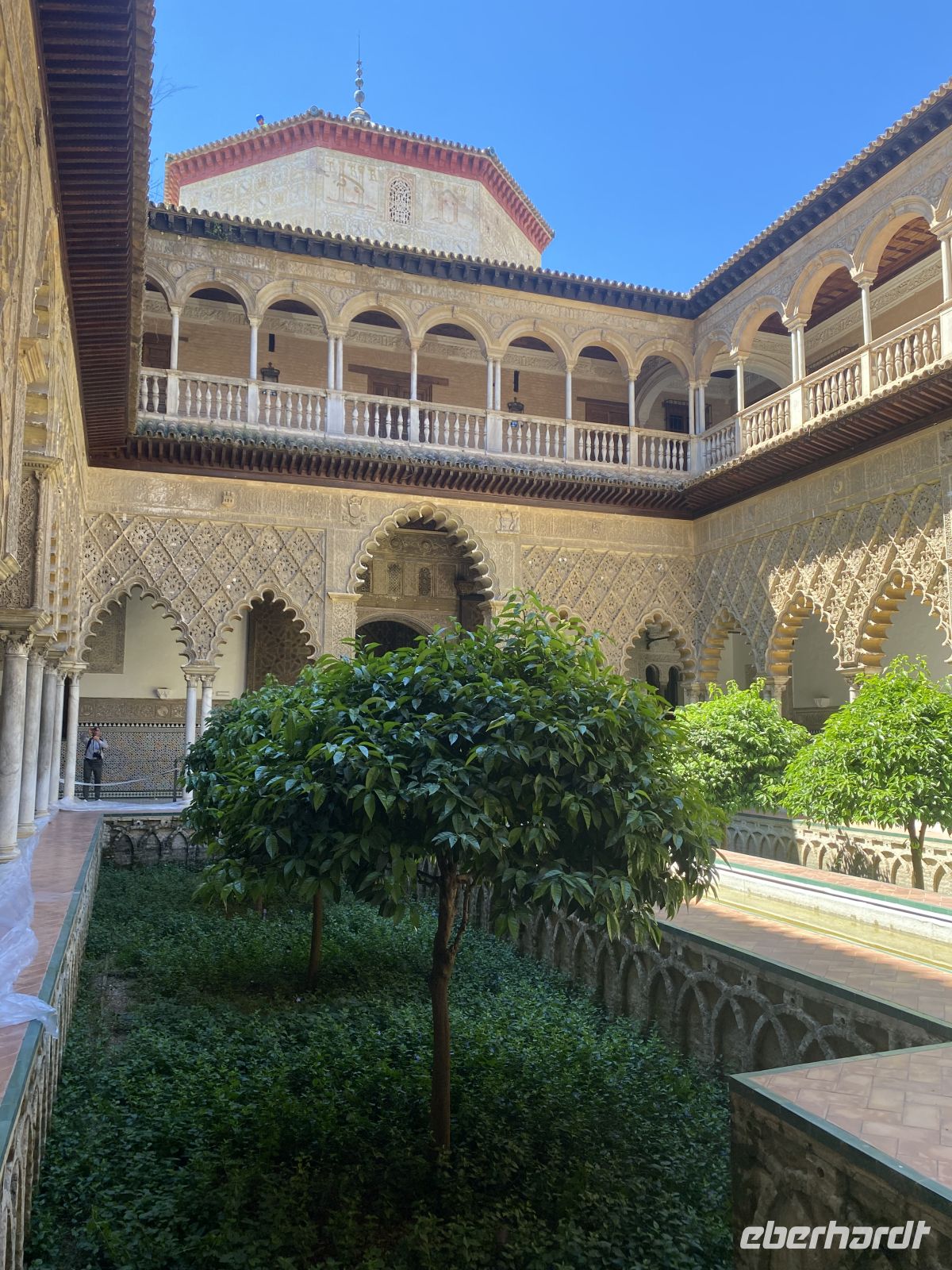 Nach einem kurzen Spaziergang durch den Park erreichen wir den Alcázar von Sevilla, am Löwentor sollen wir unseren örtlichen Reiseleiter treffen. Bis dahin ist nur wenig Freizeit - schade eigentlich in solch interessanter Stadt. Den Alcazar betreten wir durch das Löwentor und überqueren den Hof mit den Orangenbäumen. Während des Rundganges bestaunen wir die filigranen Hofarkaden und die prächtige Mudejar-Fassade des Palastes von Pedro I. Die maurischen Handwerker verliehen den Gebäuden Leichtigkeit und einen stimmigen Übergang zu den Gärten.