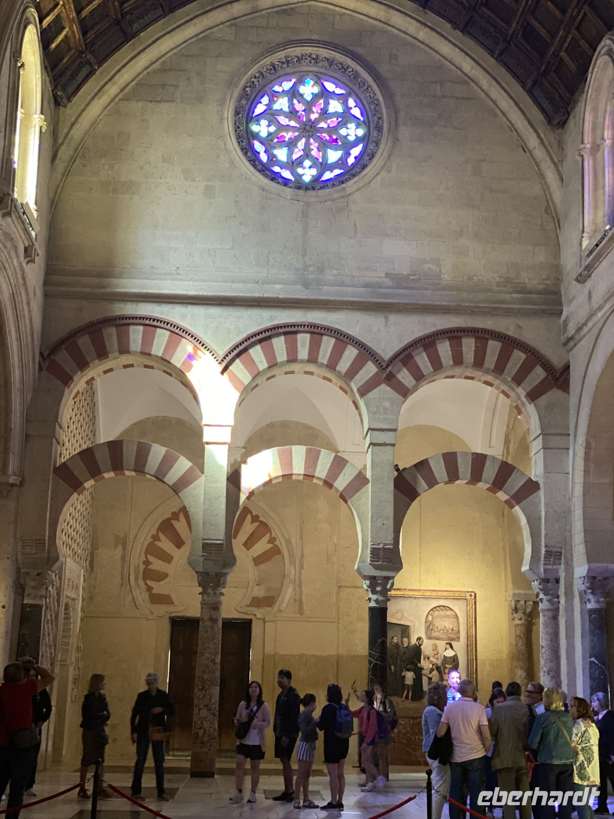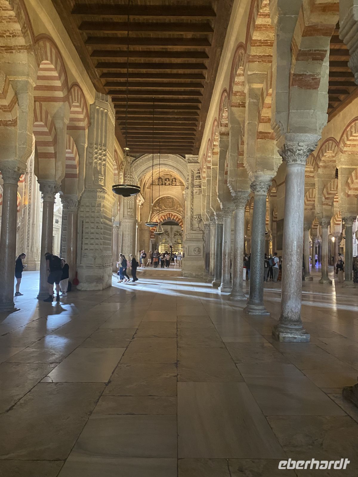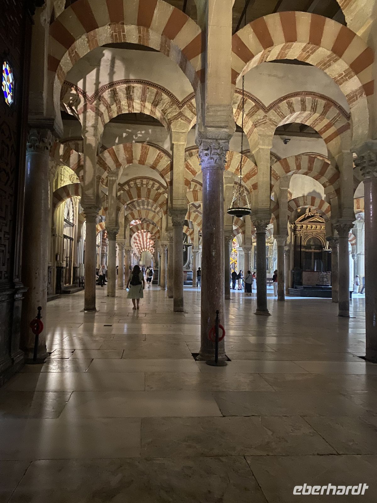 Aber nun betreten wir die Moschee und sind sofort gefangen von diesem filigranen Säulenwald und den Ausmaßen (sie ist 180 m lang und 130 m breit) und hatte Platz für 30.000 Gläubige. 856 Säule tragen das Dach des Moschee. Die Mauren errichteten die Moschee auf den Resten eines römischen Tempels und die Säulen wurden dabei gleich nachgenutzt. Die charakteristischen weiß-roten Scheitbögen geben dem Raum Höhe und Leichtigkeit sowie wechselnde Perspektiven. Besonders reich geschmückt ist die Gebetsloge des Kalifen mit farbigen Mosaiken und kufischen Schriftzeichen.