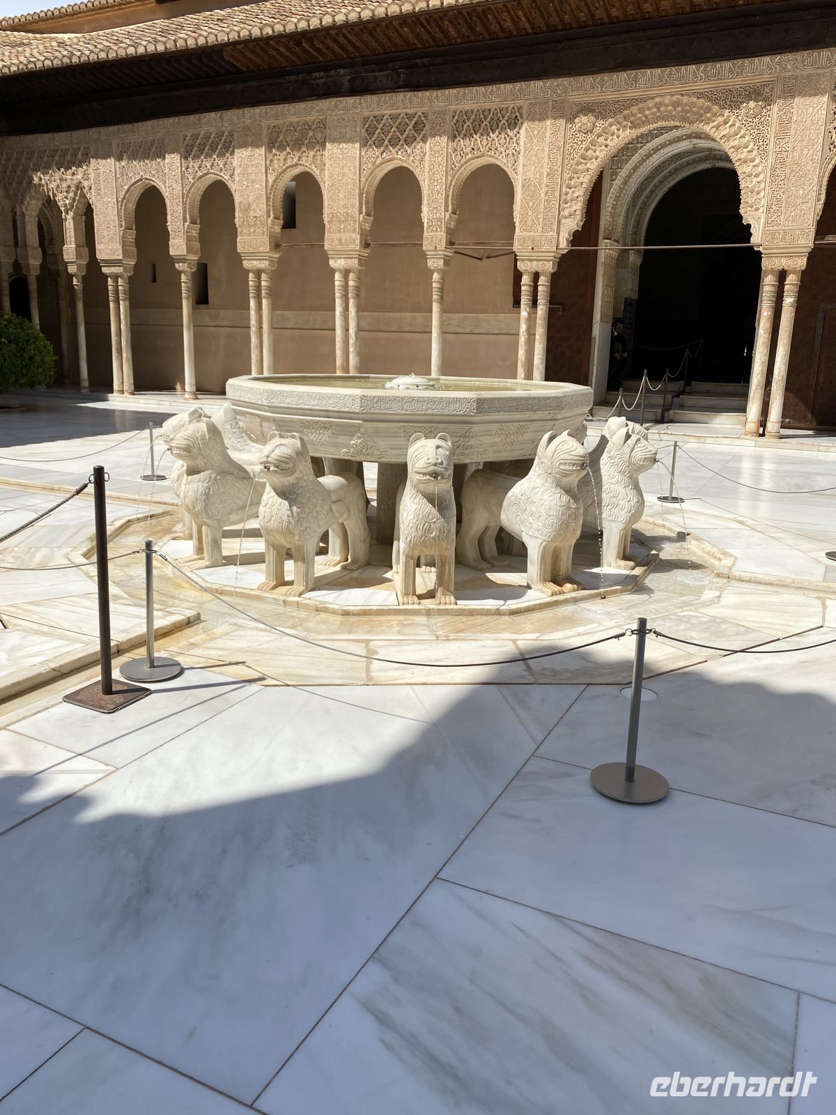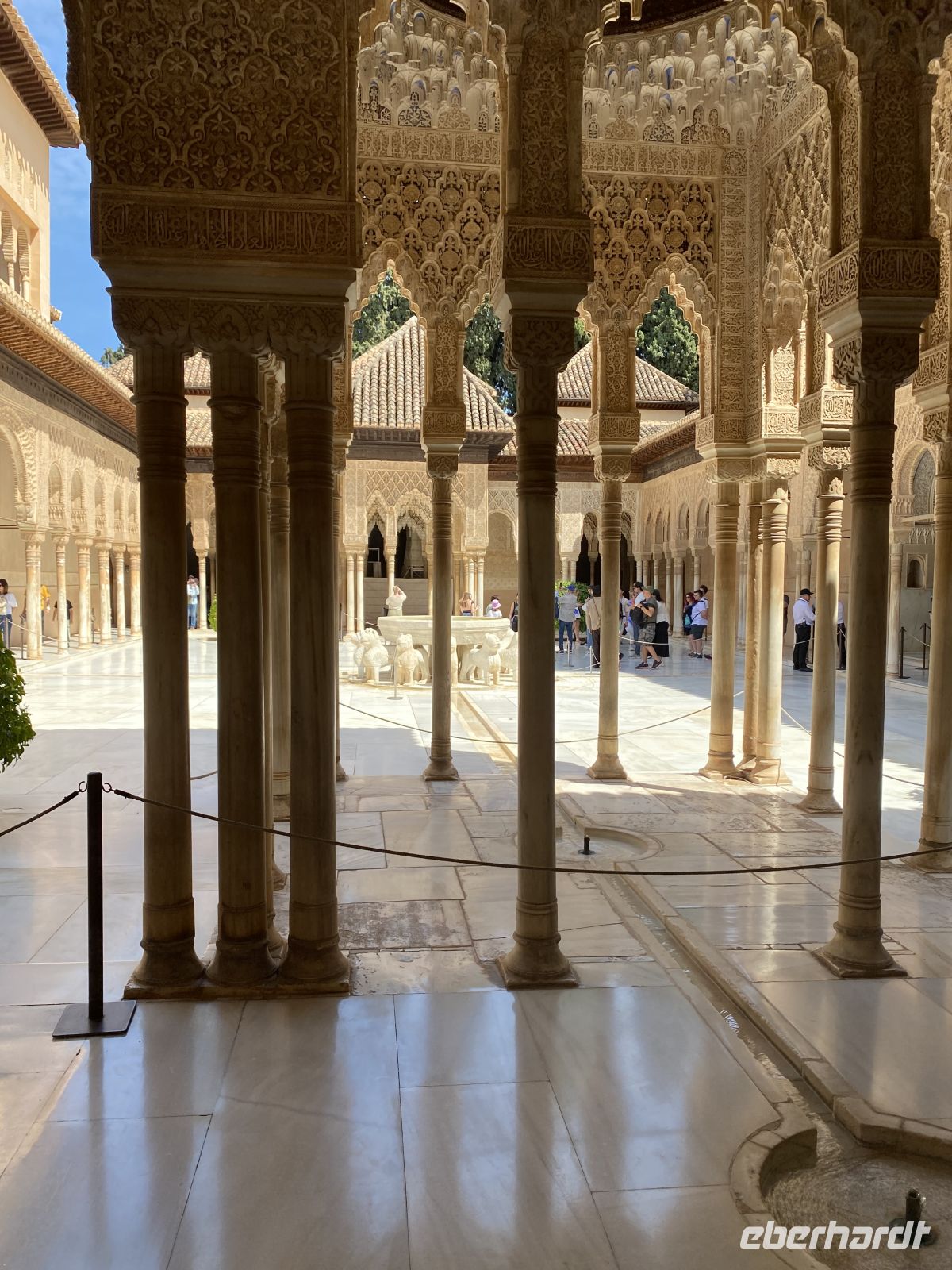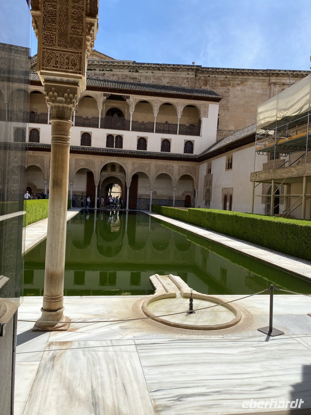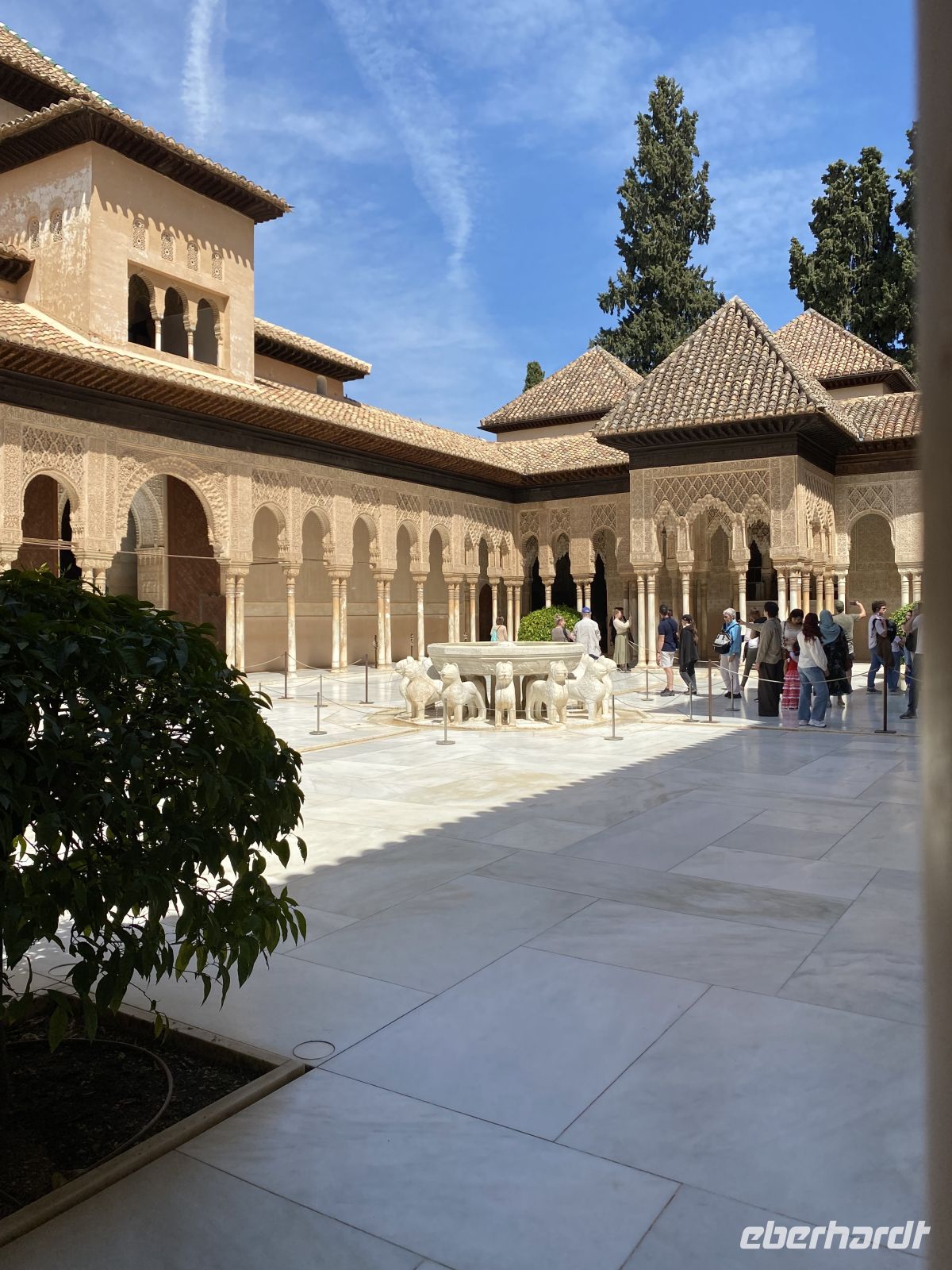 Unser Gästeführer führte uns durch die unterschiedlichen Teile der Alhambra, beginnend mit dem Palast Karls V. Im Renaissancestil erbaut, wirkt er kühl und wenig einladend, ganz im Gegensatz zum Nasridenpalast mit seinen filigranen Bögen und Mosaiken. Besonders anmutig wirken die Höfe mit ihren Wasserbecken und Pflanzen und den vielen schönen Durchblicken in die umgebende Landschaft und die Sierra Nevada. Im Löwenhof bestaunen wir nicht nur die Löwen, sondern auch die äußerst fein gestalteten Decken.