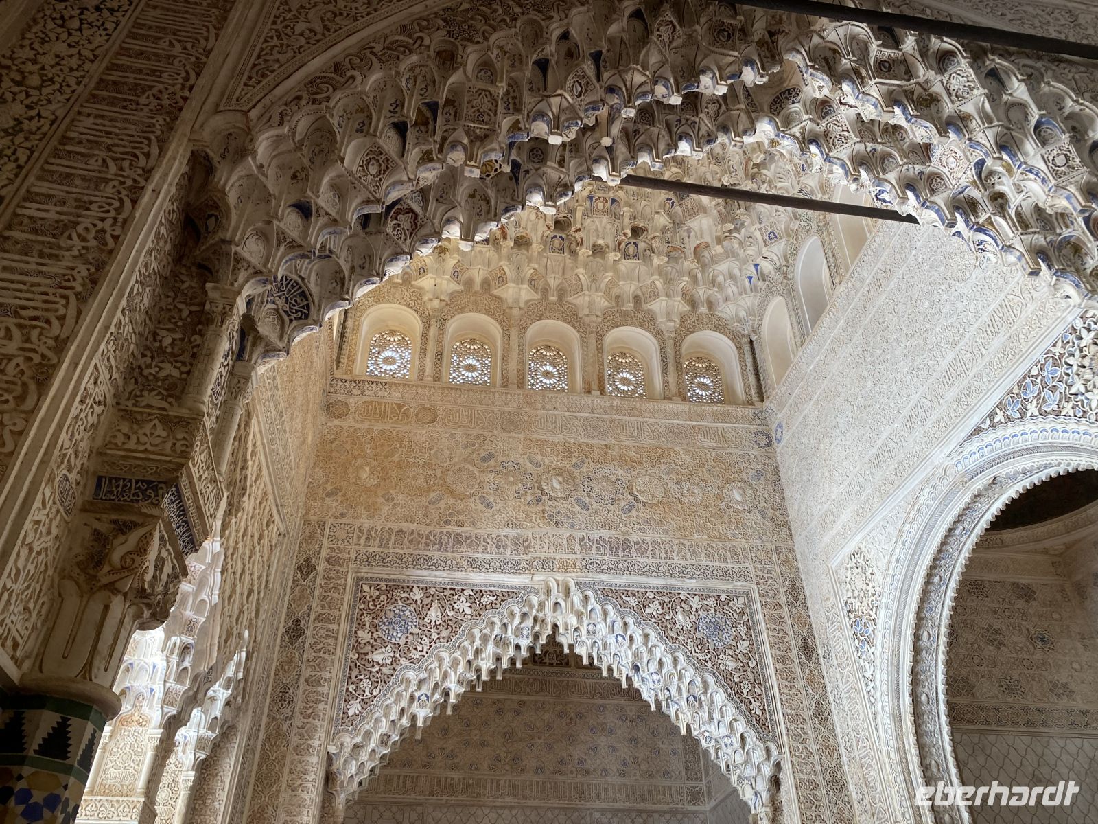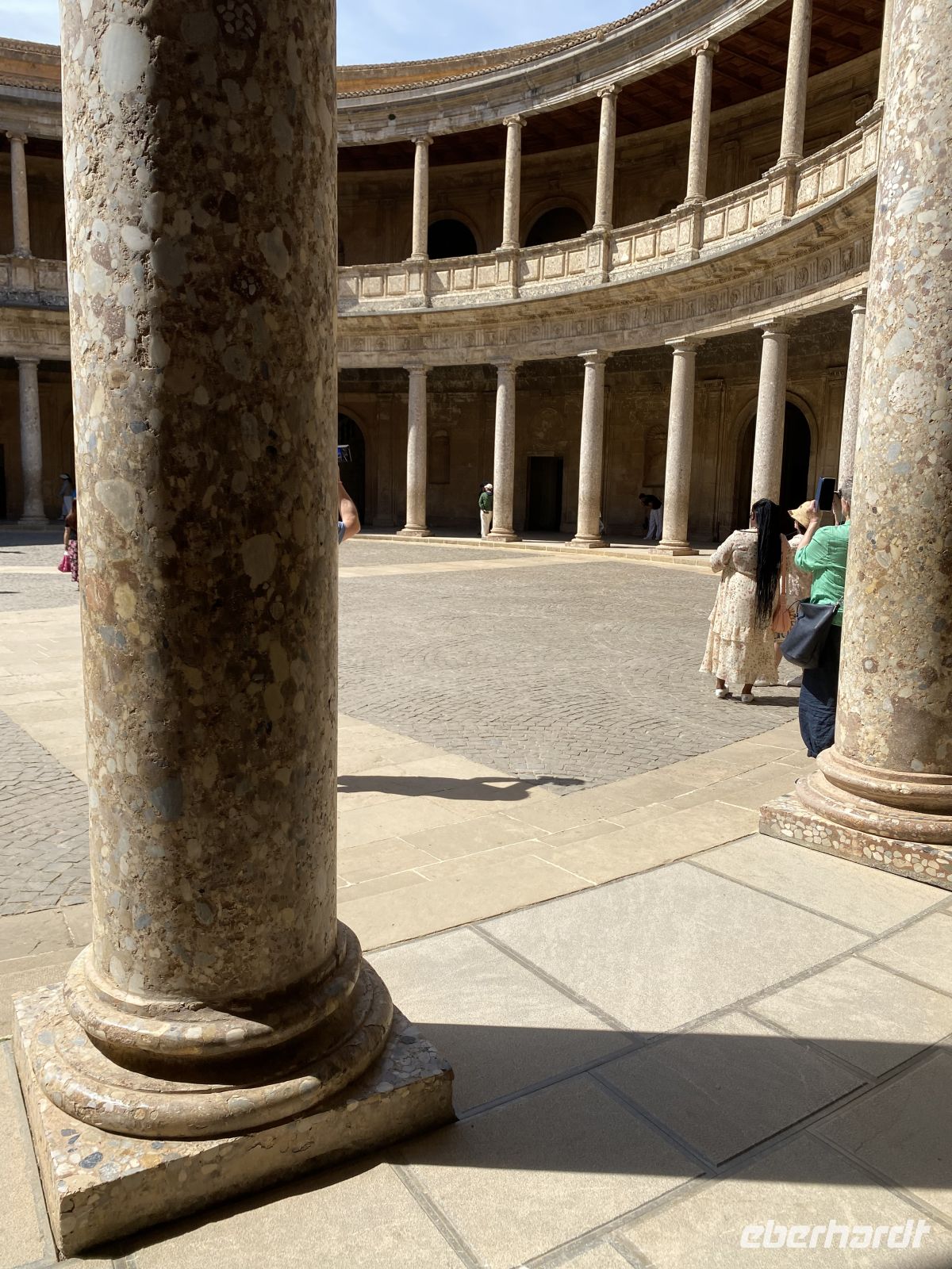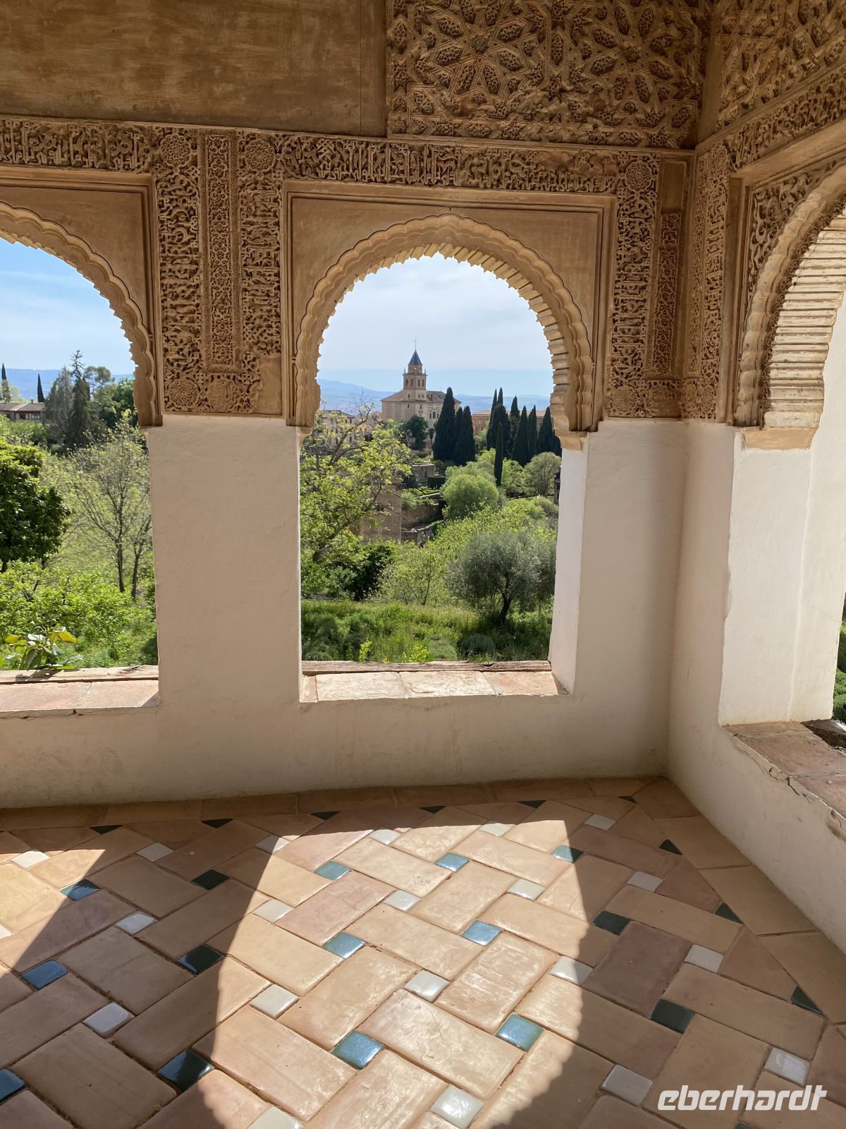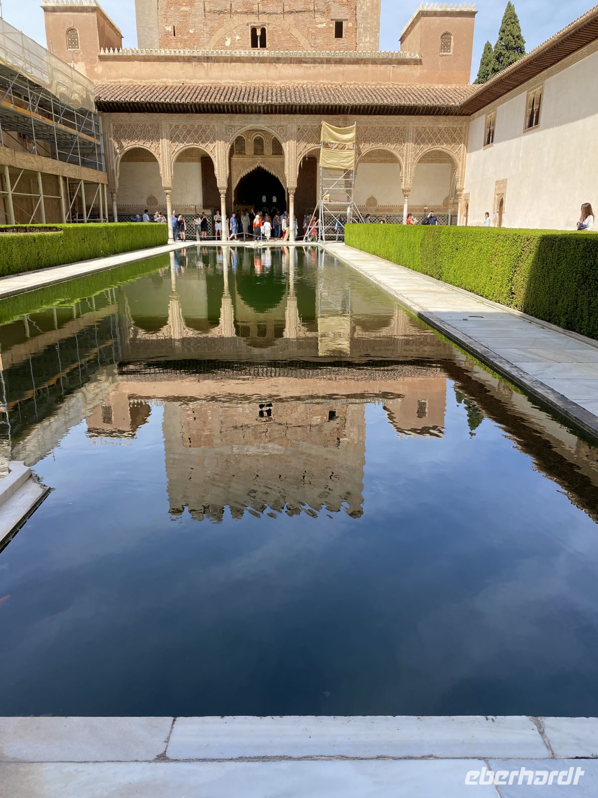 Unser Gästeführer führte uns durch die unterschiedlichen Teile der Alhambra, beginnend mit dem Palast Karls V. Im Renaissancestil erbaut, wirkt er kühl und wenig einladend, ganz im Gegensatz zum Nasridenpalast mit seinen filigranen Bögen und Mosaiken. Besonders anmutig wirken die Höfe mit ihren Wasserbecken und Pflanzen und den vielen schönen Durchblicken in die umgebende Landschaft und die Sierra Nevada. Im Löwenhof bestaunen wir nicht nur die Löwen, sondern auch die äußerst fein gestalteten Decken.