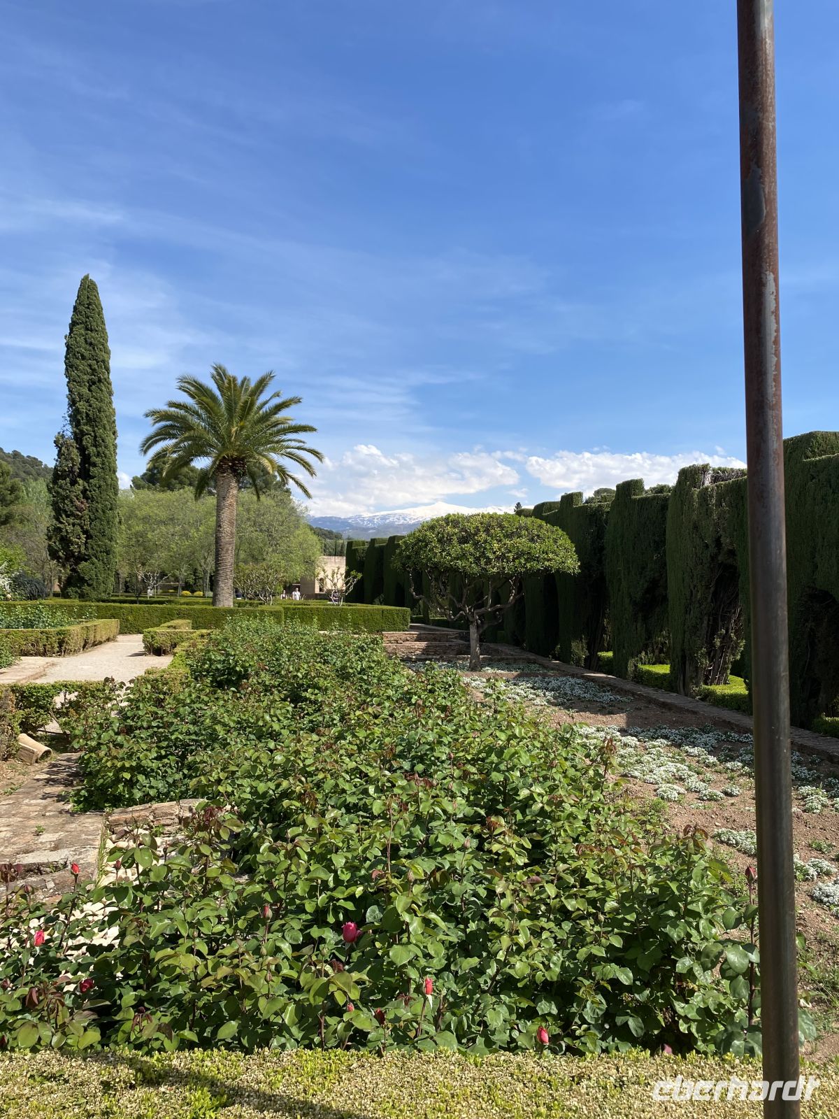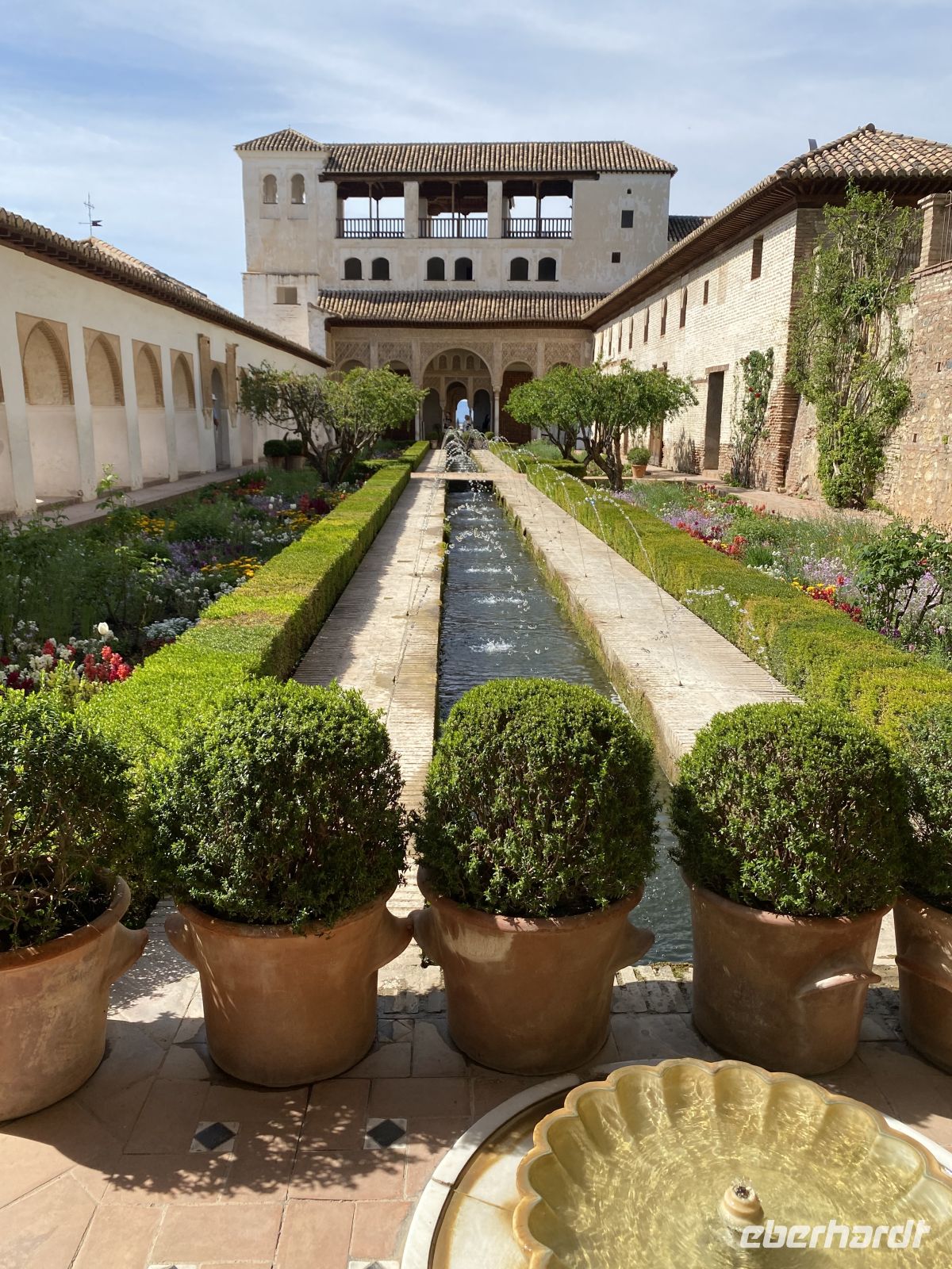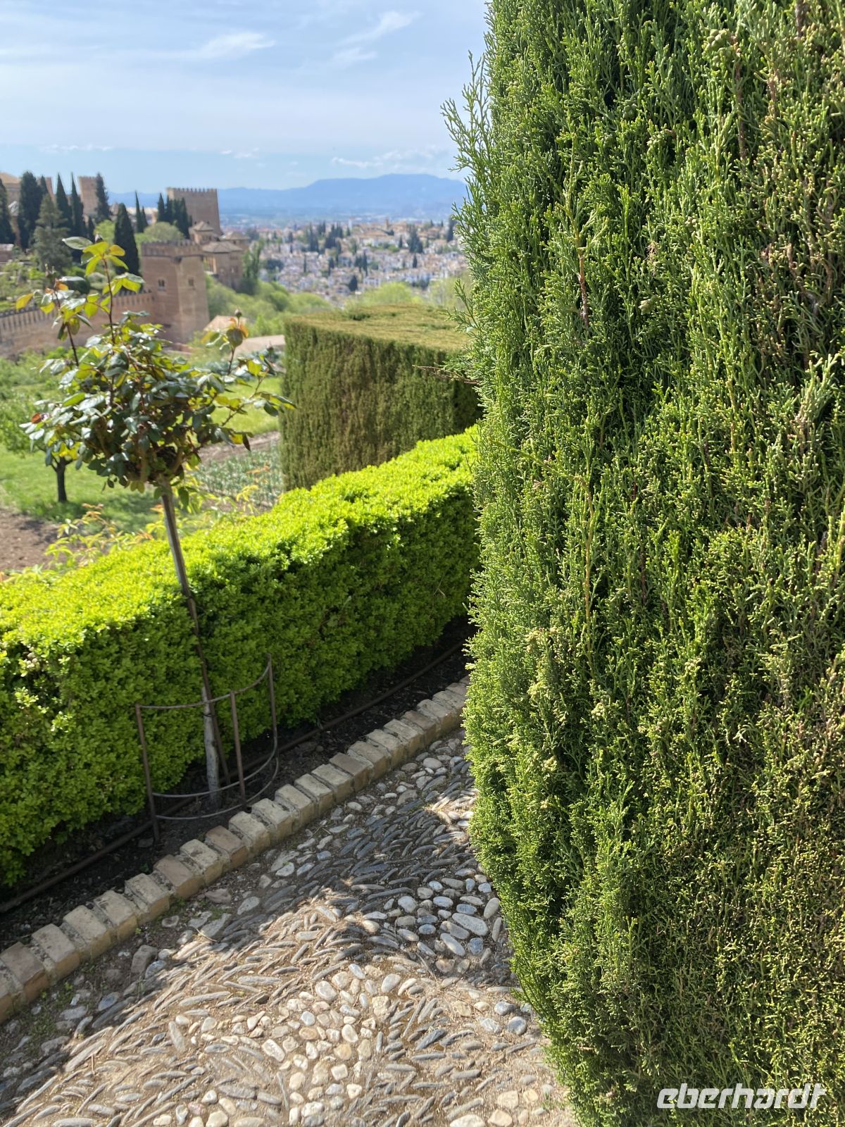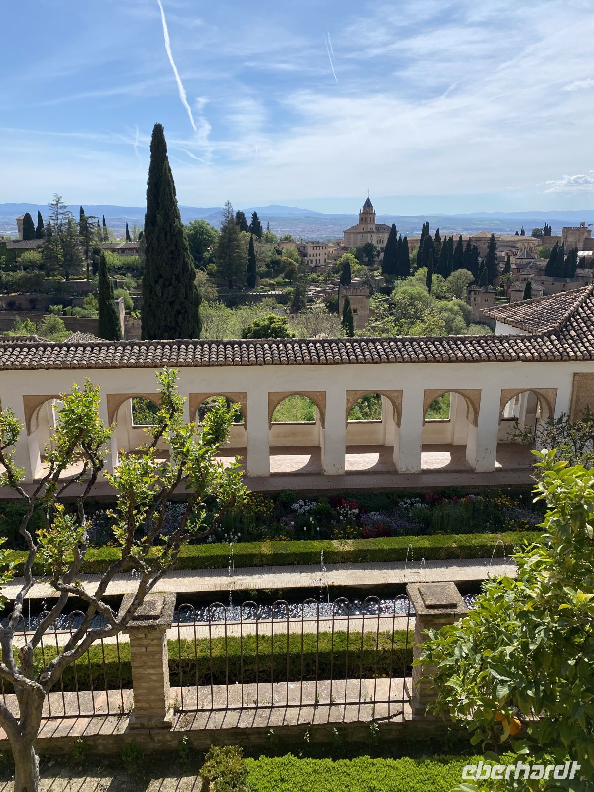 Sehr entspannend war der Besuch des östlich der Alhambra gelegenen Generalife, des Gartens des Architekten. Hier sind Gebäude, Pflanzen und Waserspiele harmonisch vereint und geben den Blick zur Alhambra und zur Sierra Nevada frei.