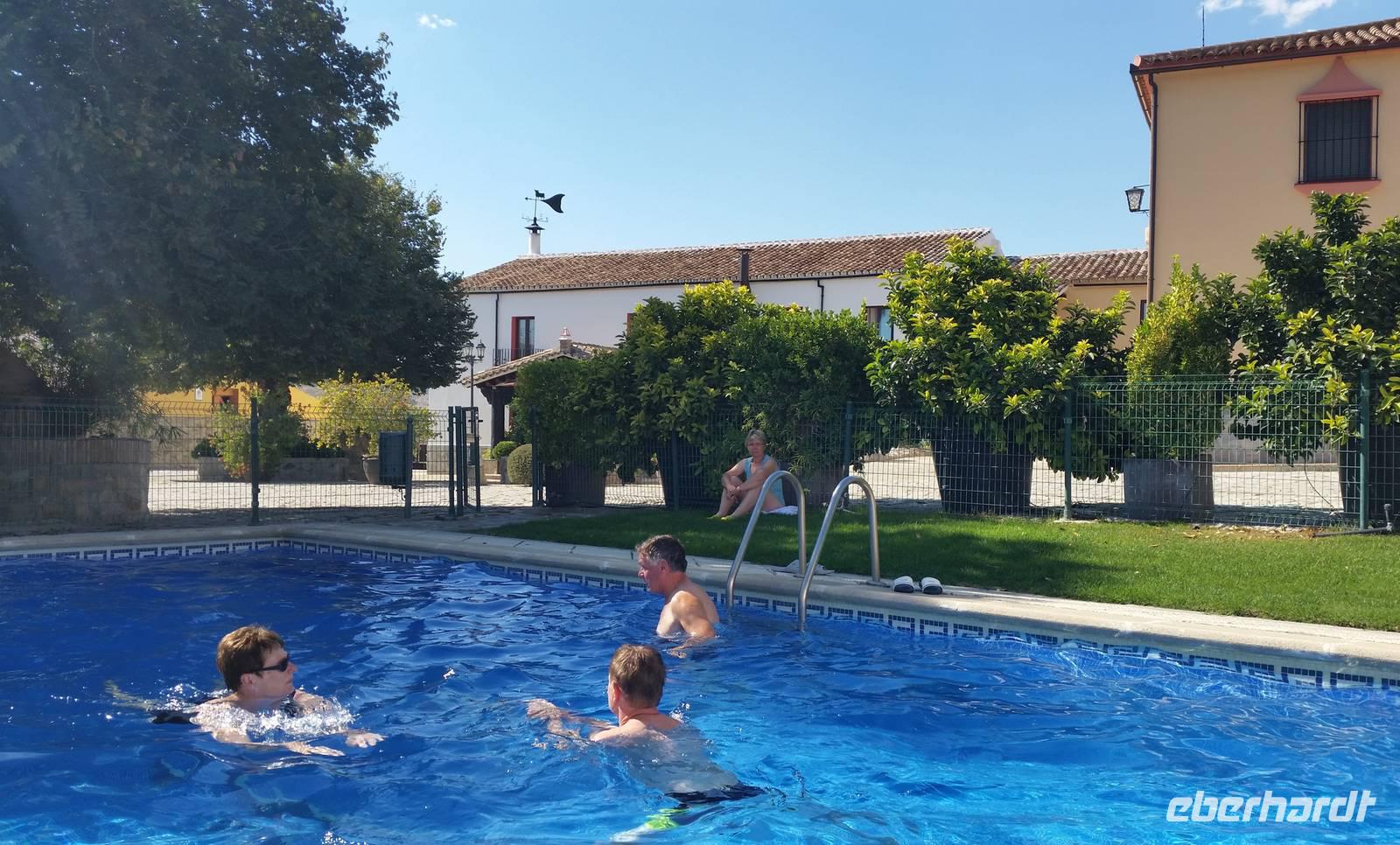Wir wanderten durch einen Wald, voll von gemeinen mitteleuropäischen Kiefern. Als wir ankommen, setzen wir uns sofort auf eine Terrasse, wo wir mit Bier uns erfrischen und darauf anstoßen, was wir heute geschafft haben. Später einige gingen in den Pool um die Sonne auf der Liege richtig zu genießen. Zum Abendessen stoßen wir wieder auf diesen wunderschönen Tagen mit unseren Lieblingsspruch: „Arriba, abajo, al centro y para dentro" an.