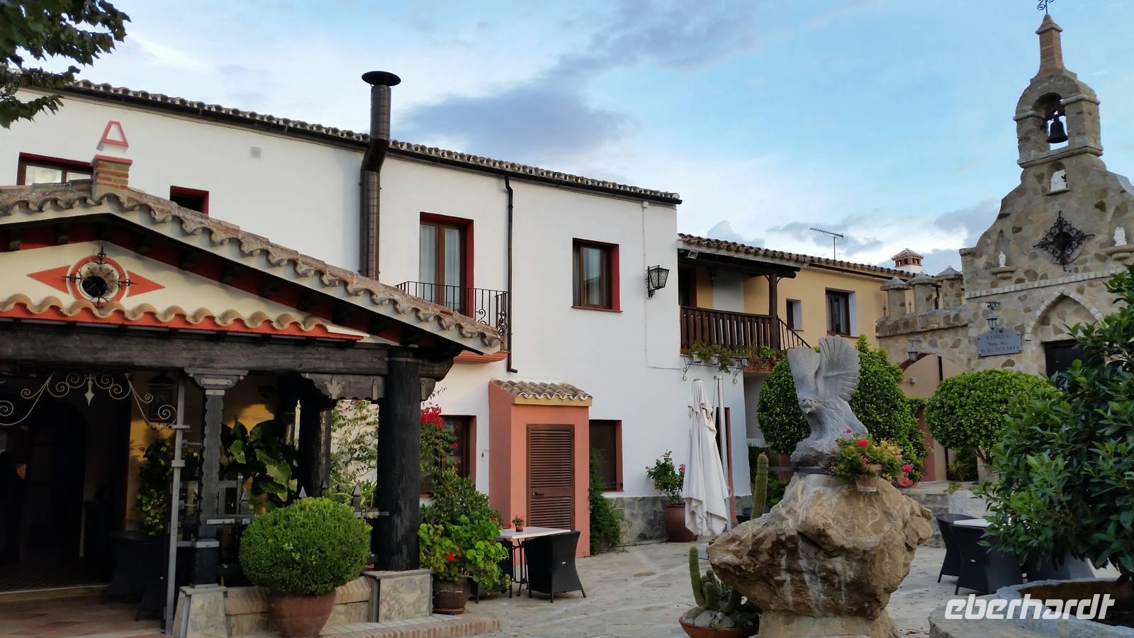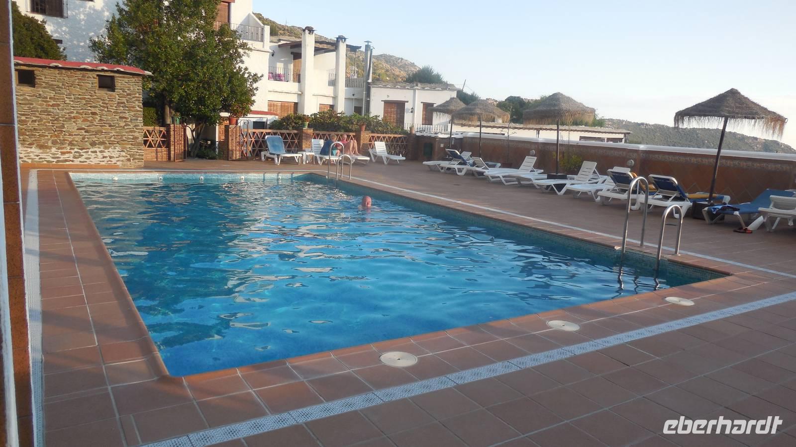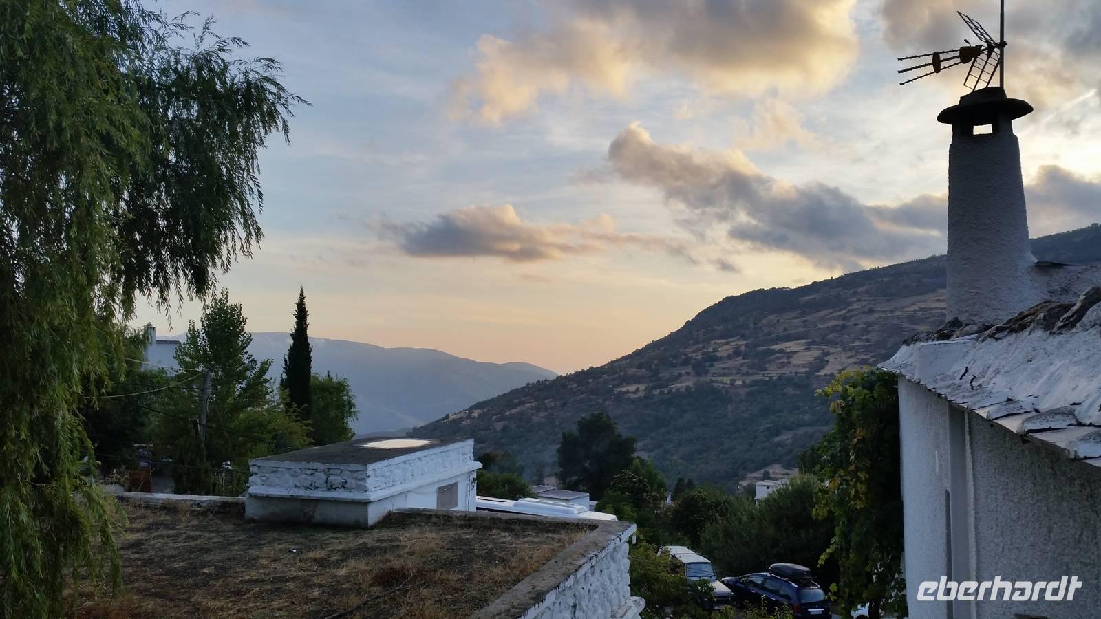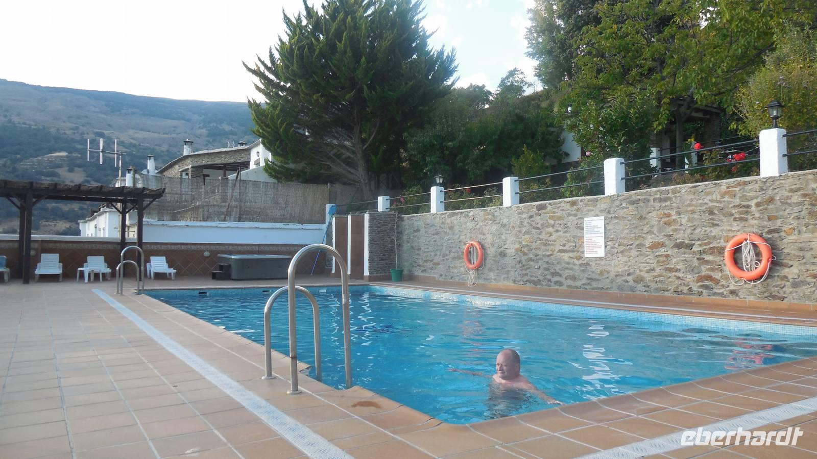 Wir müssen uns von Granada verabschieden und im Anschluss fahren wir entlang zahlreicher Serpentinen in die Bergwelt der Alpujarras, das letzte Rückzugsgebiet der Mauren mit ihren Bergdörfern. Wir biegen in Lanjaron ab, einem Kurort Spaniens in 450 Meter über dem Meeresspiegel. Das Dorf Capileira, wo unser idyllisches Hotel „Finca Los Llanos" ist, liegt auf 1450 Meter Höhe und ist der höchste Ort des Poqueiratals. Es war noch hell und wir hatten noch Zeit um in den Pool zu springen oder das Dorf zum ersten Mal zu erkunden bevor wir ein deftiges hausgemachtes regionales Abendessen genießen durften.