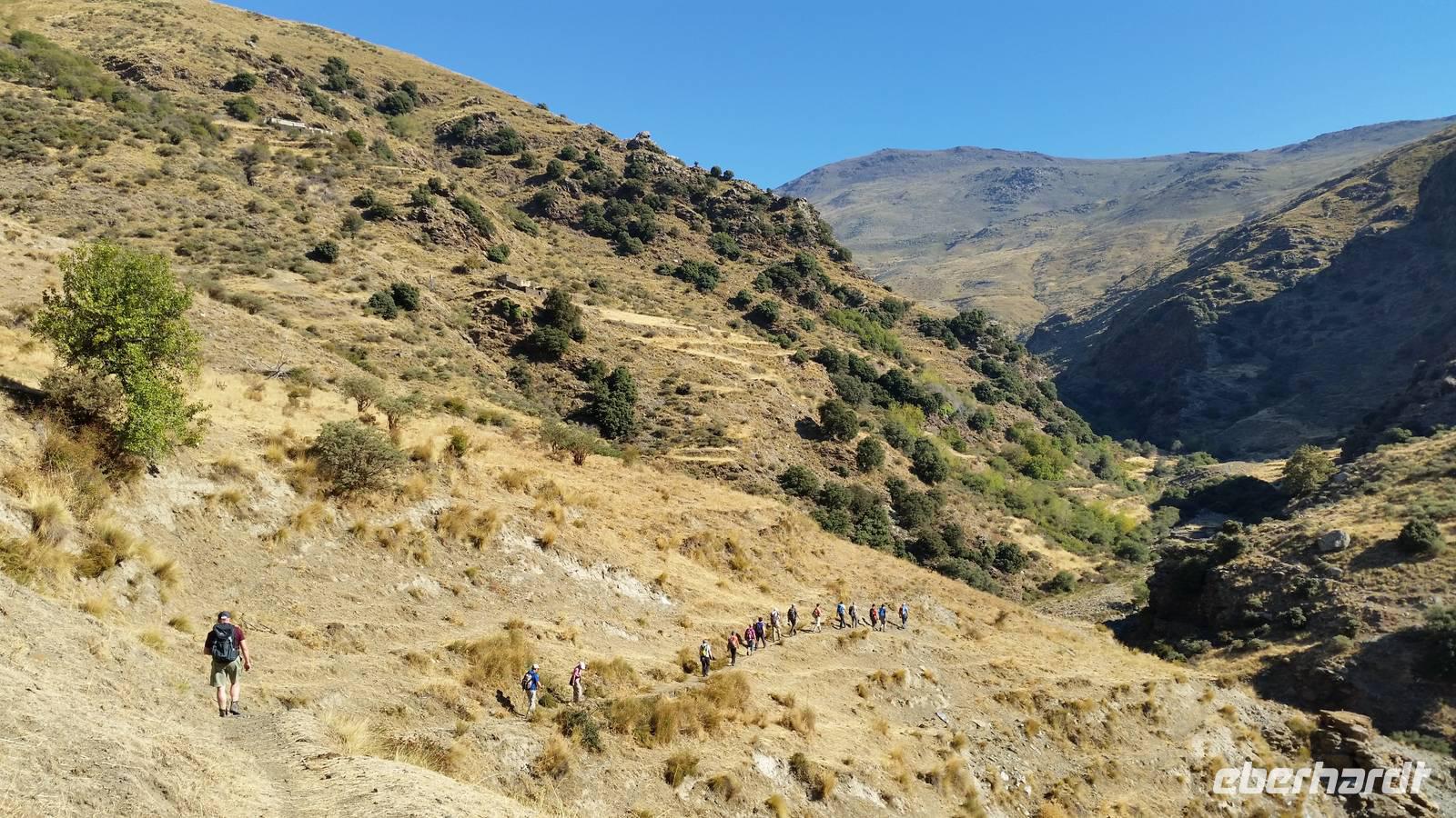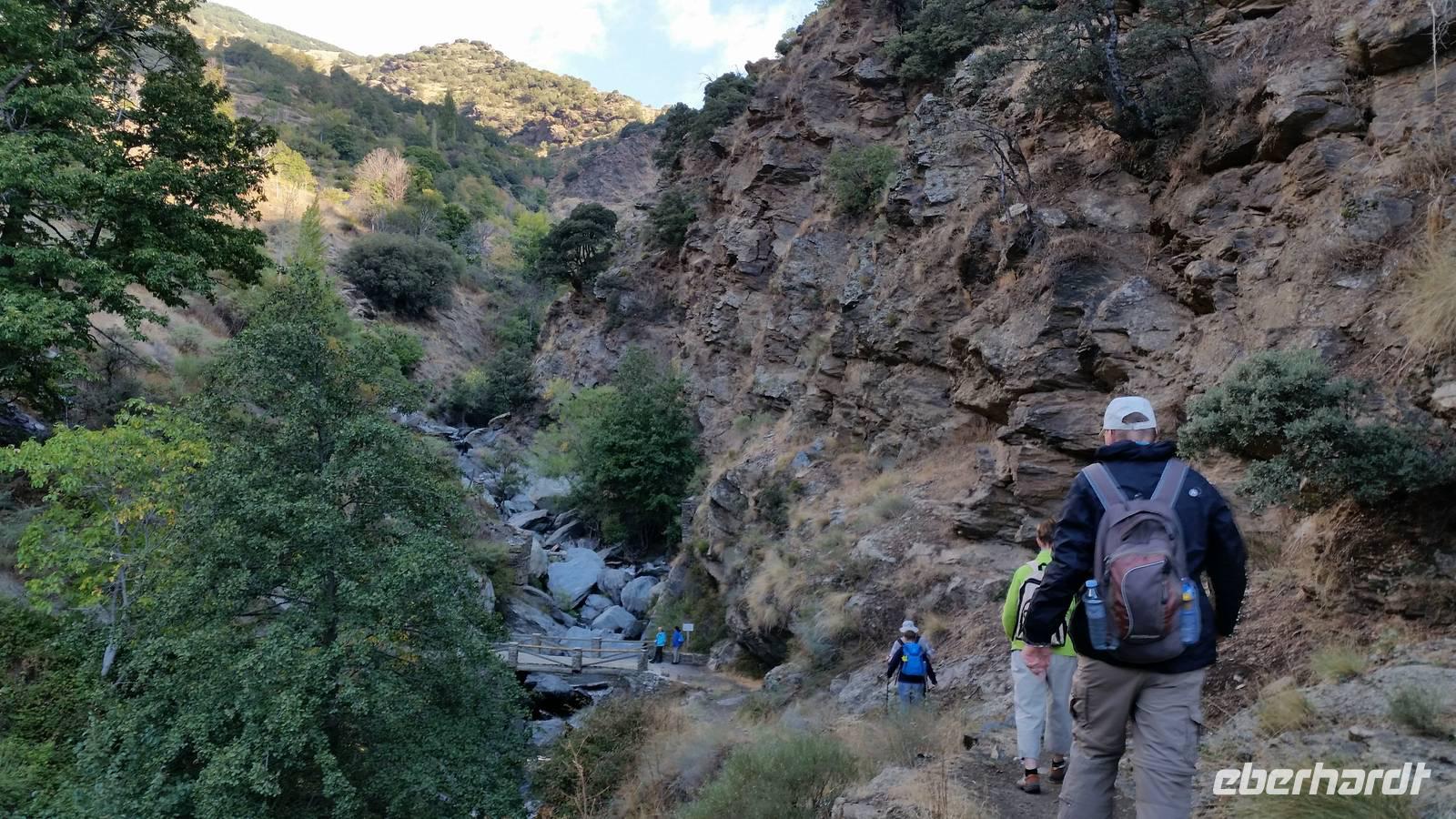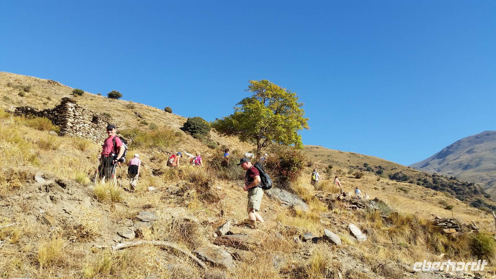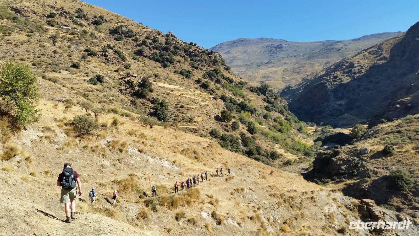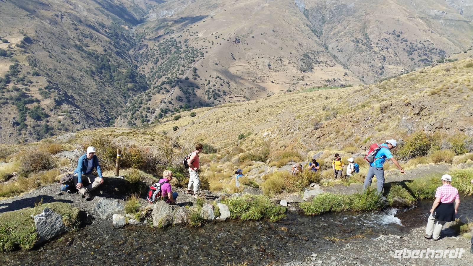 Wir wandern durch das tief eingeschnittene Flussbett des Rio Poqueira mit seinen zahlreichen Nebenflüssen. Auf dem Weg werden wir wunderschöne kleine Wasserfälle treffen. Links und rechts des Pfades erblicken wir traditionelle „Cortijos". Paco erzählt uns dieses Jahr auch wieder interessante Details zum früheren Leben der Schafhirten, die hier in den Sommermonaten die andalusischen Gehöfte bewohnten. Wir gehen auch bei einer „Acequia" vorbei, einem antiken Bewässerungskanalsystem, welches auf die zeitliche Epoche der Mauren zurückgeht. Nicht weit von uns sehen wir oben die Hütte, von wo man den Mulhacen erklimmen kann.