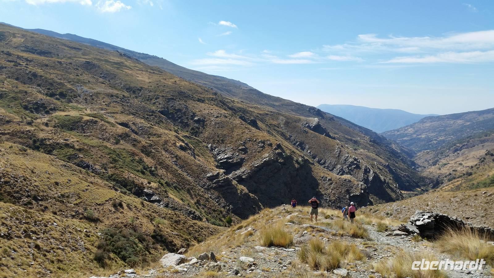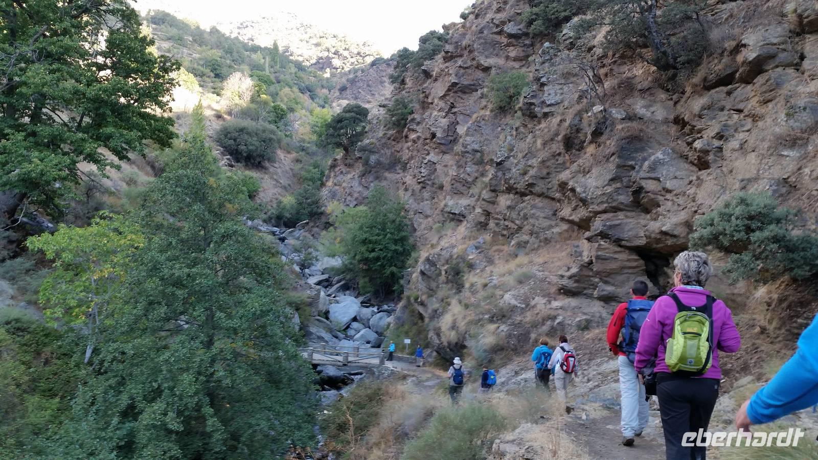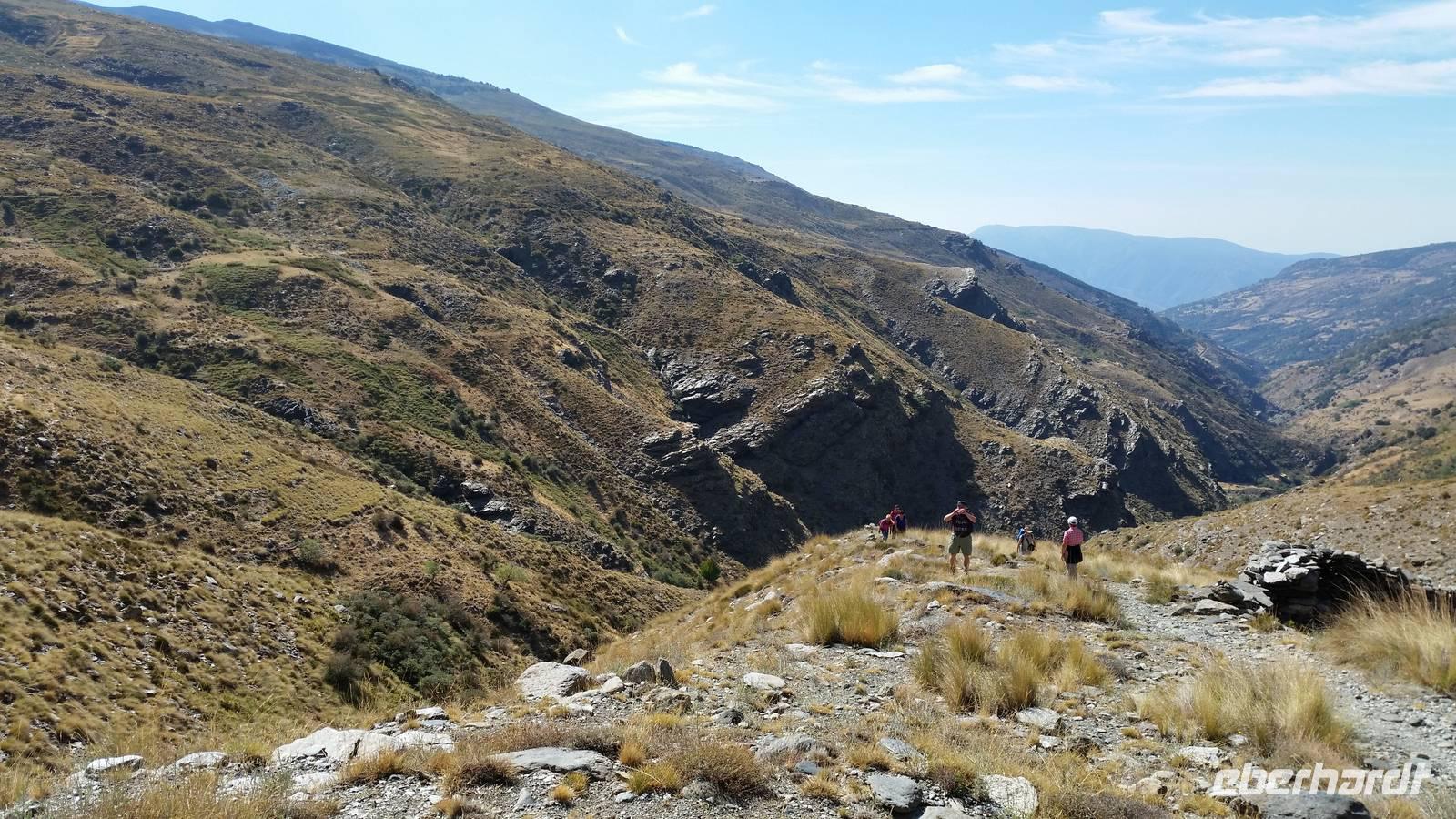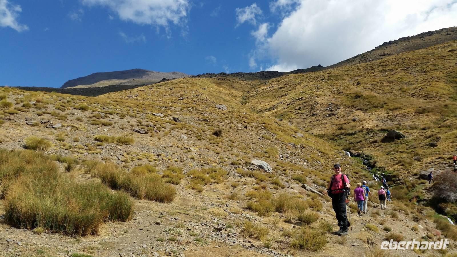 Wir wandern durch das tief eingeschnittene Flussbett des Rio Poqueira mit seinen zahlreichen Nebenflüssen. Auf dem Weg werden wir wunderschöne kleine Wasserfälle treffen. Links und rechts des Pfades erblicken wir traditionelle „Cortijos". Paco erzählt uns dieses Jahr auch wieder interessante Details zum früheren Leben der Schafhirten, die hier in den Sommermonaten die andalusischen Gehöfte bewohnten. Wir gehen auch bei einer „Acequia" vorbei, einem antiken Bewässerungskanalsystem, welches auf die zeitliche Epoche der Mauren zurückgeht. Nicht weit von uns sehen wir oben die Hütte, von wo man den Mulhacen erklimmen kann.