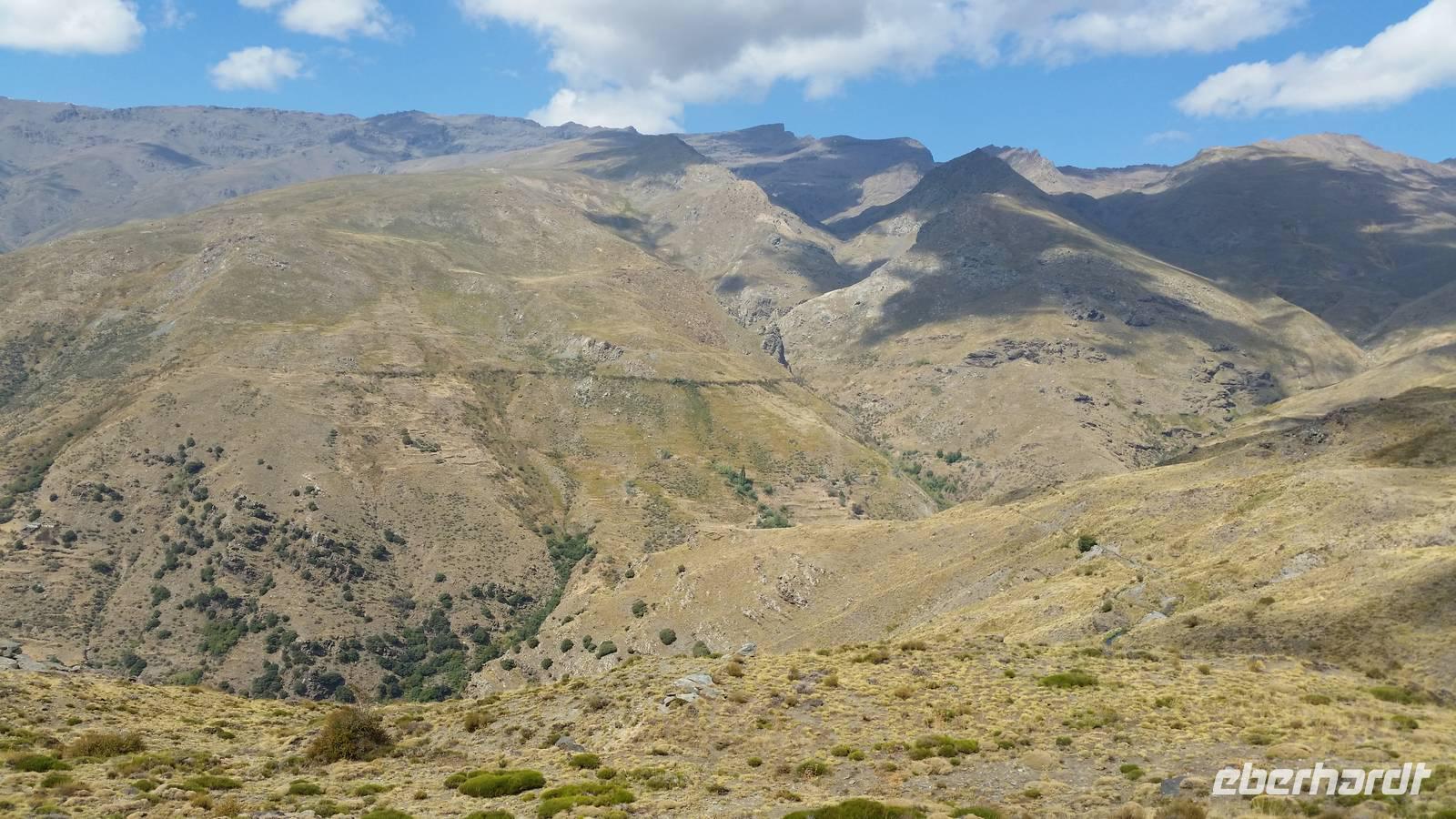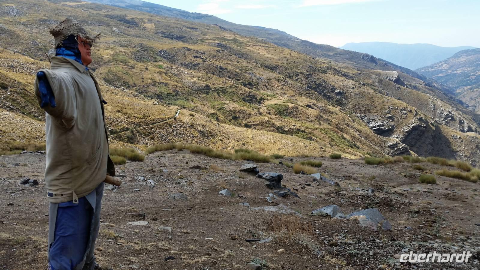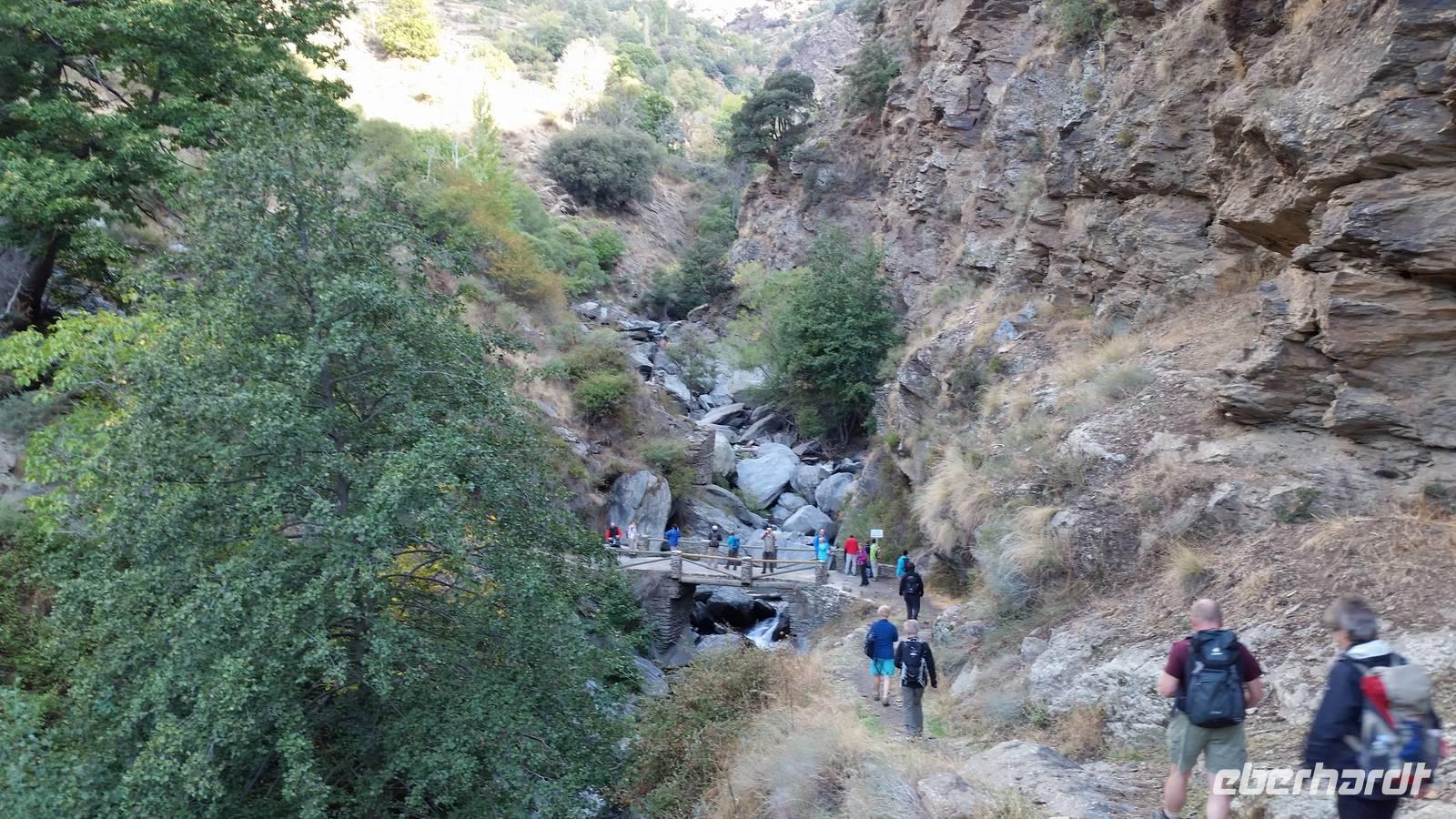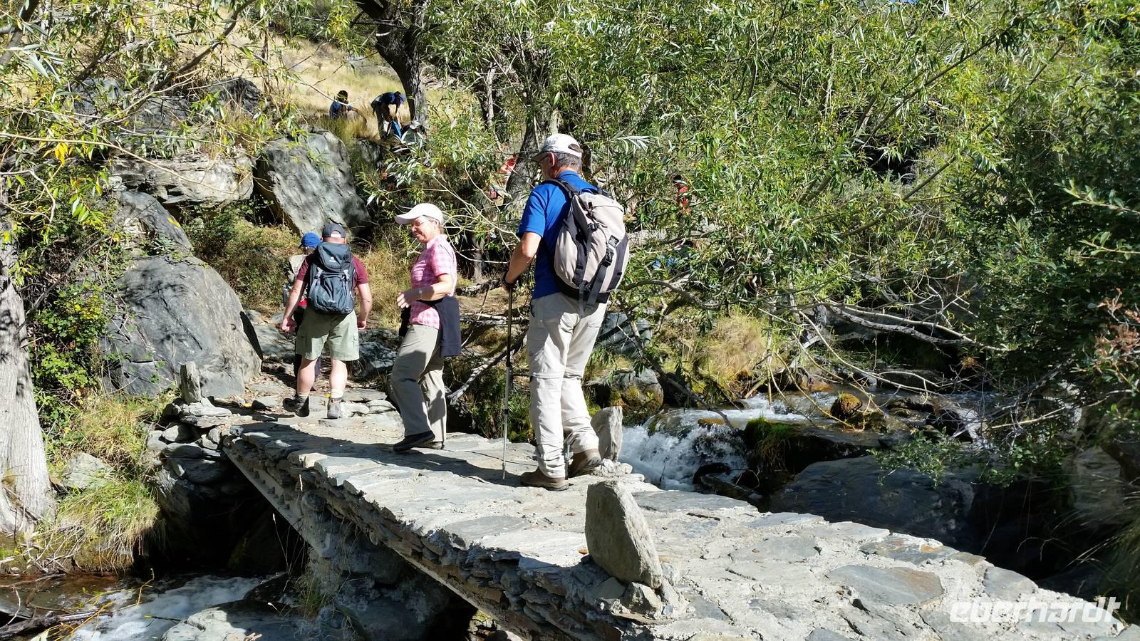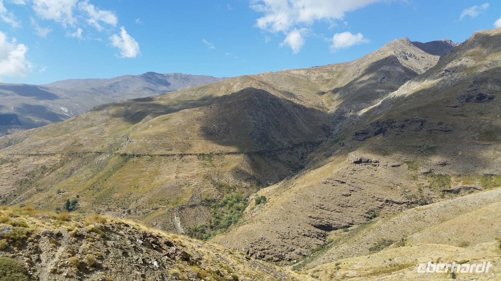 Wir wandern durch das tief eingeschnittene Flussbett des Rio Poqueira mit seinen zahlreichen Nebenflüssen. Auf dem Weg werden wir wunderschöne kleine Wasserfälle treffen. Links und rechts des Pfades erblicken wir traditionelle „Cortijos". Paco erzählt uns dieses Jahr auch wieder interessante Details zum früheren Leben der Schafhirten, die hier in den Sommermonaten die andalusischen Gehöfte bewohnten. Wir gehen auch bei einer „Acequia" vorbei, einem antiken Bewässerungskanalsystem, welches auf die zeitliche Epoche der Mauren zurückgeht. Nicht weit von uns sehen wir oben die Hütte, von wo man den Mulhacen erklimmen kann.