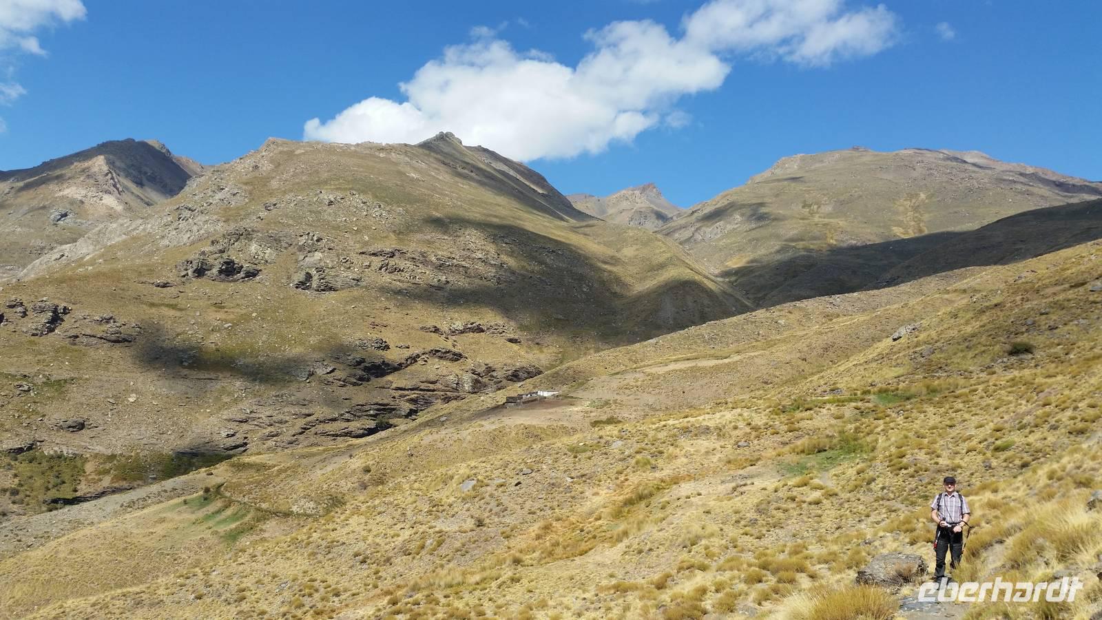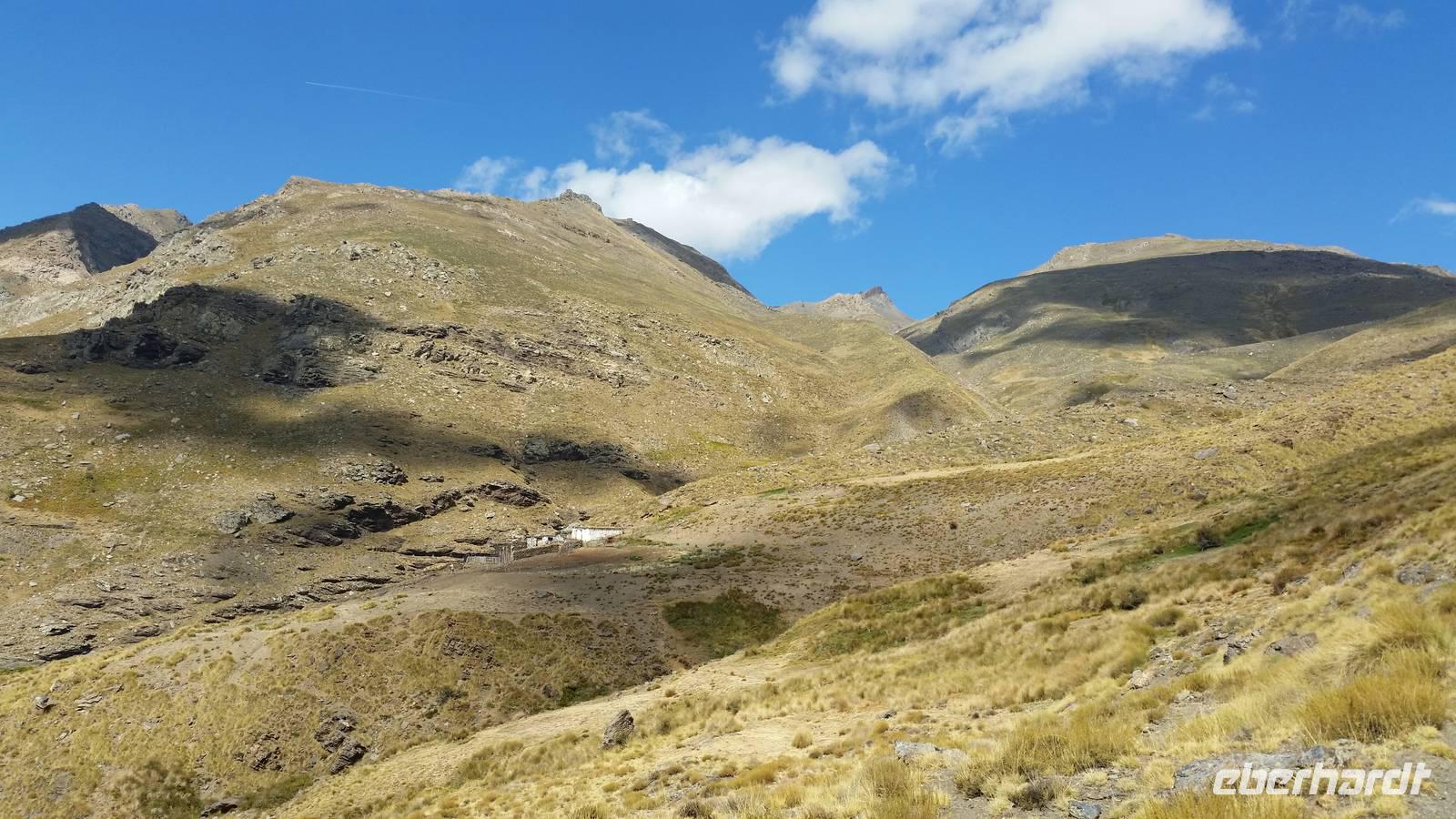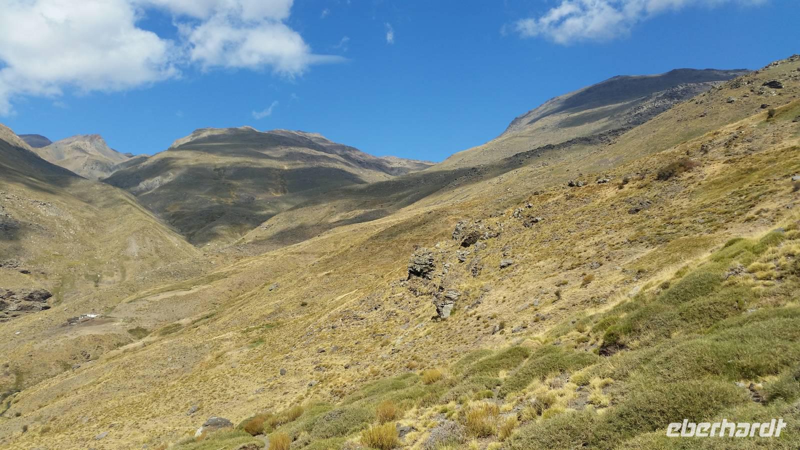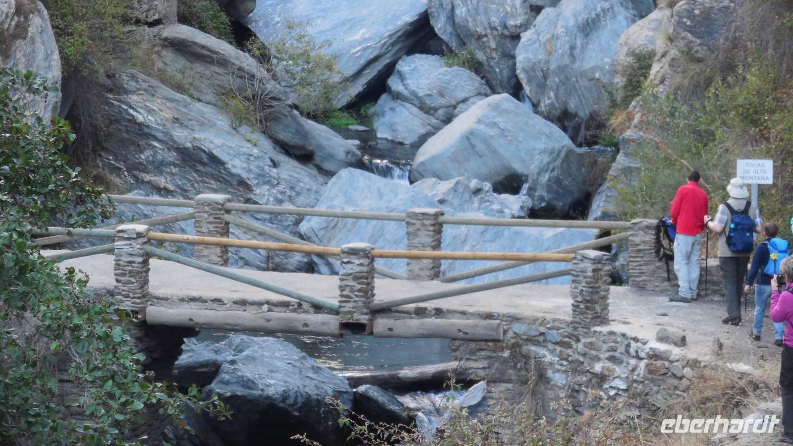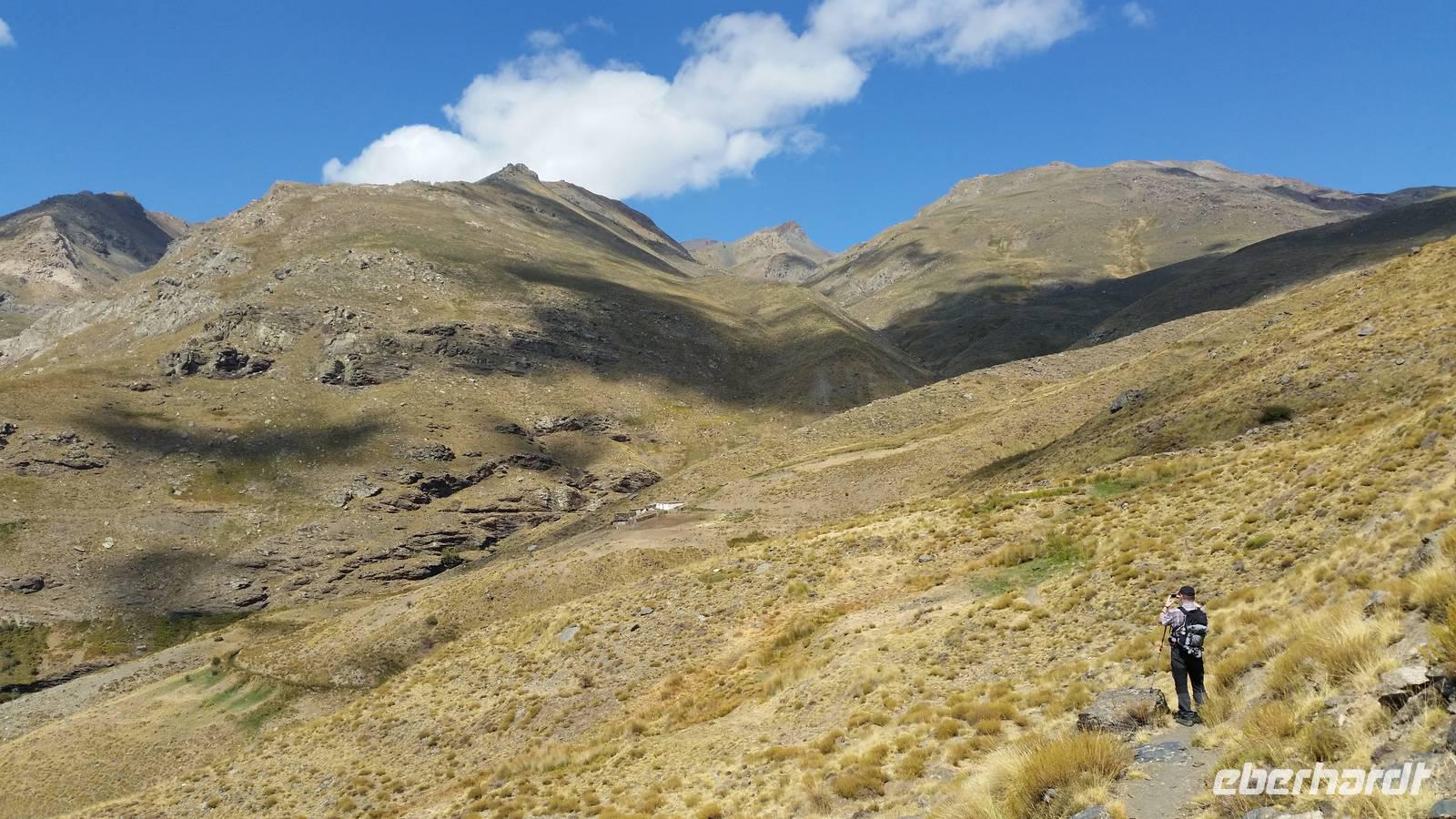 Wir wandern durch das tief eingeschnittene Flussbett des Rio Poqueira mit seinen zahlreichen Nebenflüssen. Auf dem Weg werden wir wunderschöne kleine Wasserfälle treffen. Links und rechts des Pfades erblicken wir traditionelle „Cortijos". Paco erzählt uns dieses Jahr auch wieder interessante Details zum früheren Leben der Schafhirten, die hier in den Sommermonaten die andalusischen Gehöfte bewohnten. Wir gehen auch bei einer „Acequia" vorbei, einem antiken Bewässerungskanalsystem, welches auf die zeitliche Epoche der Mauren zurückgeht. Nicht weit von uns sehen wir oben die Hütte, von wo man den Mulhacen erklimmen kann.