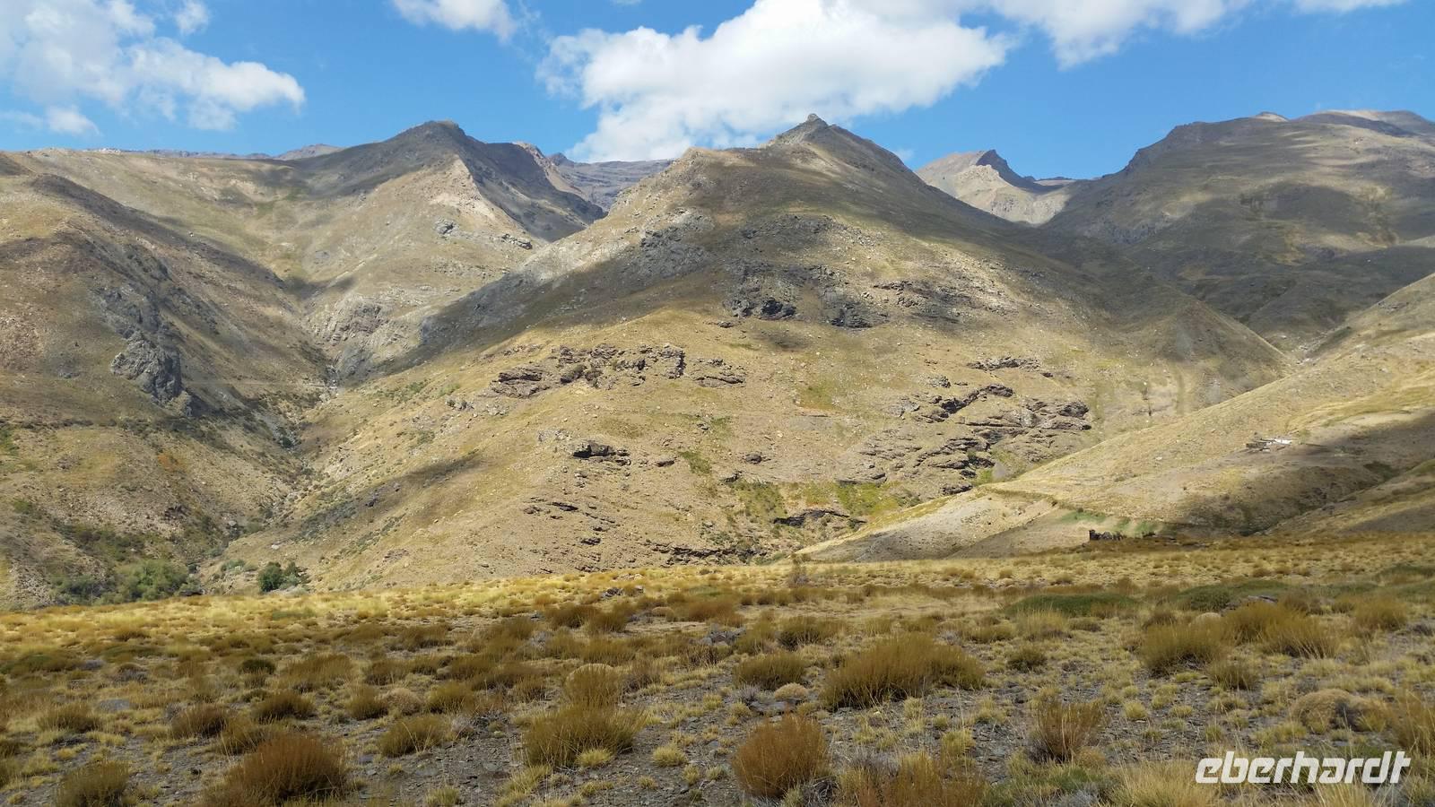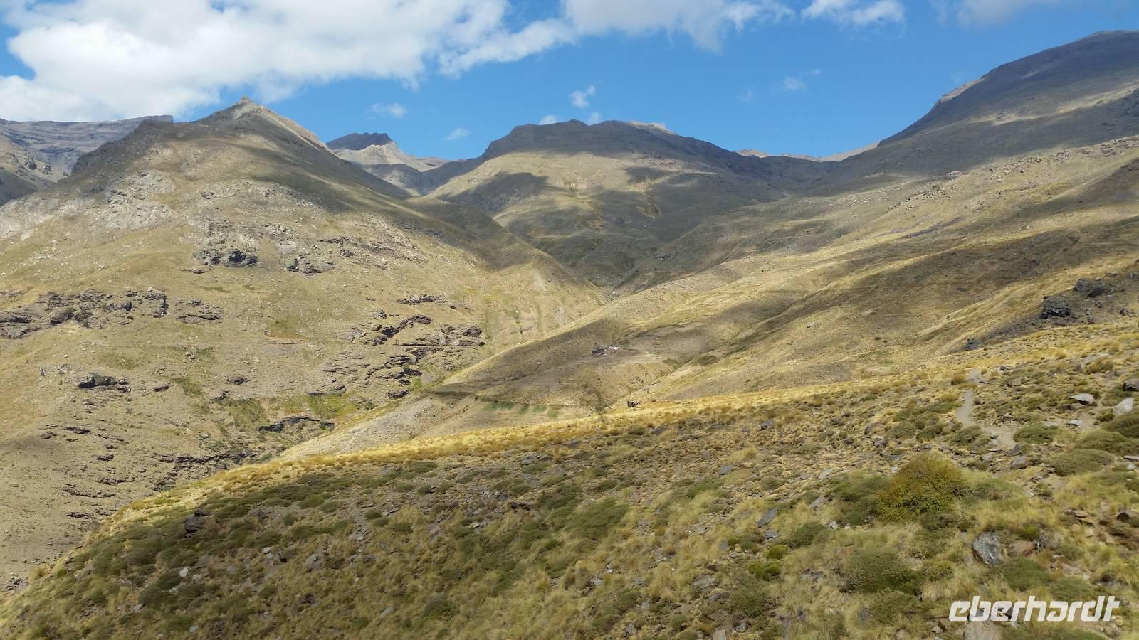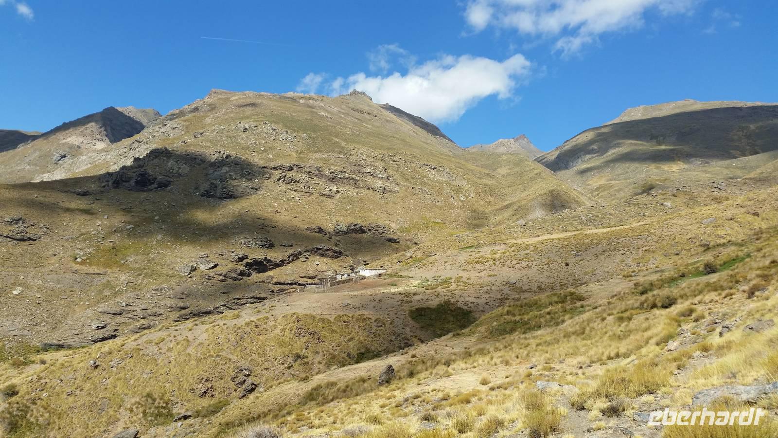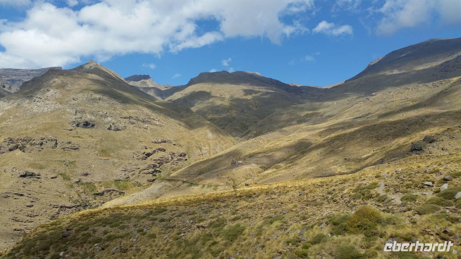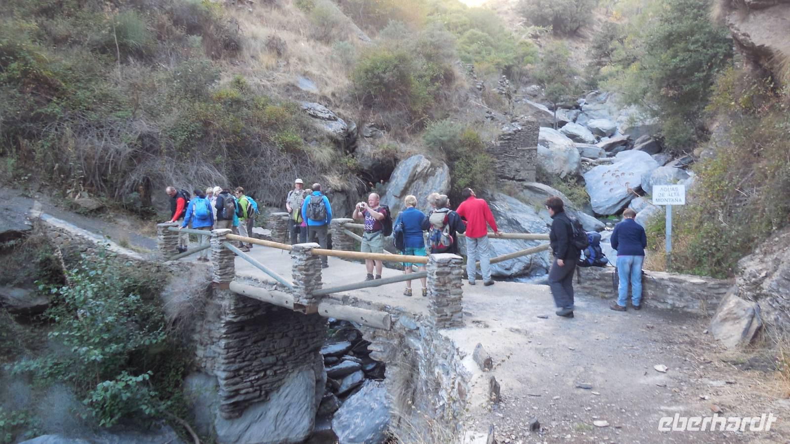 Wir wandern durch das tief eingeschnittene Flussbett des Rio Poqueira mit seinen zahlreichen Nebenflüssen. Auf dem Weg werden wir wunderschöne kleine Wasserfälle treffen. Links und rechts des Pfades erblicken wir traditionelle „Cortijos". Paco erzählt uns dieses Jahr auch wieder interessante Details zum früheren Leben der Schafhirten, die hier in den Sommermonaten die andalusischen Gehöfte bewohnten. Wir gehen auch bei einer „Acequia" vorbei, einem antiken Bewässerungskanalsystem, welches auf die zeitliche Epoche der Mauren zurückgeht. Nicht weit von uns sehen wir oben die Hütte, von wo man den Mulhacen erklimmen kann.