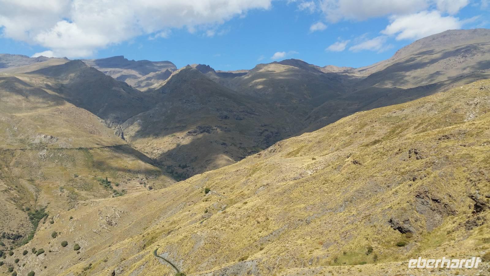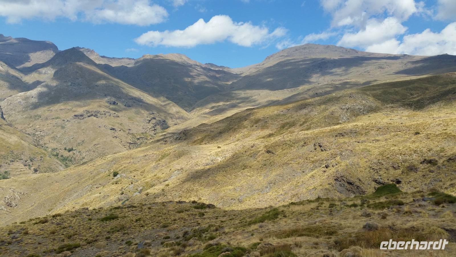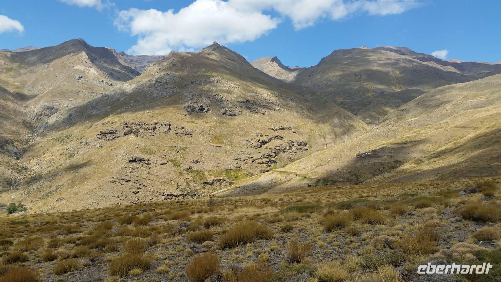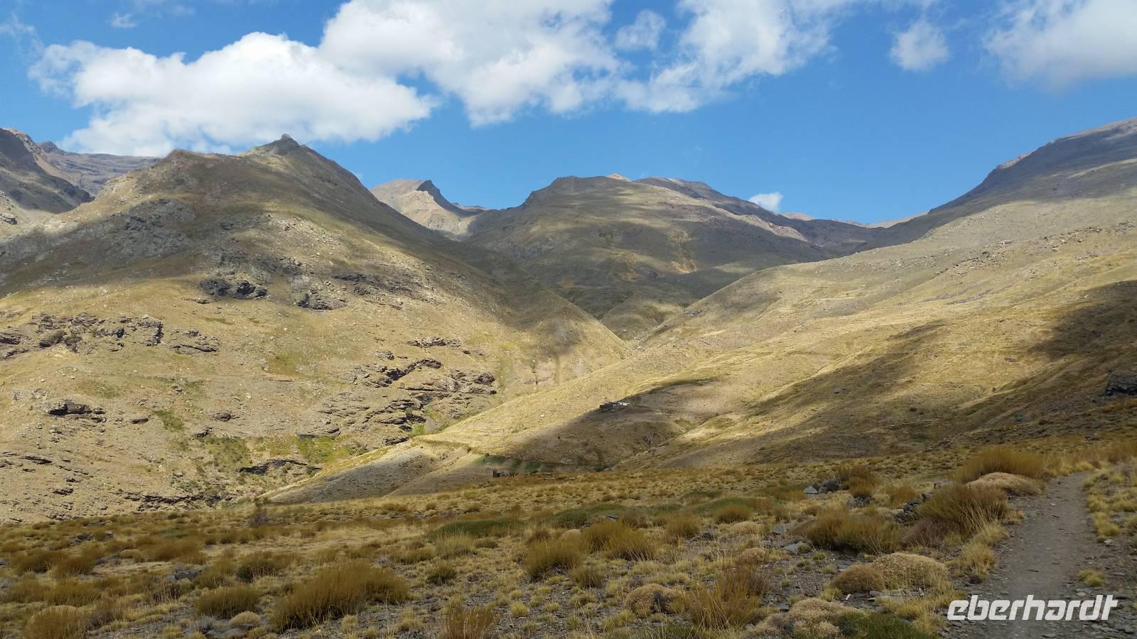 Wir wandern durch das tief eingeschnittene Flussbett des Rio Poqueira mit seinen zahlreichen Nebenflüssen. Auf dem Weg werden wir wunderschöne kleine Wasserfälle treffen. Links und rechts des Pfades erblicken wir traditionelle „Cortijos". Paco erzählt uns dieses Jahr auch wieder interessante Details zum früheren Leben der Schafhirten, die hier in den Sommermonaten die andalusischen Gehöfte bewohnten. Wir gehen auch bei einer „Acequia" vorbei, einem antiken Bewässerungskanalsystem, welches auf die zeitliche Epoche der Mauren zurückgeht. Nicht weit von uns sehen wir oben die Hütte, von wo man den Mulhacen erklimmen kann.