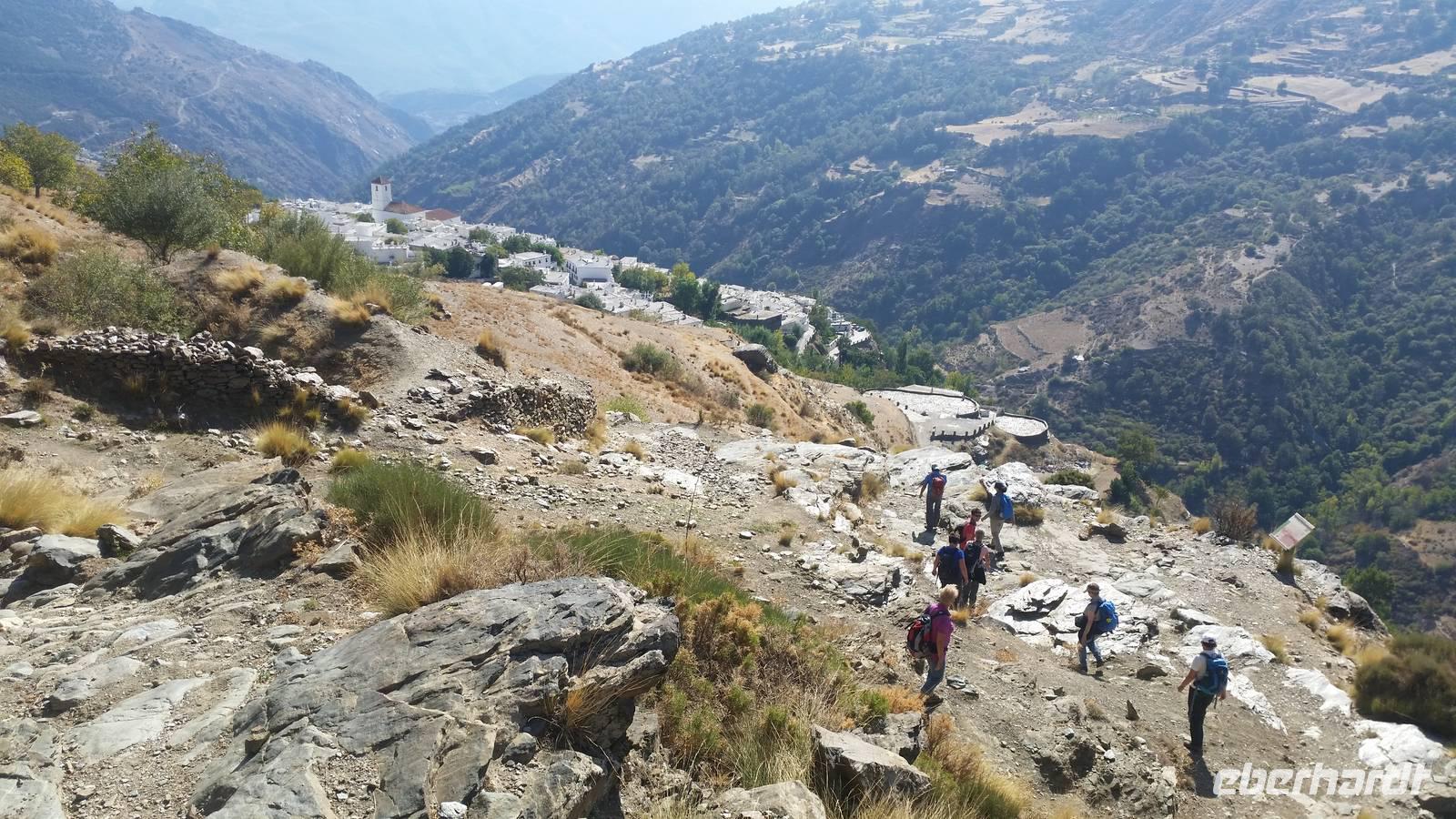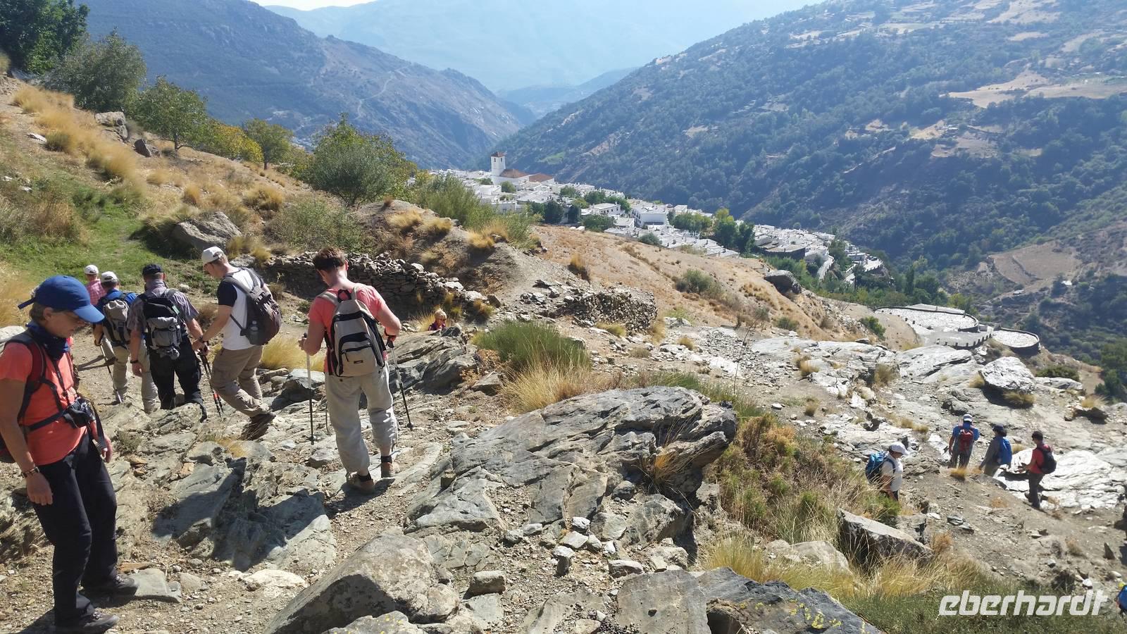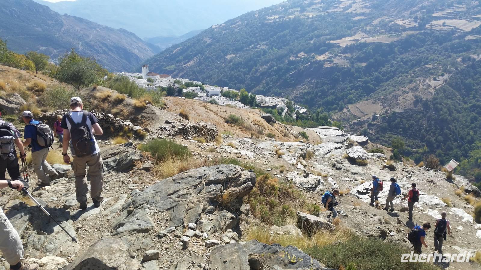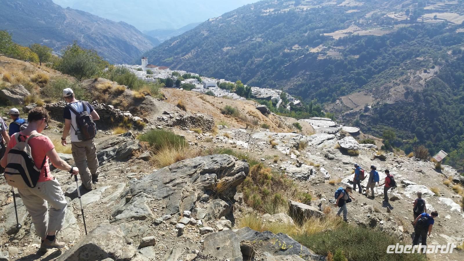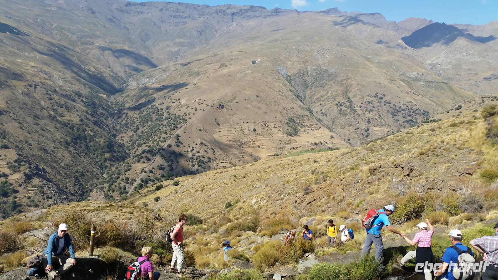 Wir hatten die ganze Woche Glück mit dem Wetter: schon wieder ein Tag ohne Wolken. Am heutigen Tag machen wir die schwierigste Wanderung unserer Wanderreise. Insgesamt 18 Kilometer und wir werden eine Höhe von 2100 Metern erreichen. Wir gingen um das ganze Tal herum und konnten wieder ganz nah die Spitze von Veleta und Mulhacen vor uns sehen. Früh am Morgen ging es bergab aber später ging es wieder bergauf. Unser erster kurzer Stopp war ein Wasserfall, der zur Stromerzeugung genutzt wird. Die kleineren Flüsse treffen sich und am Ende des Capoleira-Flusses wird das Wasser kräftig.