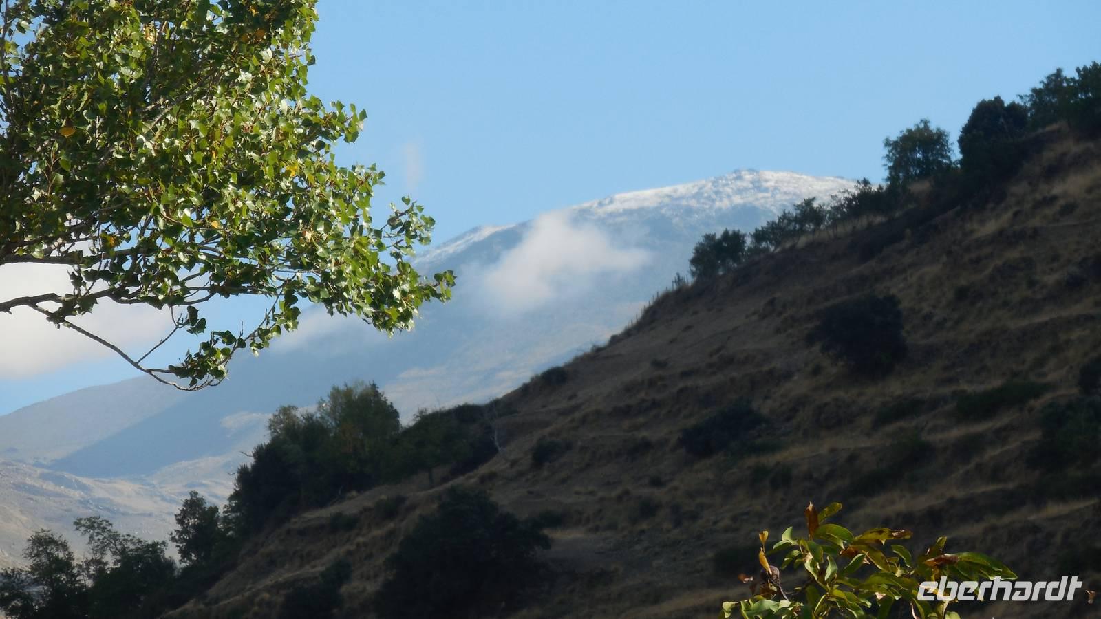 Wir erkunden die Bergwelt der Alpujarras. Auf dem Weg sehen wir den Fluss Poqueira, kräftig voll mit Wasser, und die zwei berühmten Spitzen der Sierra Nevada, Veleta mit seiner lustigen spitzen Form und Mulhacen, der höchste Berg Spaniens. Beide schon mit kleines bisschen Schnee.
