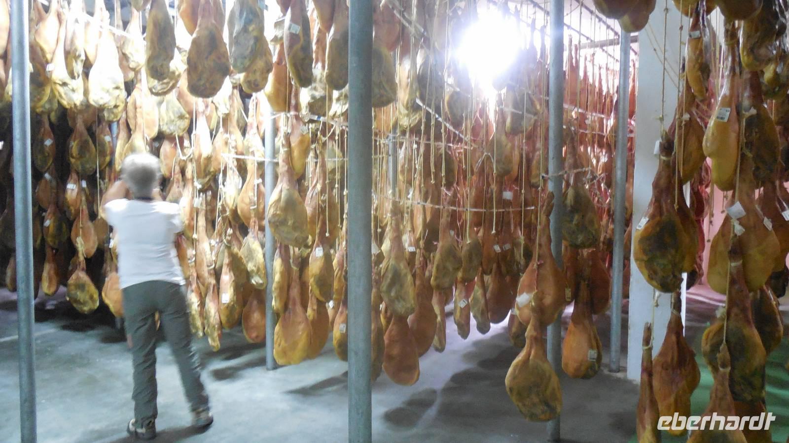 Unser nächster Stopp ist hier eine Bodega wo wir ein Bier für sensationelle 1,50 Euro zusammen mit Tapas bekamen (Jamon Serrano, Chorizo, Salchichon, Käse oder Lomo). Erster Tapas wurde von Eberhardt Travel an alle als WOW geschenkt. Einfach lecker. Dort wurde getrunken und wieder gesungen. Unser Busfahrer wartete hier schon auf uns damit wir nach Trevelez weiterfahren konnten, um eine traditionelle Schinkentrocknerei zu besuchen. Der Besitzer ist ein netter, einfacher Mann und erklärt uns, wie der Jamon Serrano von Trevelez gemacht wird. 24 Monate Zeit braucht dieser besondere Schinken. Auf dem Rückweg zum Hotel machten wir eine Pause bei einer Eisen-Quelle. Die Eisen-Quelle könnte man auch mit geschlossen Augen sofort merken da der Geschmack total eisig war.