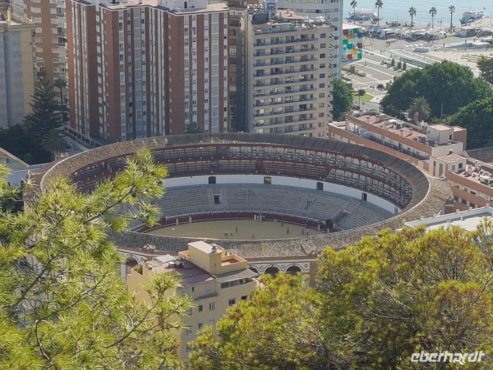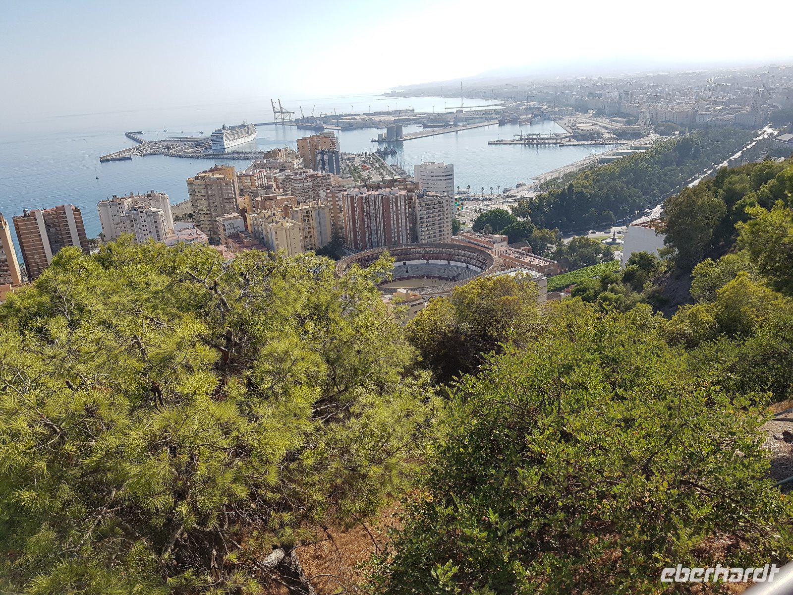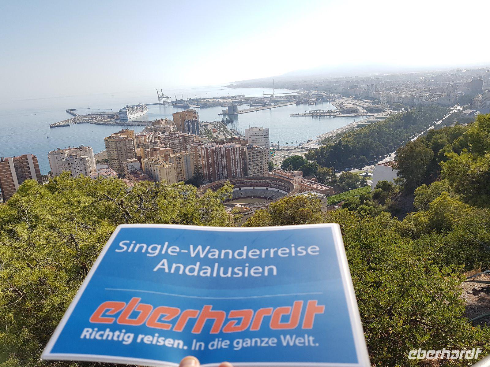 Am Flughafen erwarteten uns unser Busfahrer Juan Pulido und der örtlichen Reisebus, die uns in den nächsten Tagen durch Andalusien fahren werden. Wir hatten noch mehr als 1 Stunde Fahrt bis zum Hotel Cortijo Salinas außerhalb von Ronda, aber wir wollten schon heute die Gäste überraschen und gemeinsam noch kurz Malaga zu erkunden. Eigentlich war eine Malaga Stadtbesichtigung nicht im Programm aber da wir bisschen noch Zeit hatten, fuhren wir hoch zur Festung auf einem Hügel von Malaga, wo man herrlich die ganze Stadt, die Stierkampf Arena und den Hafen betrachten konnte.