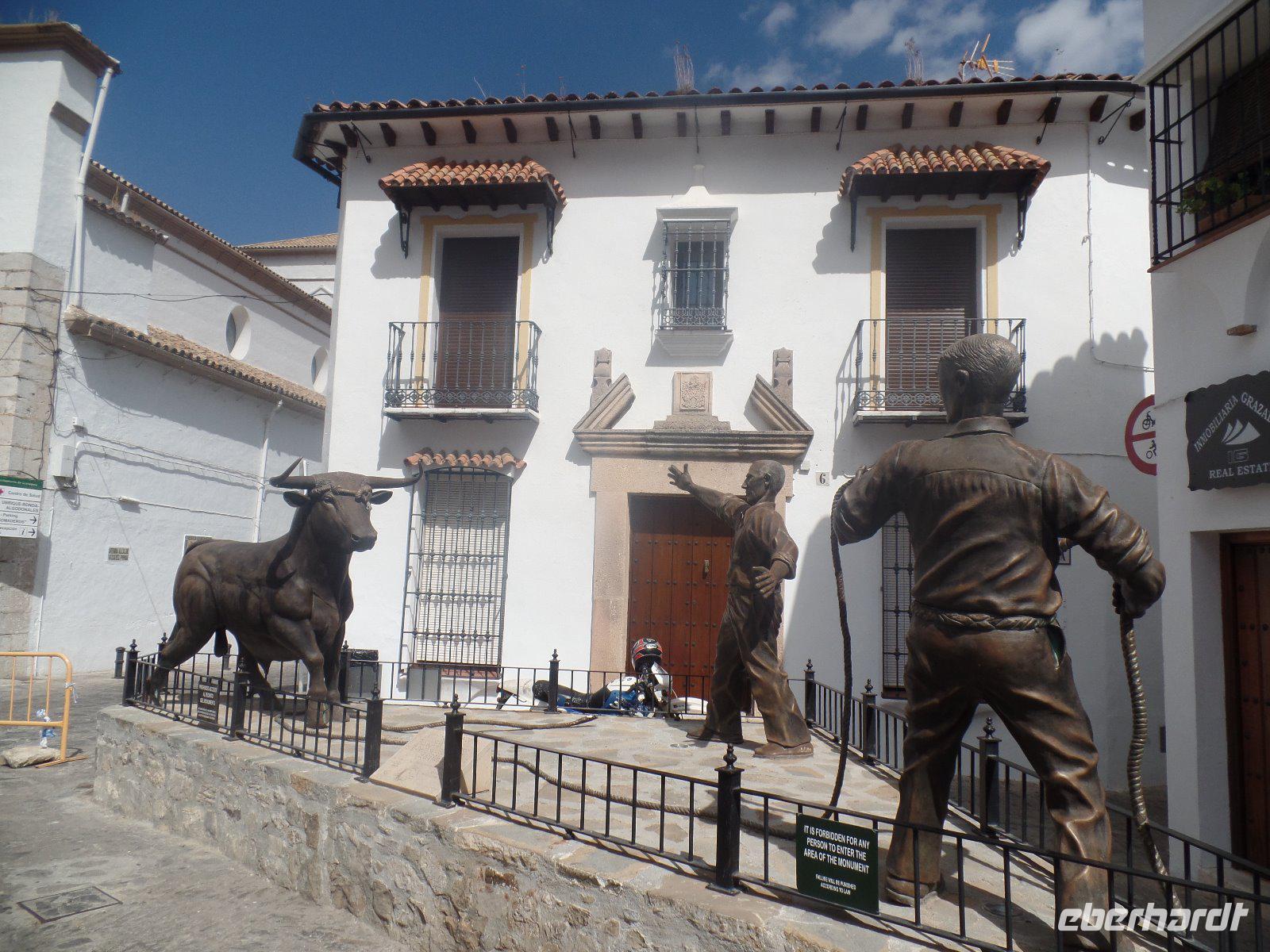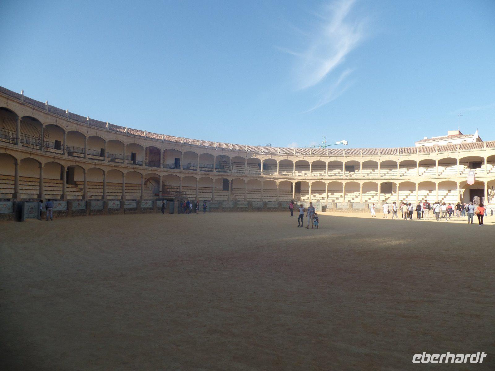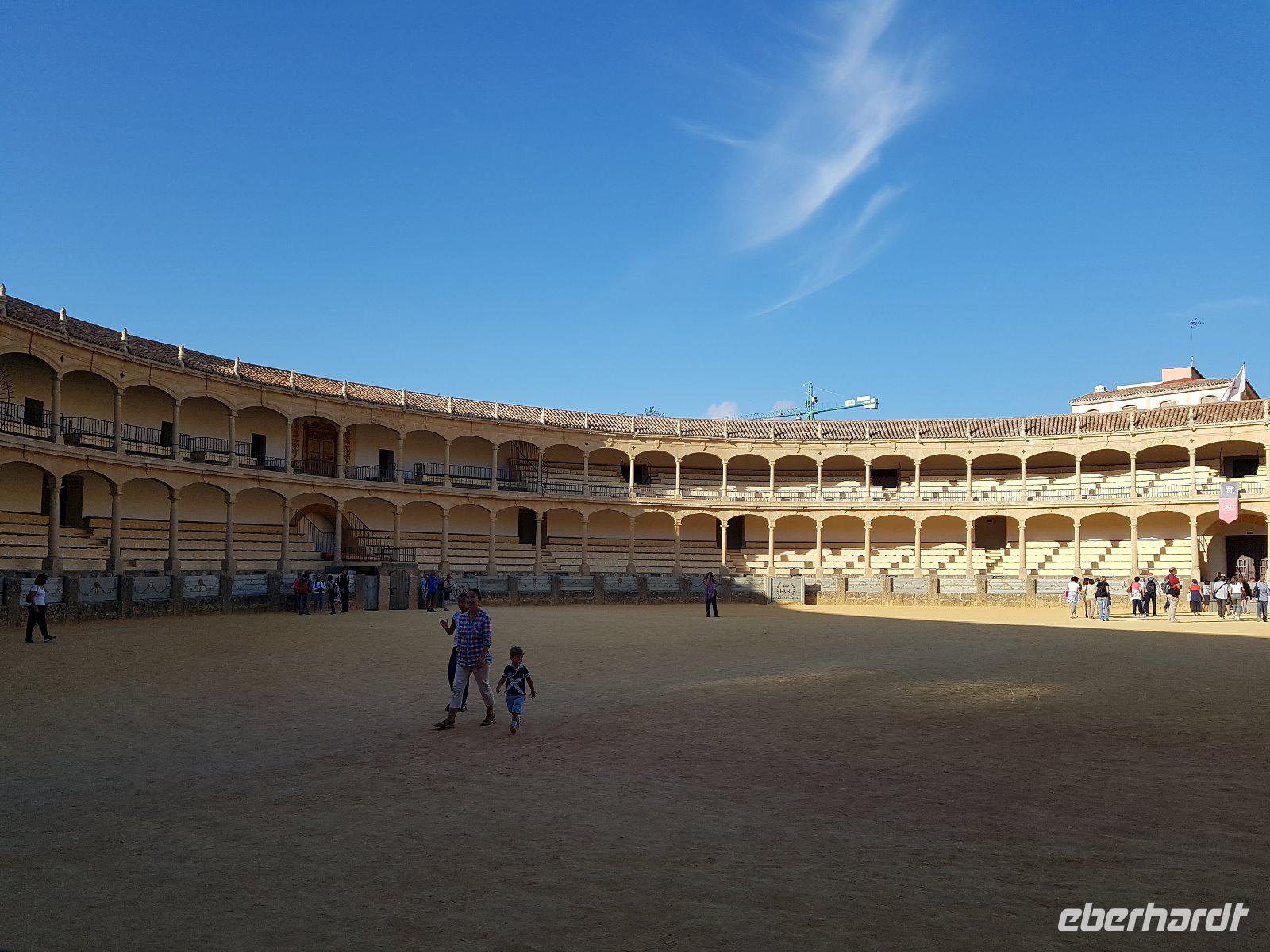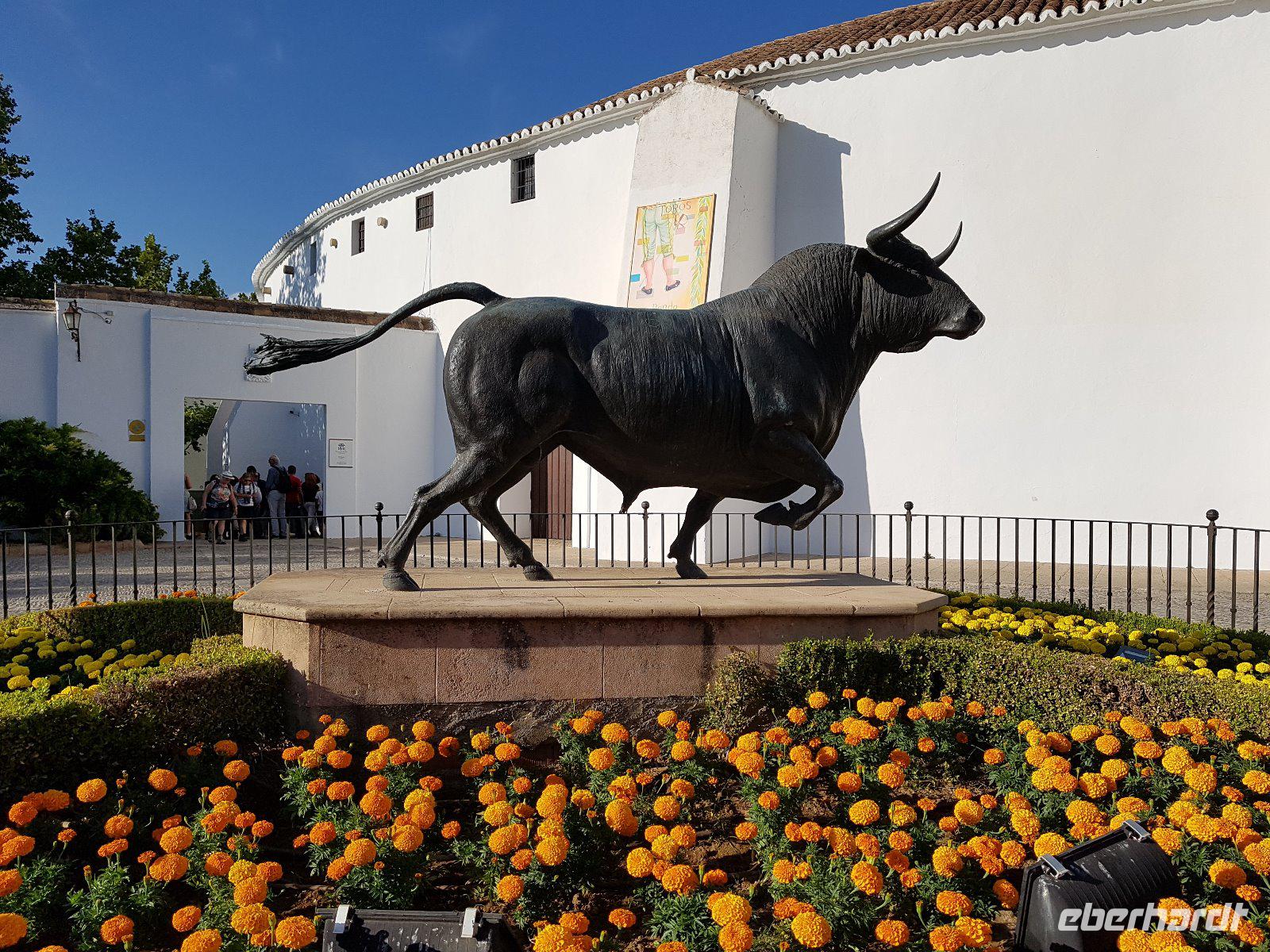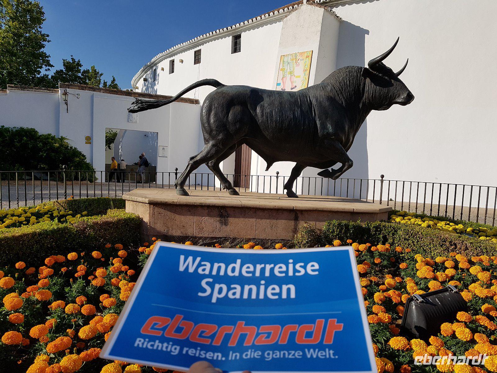 Nachdem wir auf einer Wiese unsere Brötchen gegessen hatten, kehrten wir auf einem einfacheren Weg zum Bus zurück. Wir hielten noch in Grazalema (eines von der Weisen-Dörfer -Route) um dieses winzige kleine Dorf unter den massigen Berge zu erleben. Wir fuhren zurück ins Hotel und hatten Zeit uns im Hotel auszuruhen und frisch zu machen, bevor wir nach Ronda für den Stadtrundgang fuhren. Wir zogen uns chic an und trafen am späten Nachmittag unseren örtlichen Reiseleiter Daniel Stachel in Ronda, der uns diese andalusische Kleinstadt zeigte. Ronda liegt auf einer Höhe von 723 m über dem Meeresspiegel in einer als Serranía de Ronda bekannten Berglandschaft. In Ronda gibt es sozusagen zwei getrennte Städte oder Viertel, die mit einer Brücke über eine Schlucht verbunden sind. Wir besichtigten erstmal die Stierkampf-Arena von außen. Für uns Spanier ist Ronda insbesondere wegen seiner Rolle in der Entwicklung des Stierkampfes von Bedeutung.