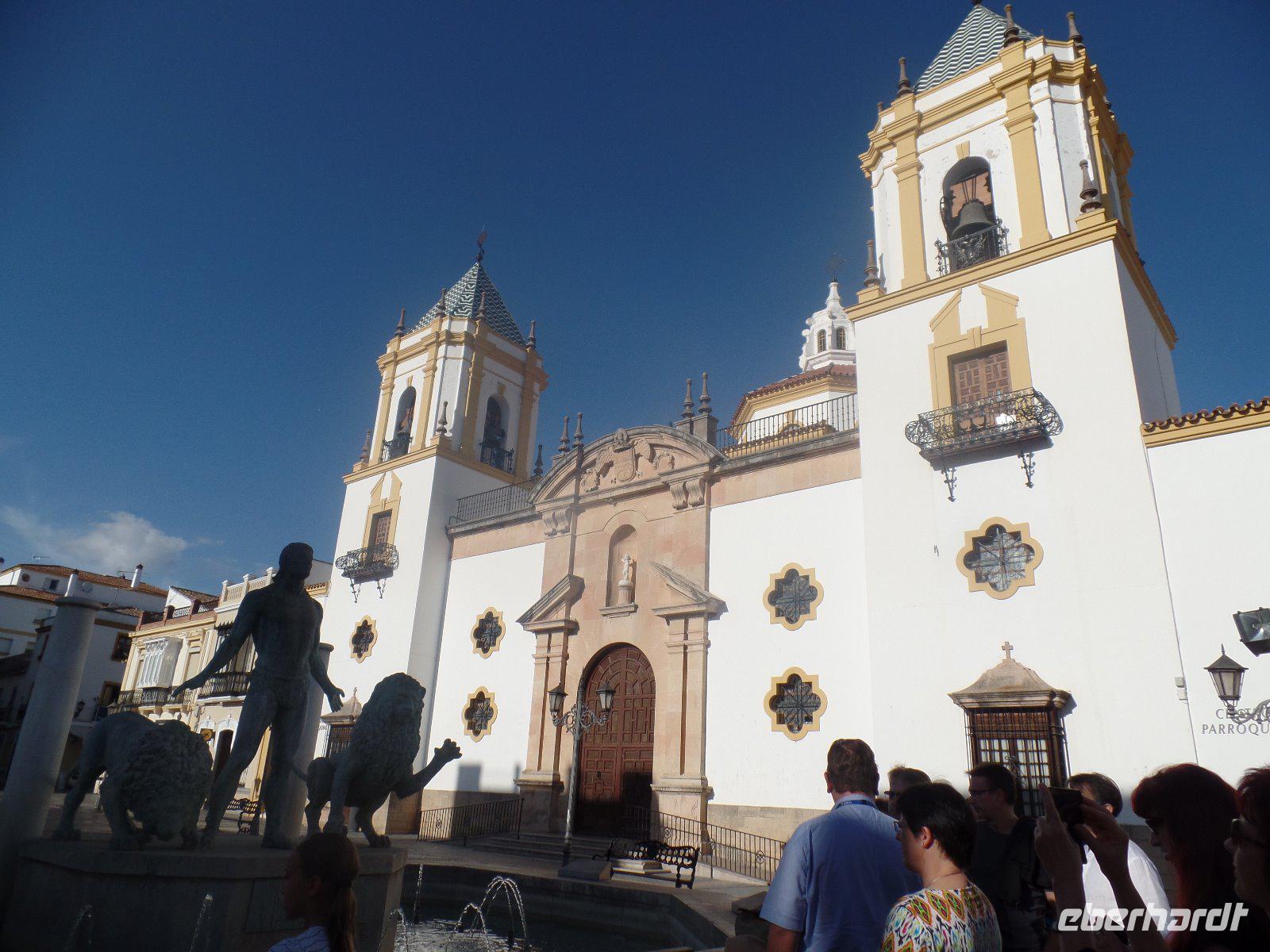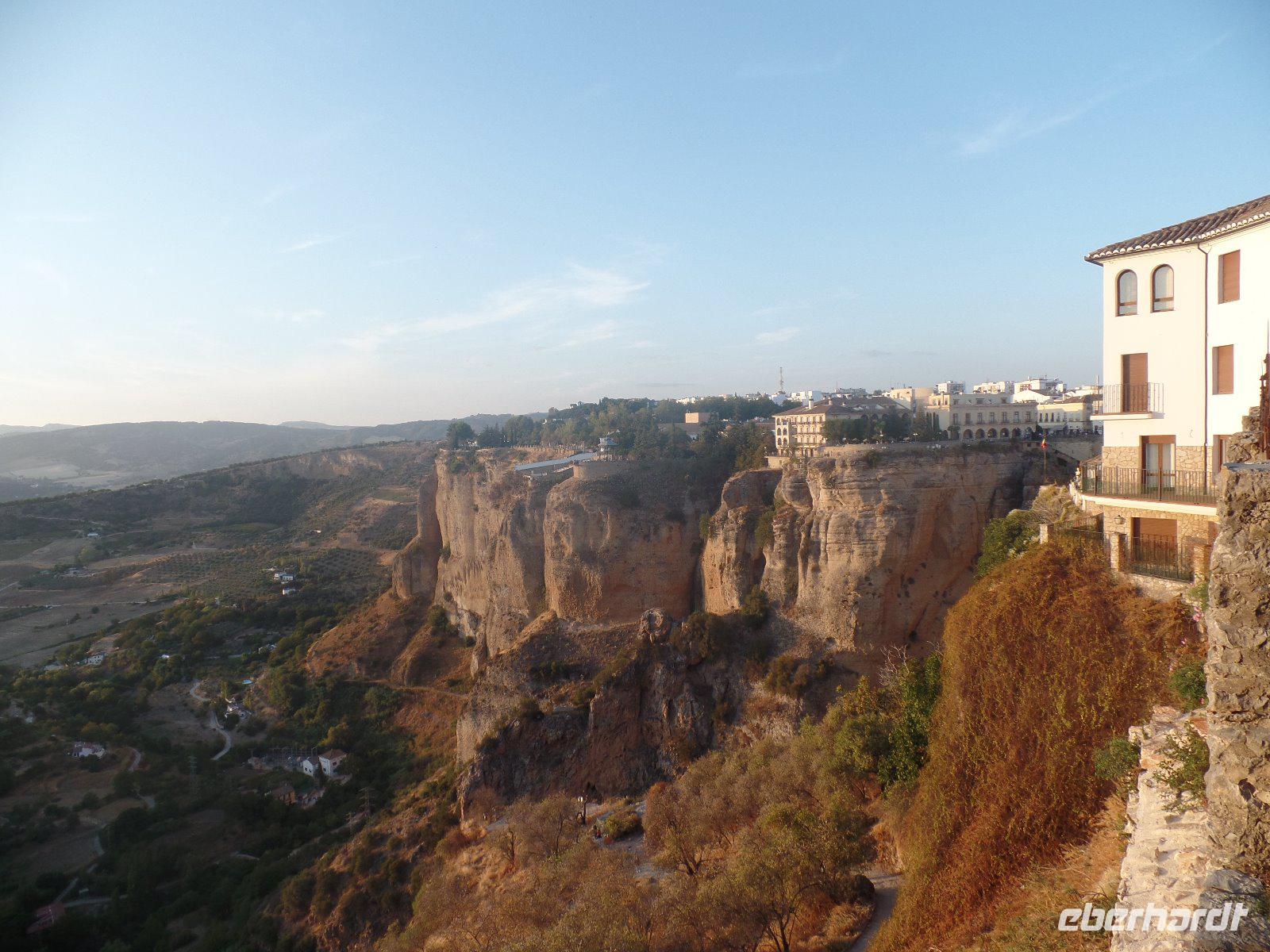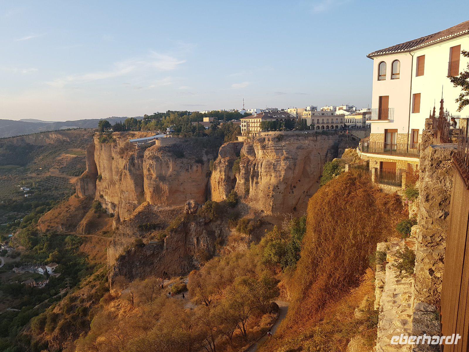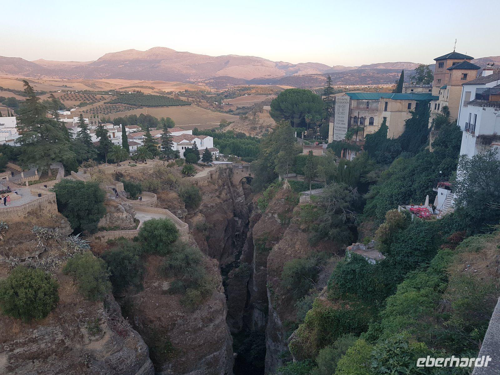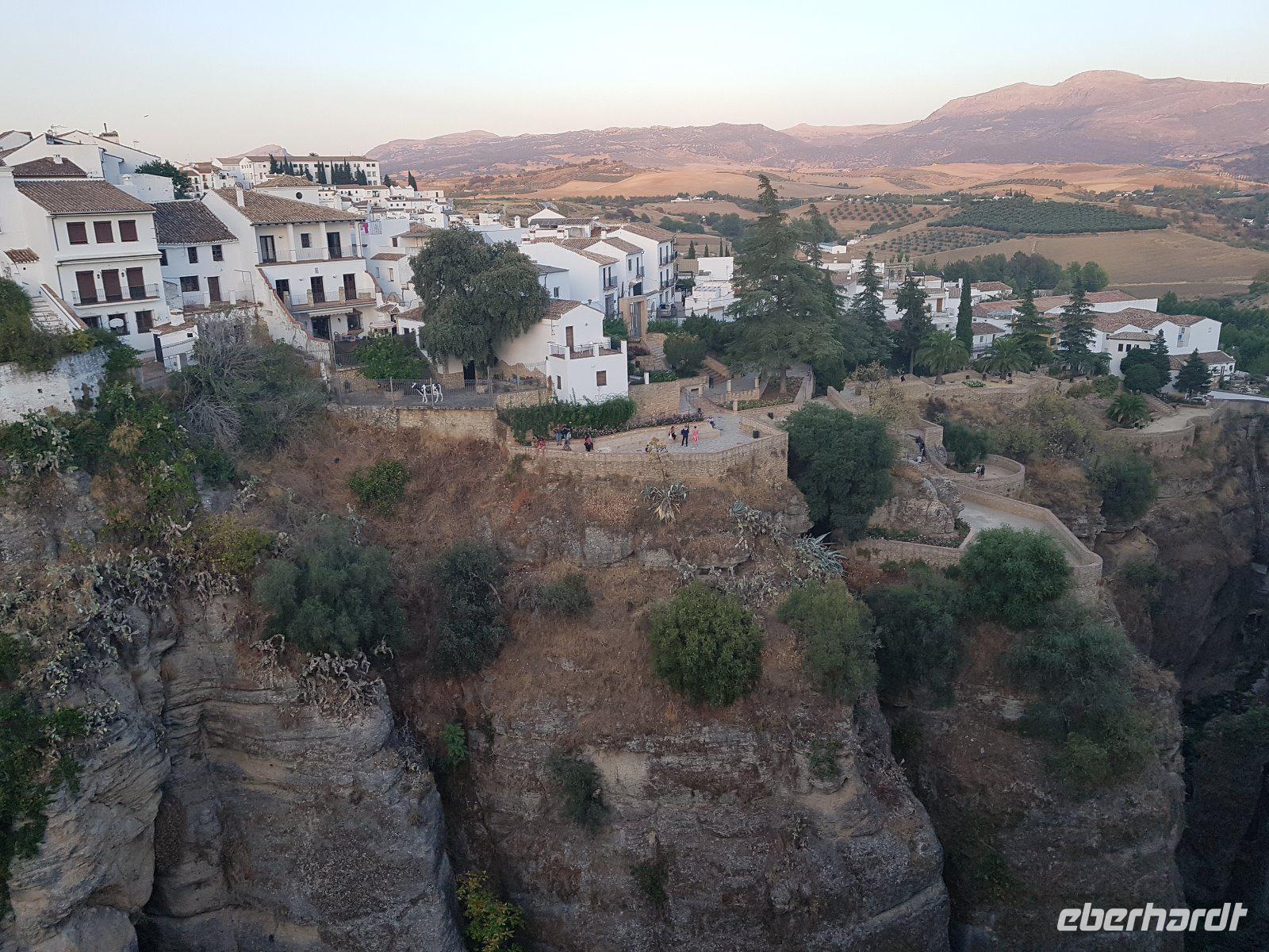 Nachdem wir auf einer Wiese unsere Brötchen gegessen hatten, kehrten wir auf einem einfacheren Weg zum Bus zurück. Wir hielten noch in Grazalema (eines von der Weisen-Dörfer -Route) um dieses winzige kleine Dorf unter den massigen Berge zu erleben. Wir fuhren zurück ins Hotel und hatten Zeit uns im Hotel auszuruhen und frisch zu machen, bevor wir nach Ronda für den Stadtrundgang fuhren. Wir zogen uns chic an und trafen am späten Nachmittag unseren örtlichen Reiseleiter Daniel Stachel in Ronda, der uns diese andalusische Kleinstadt zeigte. Ronda liegt auf einer Höhe von 723 m über dem Meeresspiegel in einer als Serranía de Ronda bekannten Berglandschaft. In Ronda gibt es sozusagen zwei getrennte Städte oder Viertel, die mit einer Brücke über eine Schlucht verbunden sind. Wir besichtigten erstmal die Stierkampf-Arena von außen. Für uns Spanier ist Ronda insbesondere wegen seiner Rolle in der Entwicklung des Stierkampfes von Bedeutung.