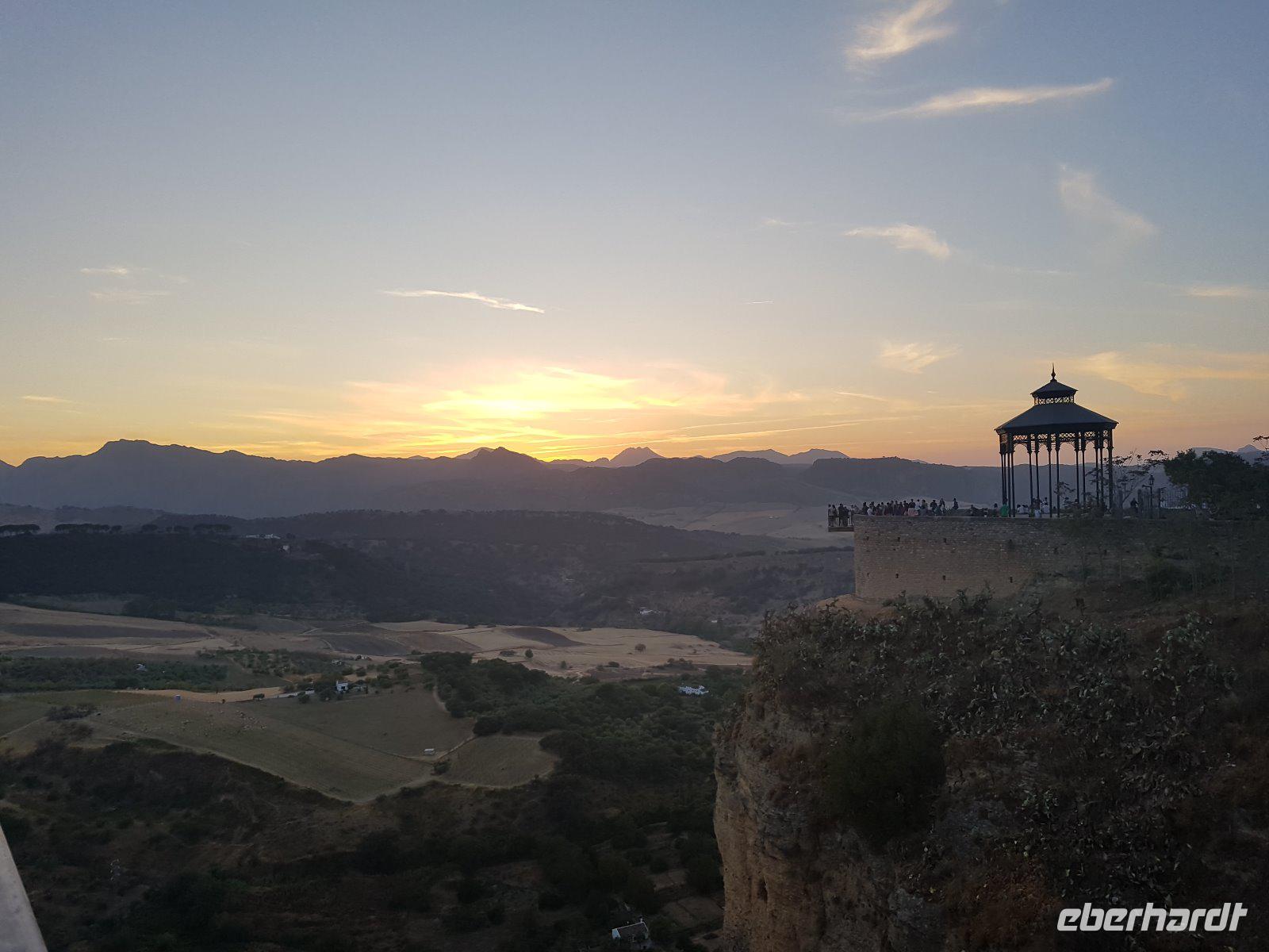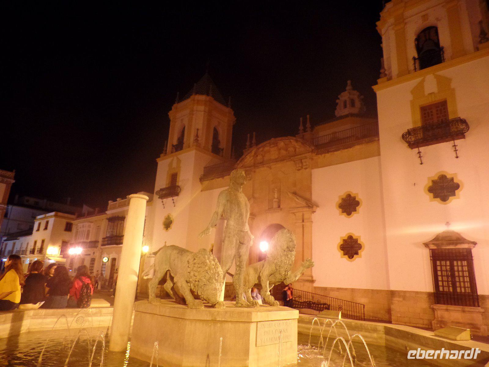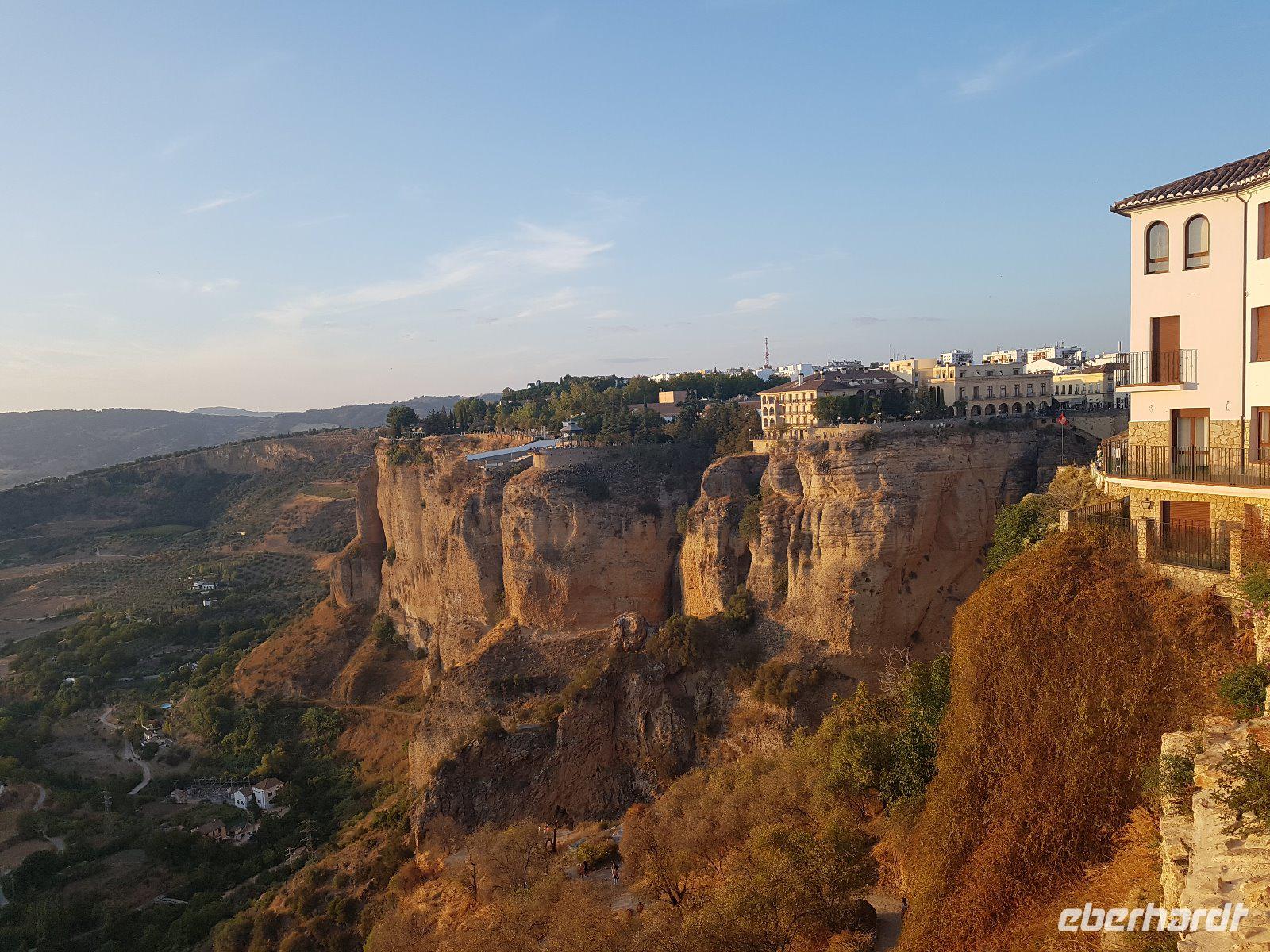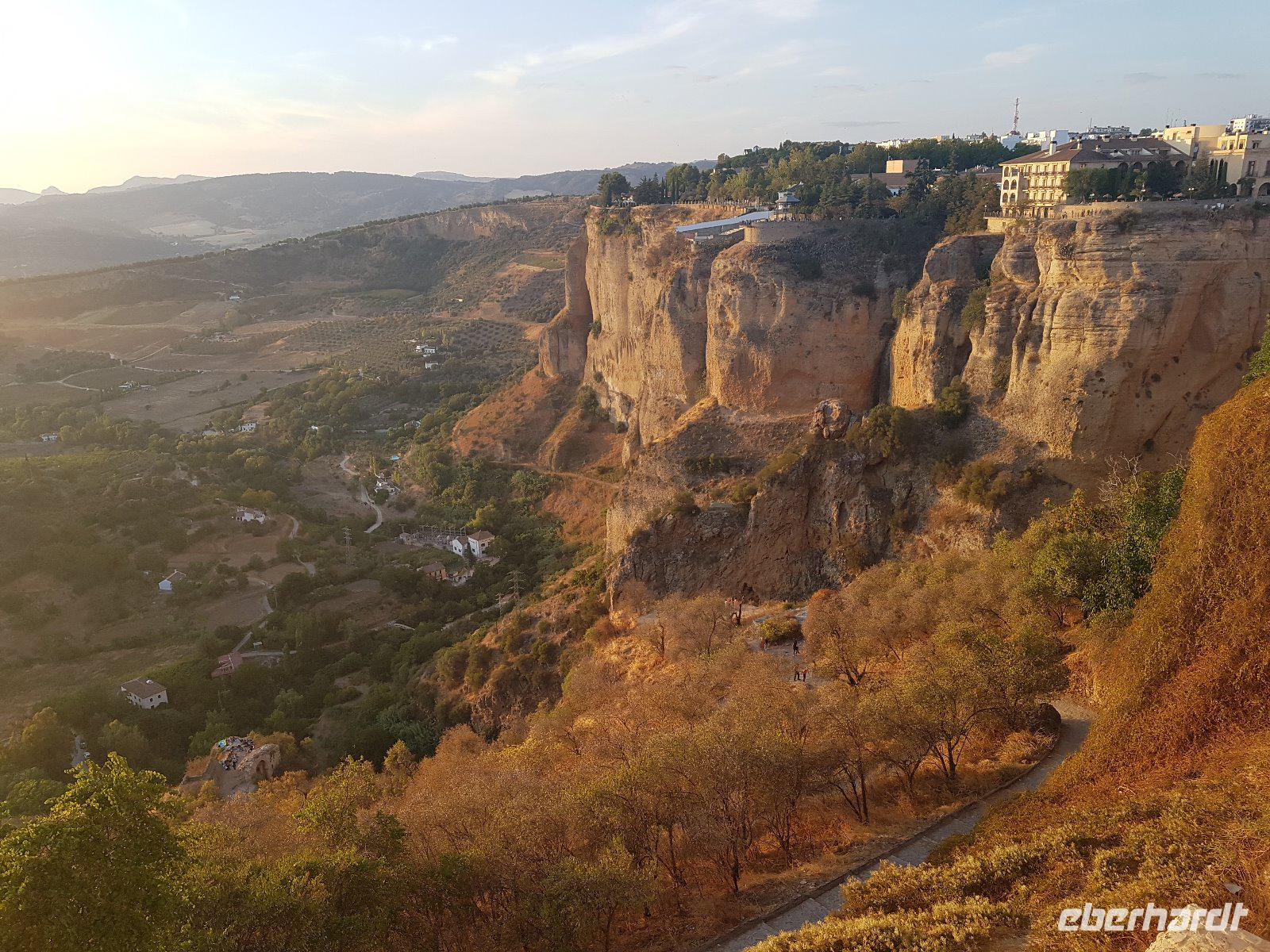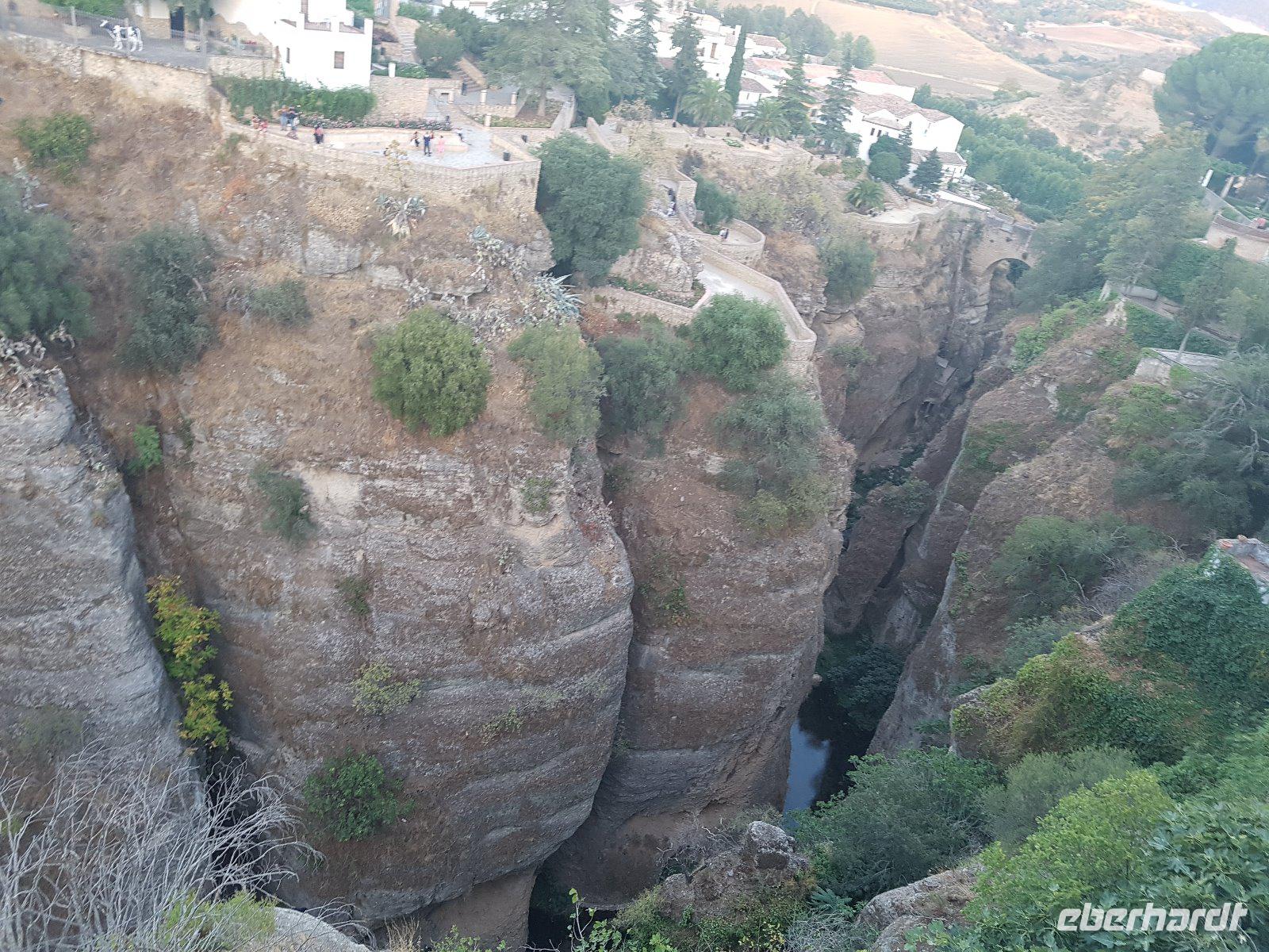 Nachdem wir auf einer Wiese unsere Brötchen gegessen hatten, kehrten wir auf einem einfacheren Weg zum Bus zurück. Wir hielten noch in Grazalema (eines von der Weisen-Dörfer -Route) um dieses winzige kleine Dorf unter den massigen Berge zu erleben. Wir fuhren zurück ins Hotel und hatten Zeit uns im Hotel auszuruhen und frisch zu machen, bevor wir nach Ronda für den Stadtrundgang fuhren. Wir zogen uns chic an und trafen am späten Nachmittag unseren örtlichen Reiseleiter Daniel Stachel in Ronda, der uns diese andalusische Kleinstadt zeigte. Ronda liegt auf einer Höhe von 723 m über dem Meeresspiegel in einer als Serranía de Ronda bekannten Berglandschaft. In Ronda gibt es sozusagen zwei getrennte Städte oder Viertel, die mit einer Brücke über eine Schlucht verbunden sind. Wir besichtigten erstmal die Stierkampf-Arena von außen. Für uns Spanier ist Ronda insbesondere wegen seiner Rolle in der Entwicklung des Stierkampfes von Bedeutung.