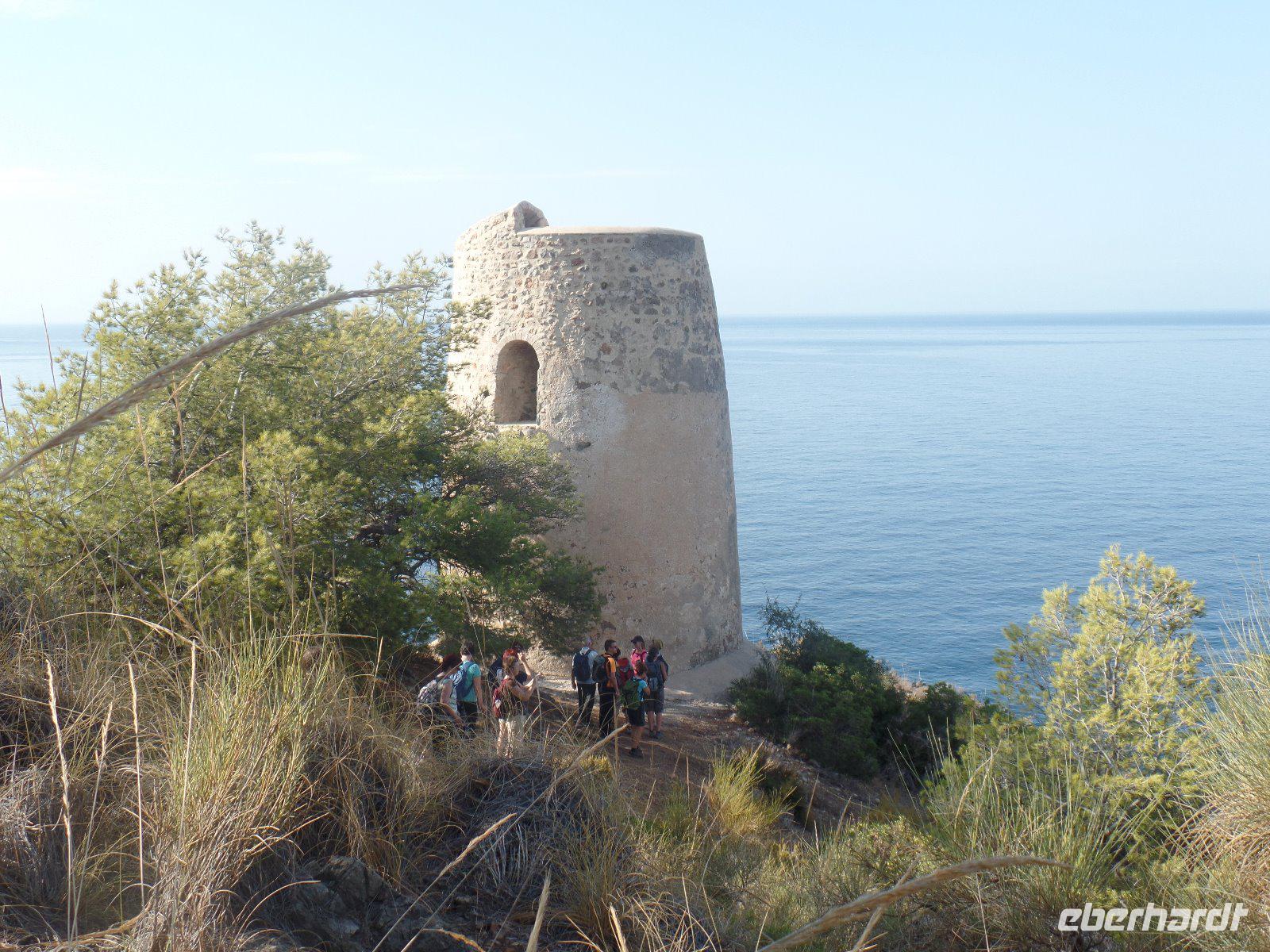 Heute verabschiedeten wir uns vom traumhaften Tal Las Alpujarras und fuhren entlang der Küste in Richtung des Fischerdorfes Almunecar. Dort trafen wir unsere heutige Wander-Reiseleiterin Angela, mit der wir durch einen der schönsten Küstenstreifen von Andalusien wanderten: die Klippen von Maro-Cerro Gordo. Wir gingen durch eine herrliche Landschaft mit abrupten Klippen, heimlichen Buchten und Zistrosen, wilden Oliven, Pinien und flechtenbewachsenen Felsen. Es ging immer am Meer entlang, bis zum „Torre de Caleta", einem alten Wachturm. Hier wurde uns erklärt,dass die ganze Küste im Mittelmeer voll solcher Wachtürme war, für den Fall dass Piraten oder Feinde übers Meer kamen, konnte man ganz schnell mit Feuer oder Rauchsignalen von Turm zu Turm weiter sagen, wo die Gefahr lag. Wir endeten am Cantarrijal-Strand, einer idyllischen Badebucht, wo viele von uns im Meer badeten und in der Sonne etwas tranken. Es war wie Sommer. Das Mittelmeer ist an diese Stelle einfach herrlich mit wunderschönen Buchten und grün-blauem Wasser.