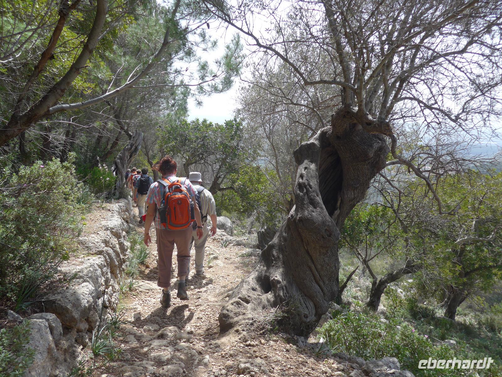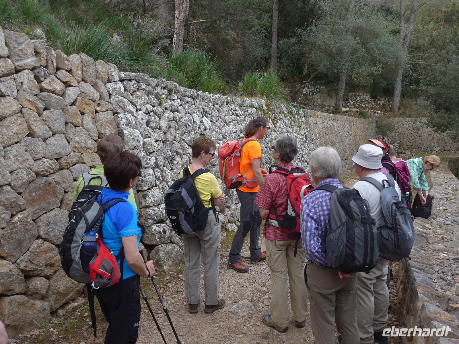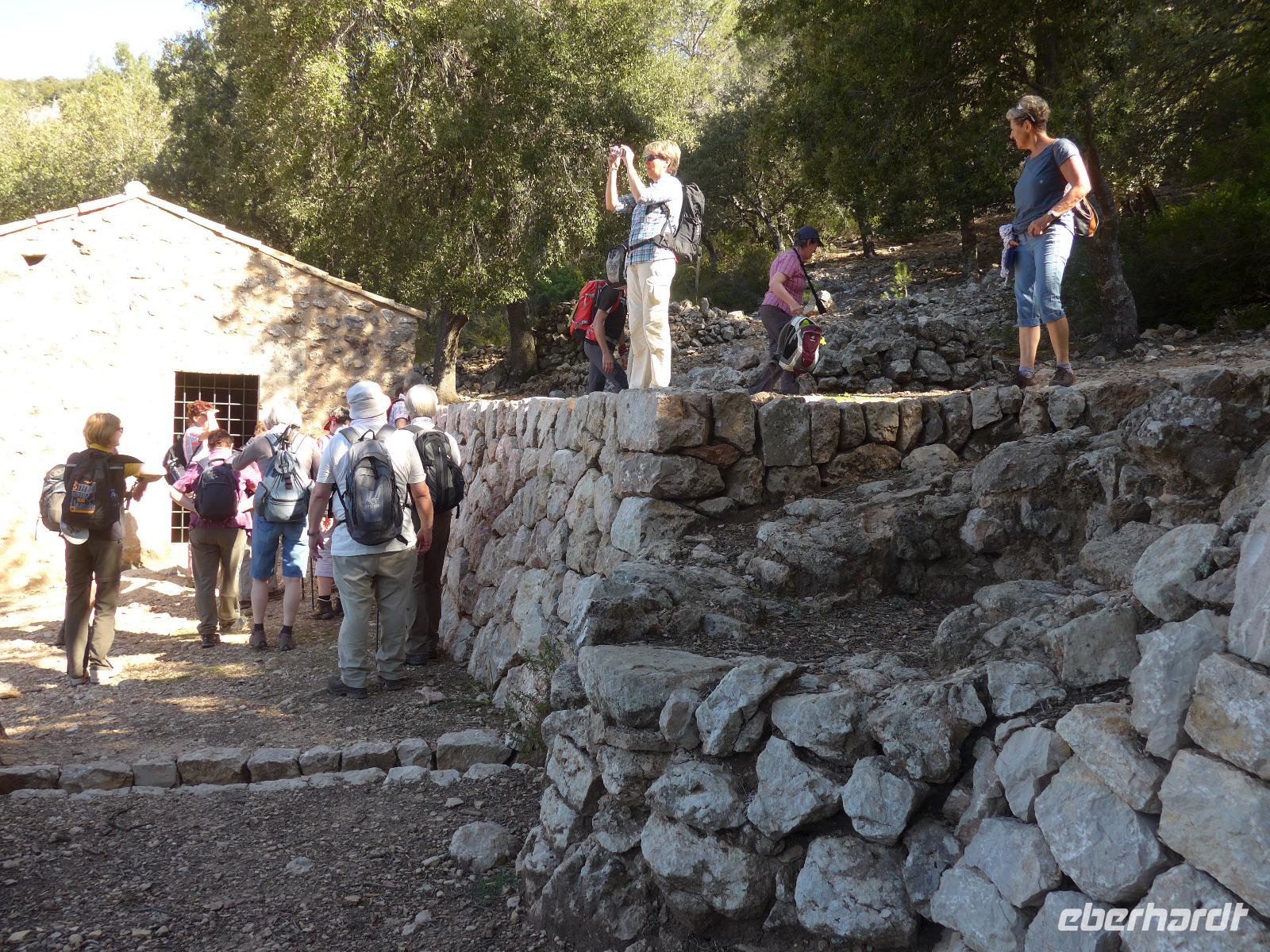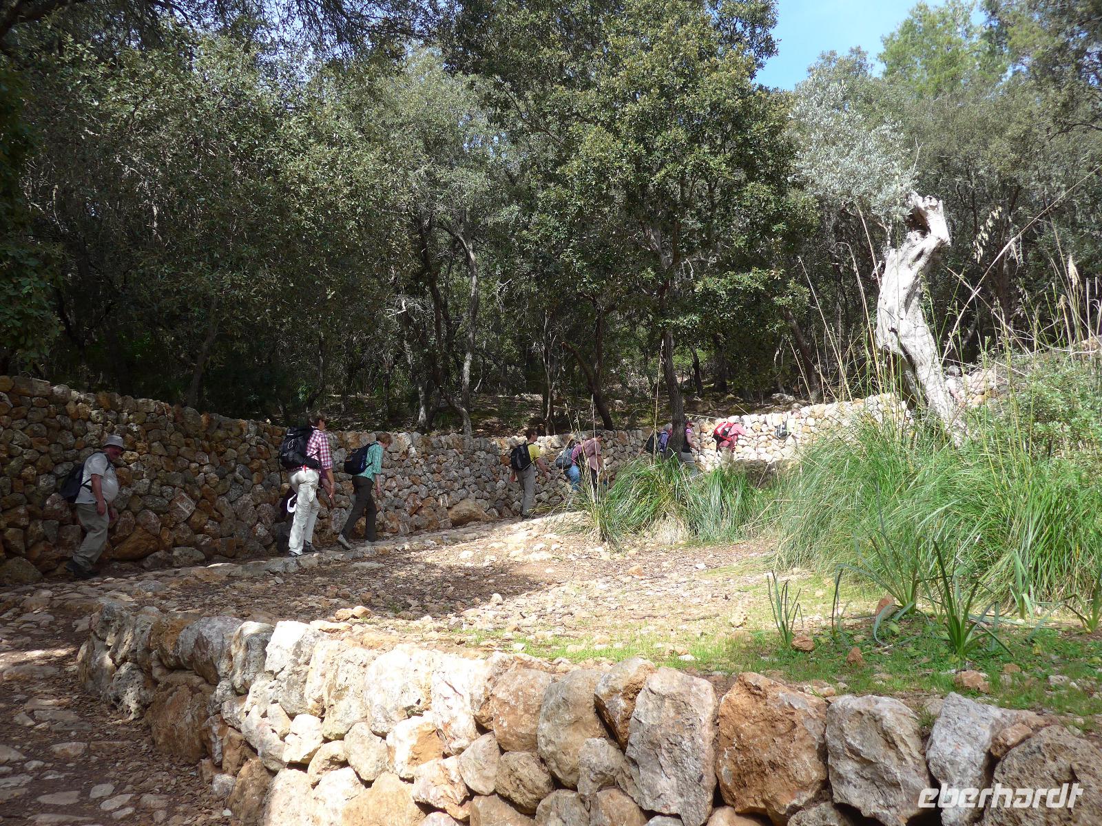 8 Uhr gab es jeden morgen Frühstück und gegen 9 Uhr trafen wir unseren Wanderführer Dieter. Er verteilte die Lunchpakete und Wasser und mit einem Kleinbus fuhren wir nach Esporles. Wir spazierten über die Plaza, an der Kirche vorbei zu unserem Wanderweg Cami des Correu. Es ging gleich mit vielen Stufen los und wir konnten die kunstvollen Trockenmauern bewundern. Auf diesem alten Weg wurde früher nicht nur die Post, sondern auch viele Waren transportiert. An einem alten Kalkofen mit guter Sicht ins Tal bis hin zum Meer machten wir eine kurze Rast und gingen dann weiter durch einen Steineichenwald mit immer wieder guten Aussichten. Zur Mittagsrast verzehrten wir unser Lunchpaket aus dem Rucksack. Der weitere Weg bot uns immer wieder eine gute Aussicht hinüber zum Anwesen des Erzherzog Ludwig Salvator.