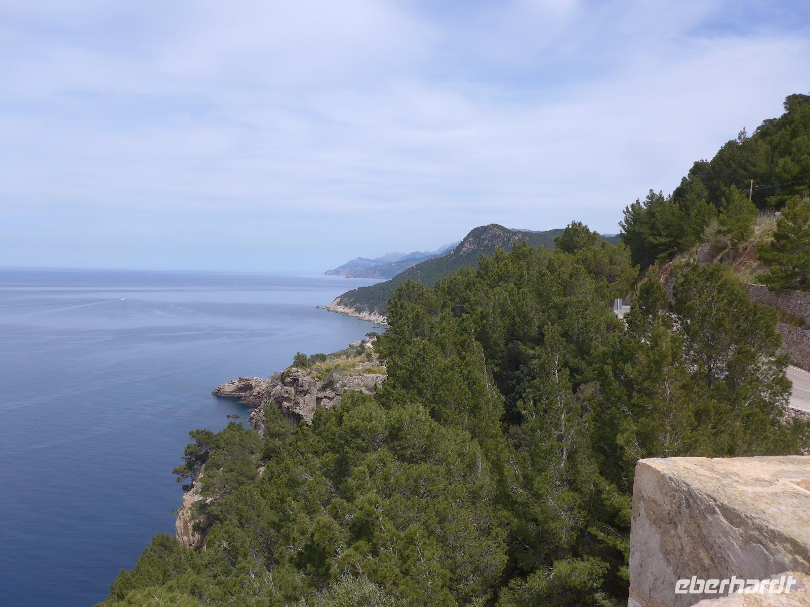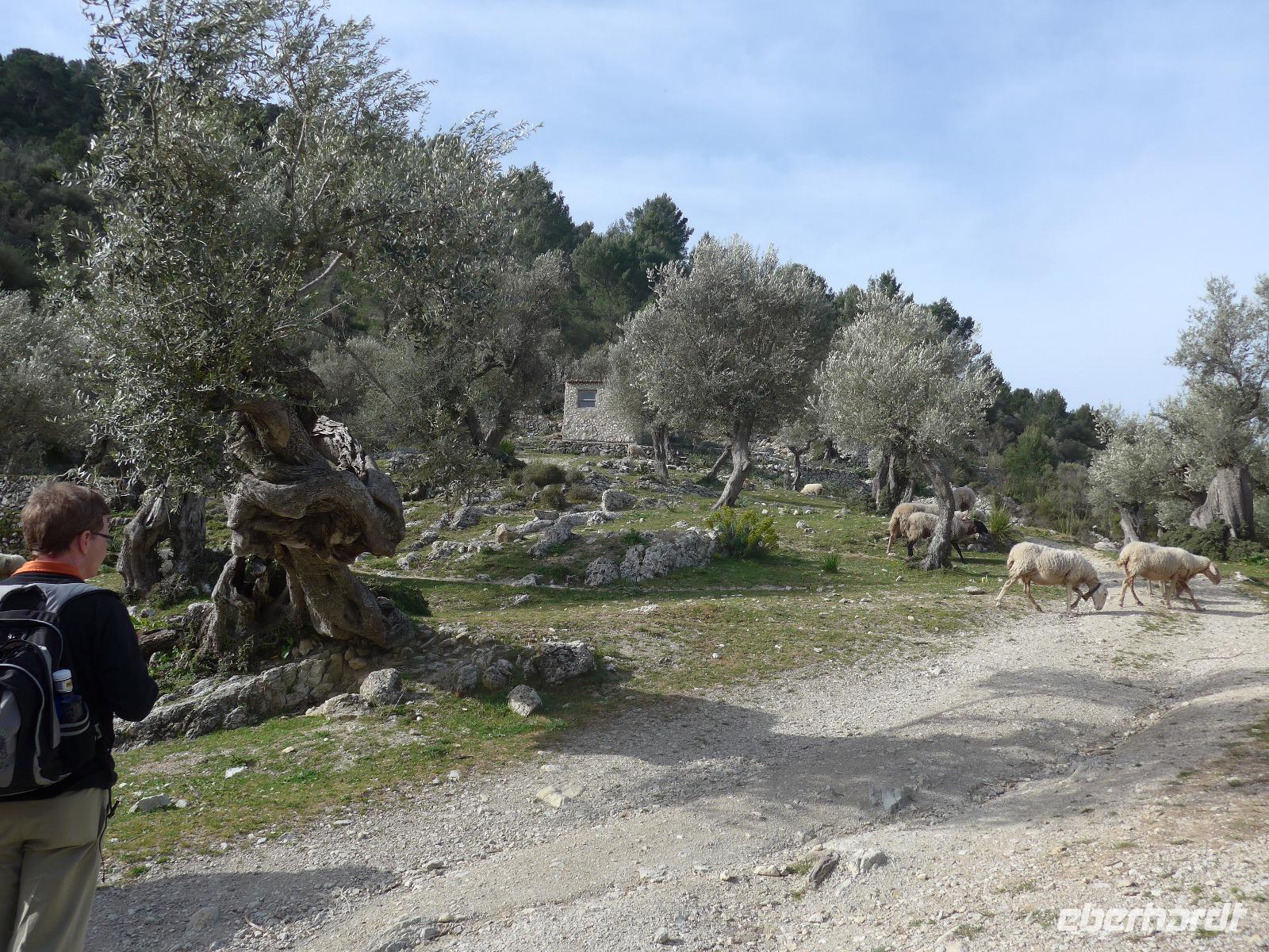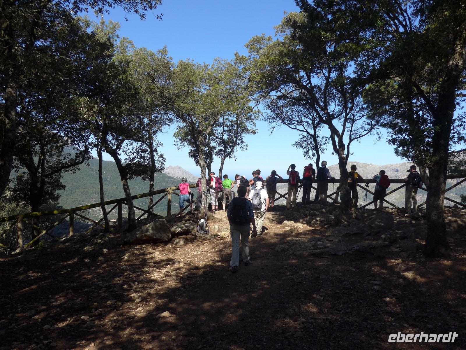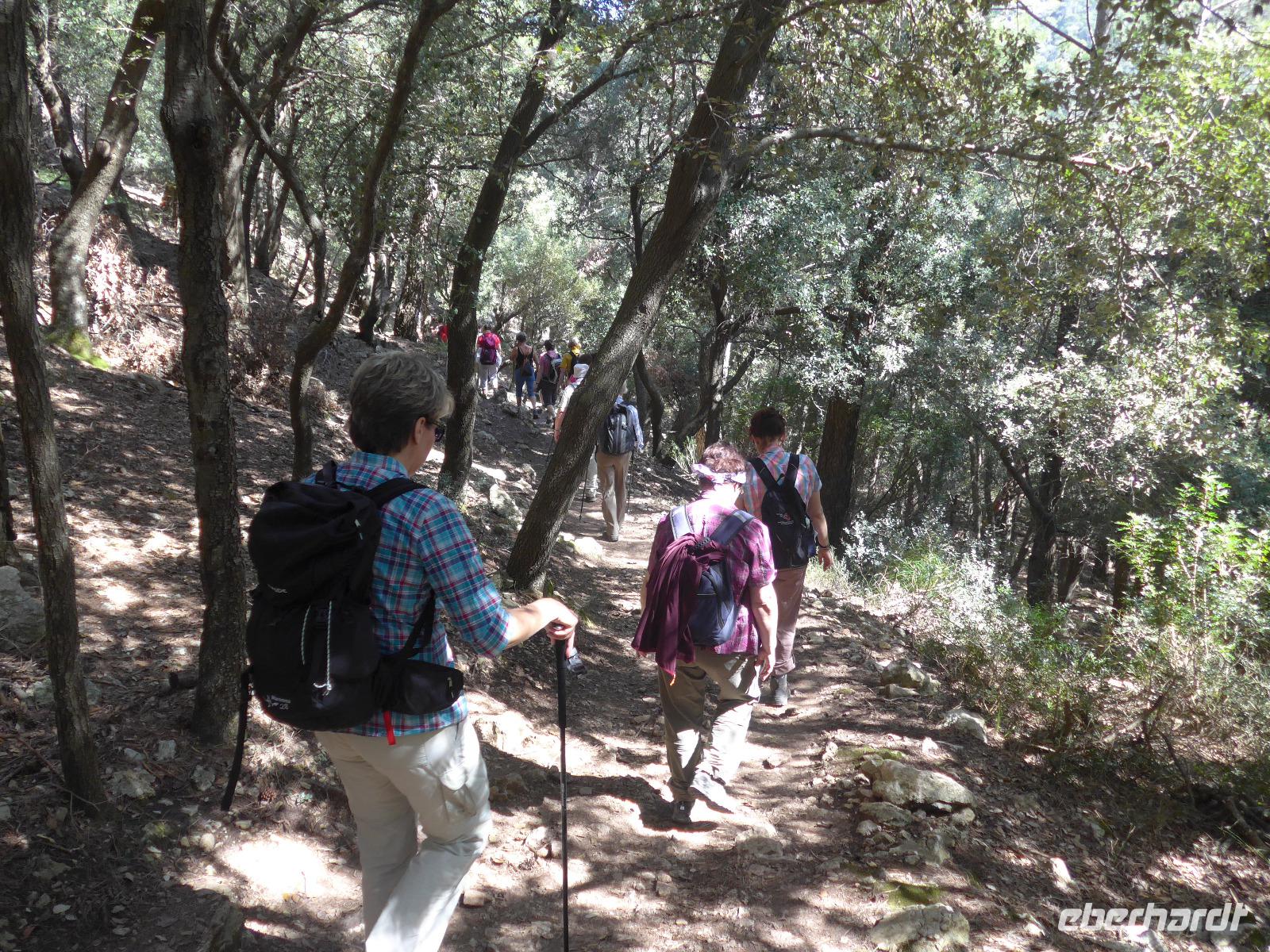 8 Uhr gab es jeden morgen Frühstück und gegen 9 Uhr trafen wir unseren Wanderführer Dieter. Er verteilte die Lunchpakete und Wasser und mit einem Kleinbus fuhren wir nach Esporles. Wir spazierten über die Plaza, an der Kirche vorbei zu unserem Wanderweg Cami des Correu. Es ging gleich mit vielen Stufen los und wir konnten die kunstvollen Trockenmauern bewundern. Auf diesem alten Weg wurde früher nicht nur die Post, sondern auch viele Waren transportiert. An einem alten Kalkofen mit guter Sicht ins Tal bis hin zum Meer machten wir eine kurze Rast und gingen dann weiter durch einen Steineichenwald mit immer wieder guten Aussichten. Zur Mittagsrast verzehrten wir unser Lunchpaket aus dem Rucksack. Der weitere Weg bot uns immer wieder eine gute Aussicht hinüber zum Anwesen des Erzherzog Ludwig Salvator.