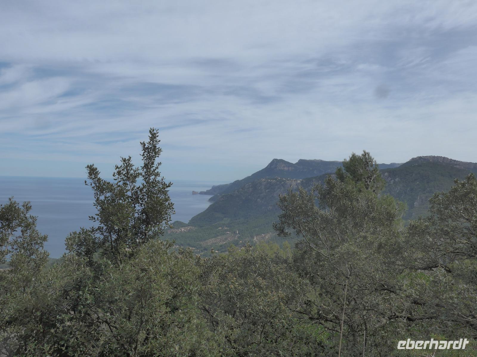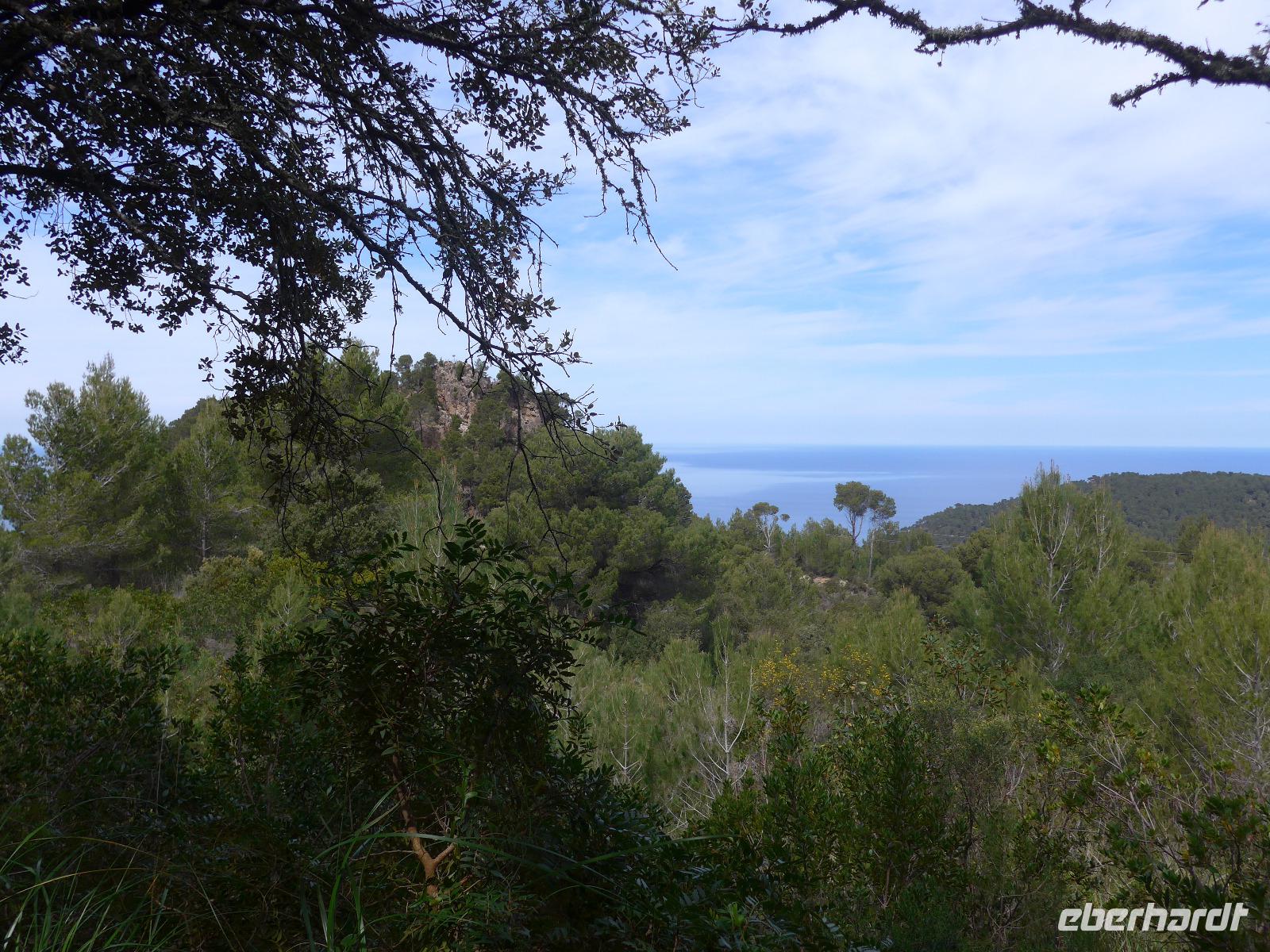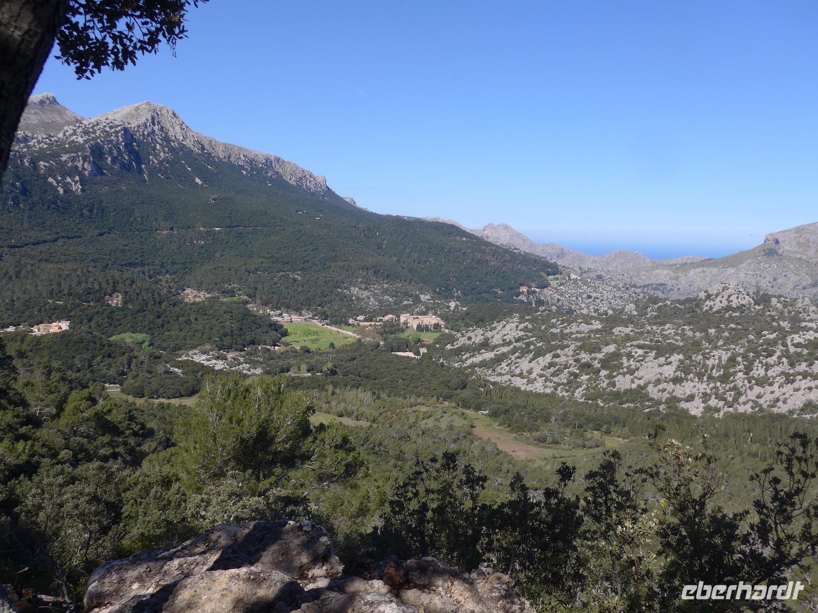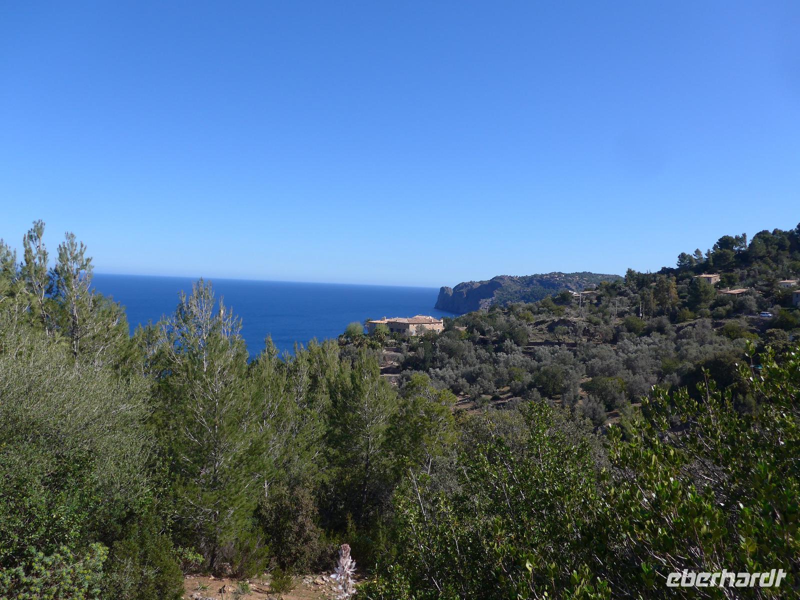 8 Uhr gab es jeden morgen Frühstück und gegen 9 Uhr trafen wir unseren Wanderführer Dieter. Er verteilte die Lunchpakete und Wasser und mit einem Kleinbus fuhren wir nach Esporles. Wir spazierten über die Plaza, an der Kirche vorbei zu unserem Wanderweg Cami des Correu. Es ging gleich mit vielen Stufen los und wir konnten die kunstvollen Trockenmauern bewundern. Auf diesem alten Weg wurde früher nicht nur die Post, sondern auch viele Waren transportiert. An einem alten Kalkofen mit guter Sicht ins Tal bis hin zum Meer machten wir eine kurze Rast und gingen dann weiter durch einen Steineichenwald mit immer wieder guten Aussichten. Zur Mittagsrast verzehrten wir unser Lunchpaket aus dem Rucksack. Der weitere Weg bot uns immer wieder eine gute Aussicht hinüber zum Anwesen des Erzherzog Ludwig Salvator.