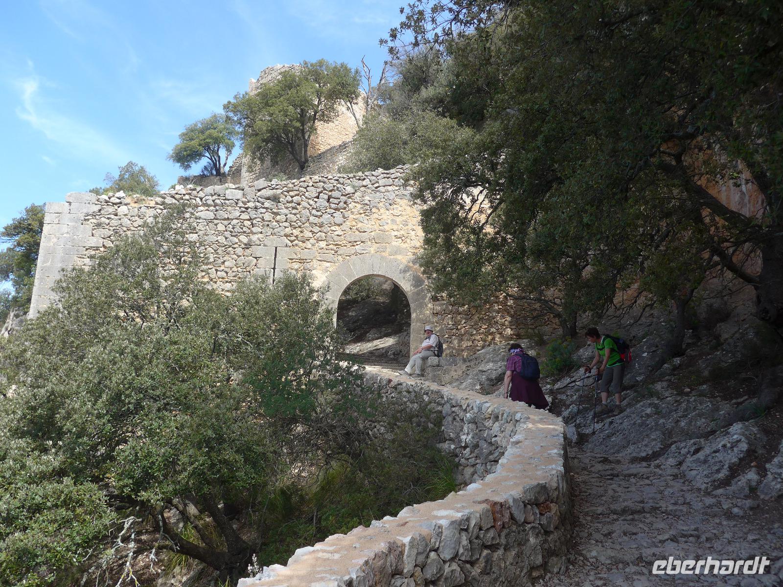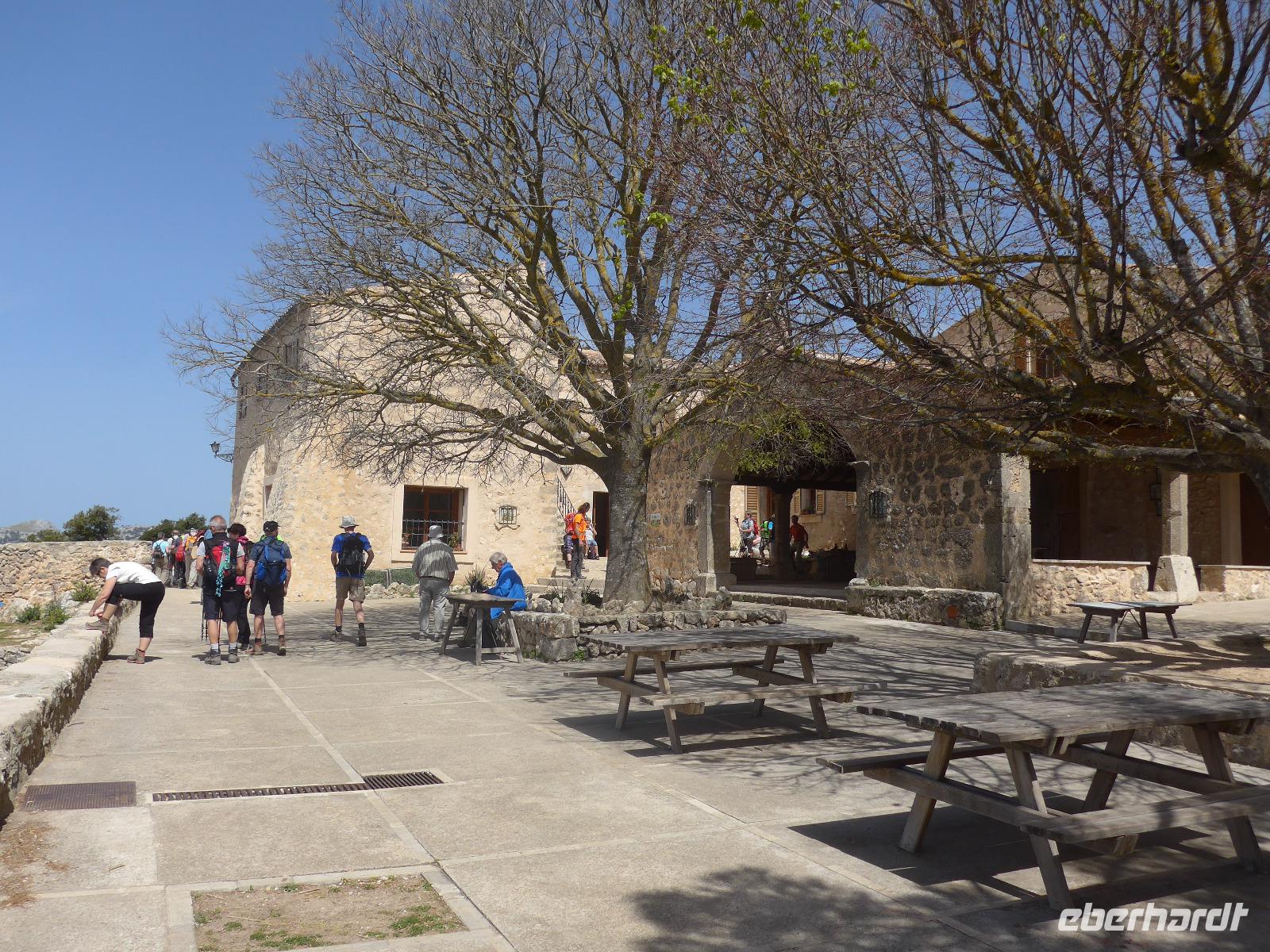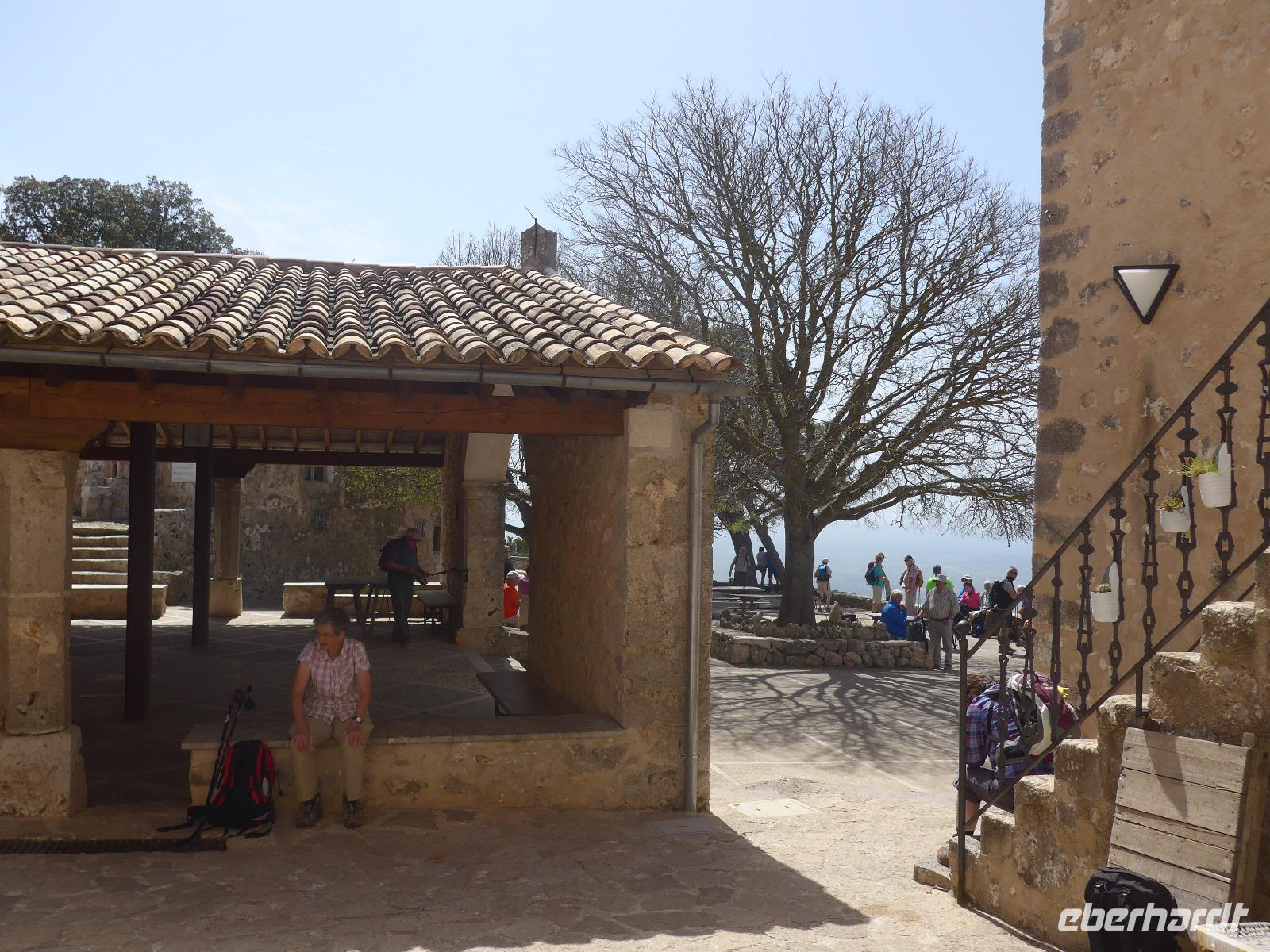 An dieser zusätzlichen Wanderung nahmen alle Singles bis auf unsere Verletzte teil. Mit Fahrer David ging es zum Coll d`Òrient auf 500 Meter Höhe. Dort begann unsere Wanderung. Durch eine Schafweide mit vielen alten Olivenbäumen stiegen wir gemächlich bergan. Dann ging es hinein in den Steineichenwald und der Weg wurde steiler bis wir ein kleines Plateau mit einem Parkplatz erreichten. Dort konnten wir das mächtige Castell durch die Bäume schon sehen. Für die "Autotouristen" war der weitere Weg hinauf mit vielen Stufen versehen und in einem sehr guten Zustand. Schließlich erreichten wir das erste Burgtor und sahen tief unten unser Lokal für das Mittagessen. Wir liefen an den Mauern entlang bis zur Herberge und dort gab es zur Überraschung einen guten Kaffee. Die Sicht weit ins Land war leider nicht ganz klar, aber bis zur Hauptstadt Palma de Mallorca konnten wir gut sehen.