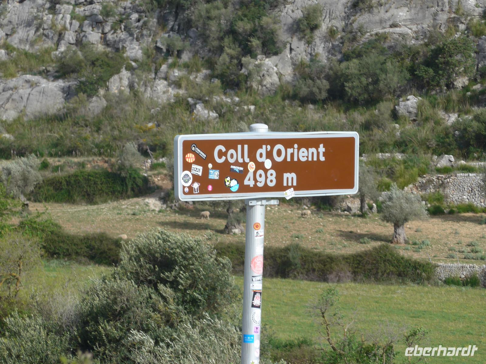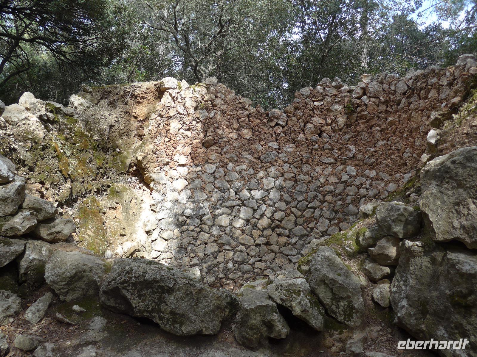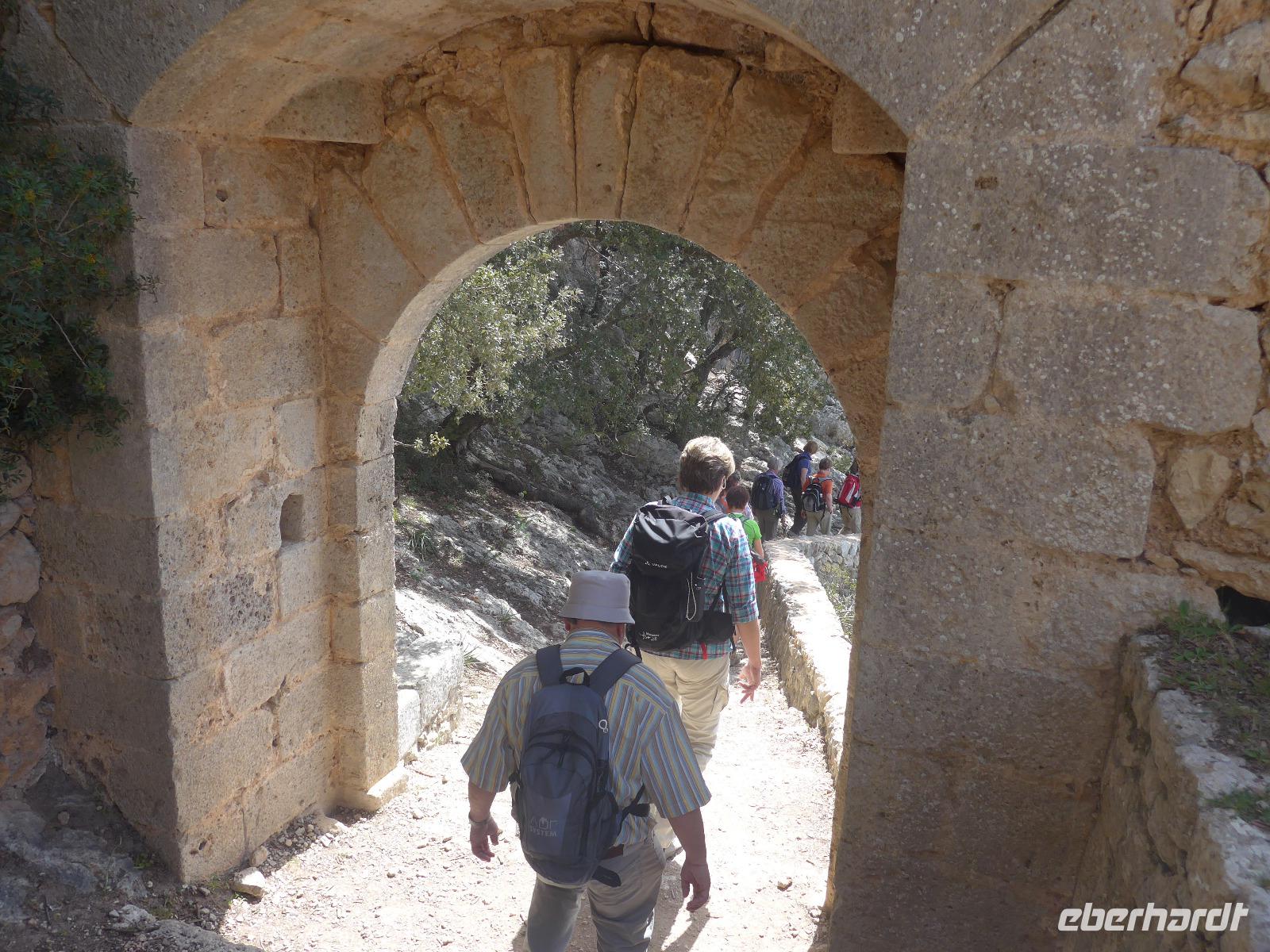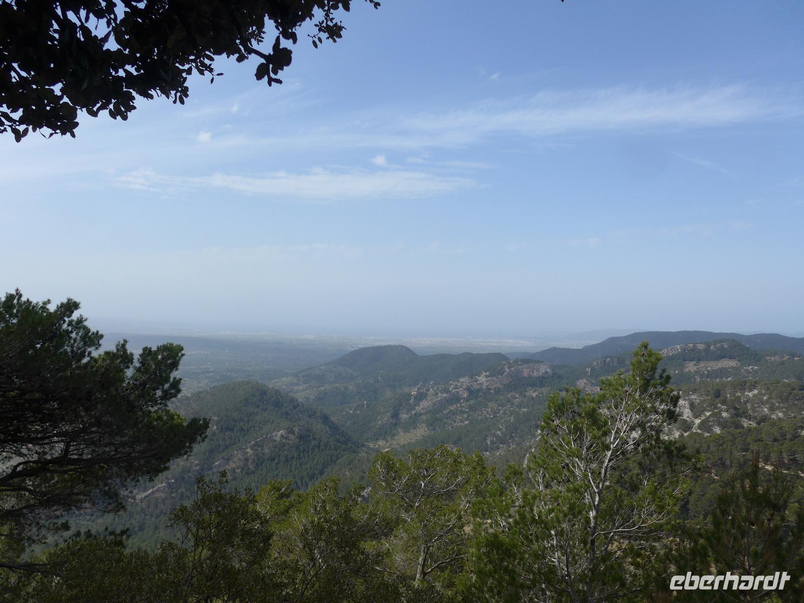 An dieser zusätzlichen Wanderung nahmen alle Singles bis auf unsere Verletzte teil. Mit Fahrer David ging es zum Coll d`Òrient auf 500 Meter Höhe. Dort begann unsere Wanderung. Durch eine Schafweide mit vielen alten Olivenbäumen stiegen wir gemächlich bergan. Dann ging es hinein in den Steineichenwald und der Weg wurde steiler bis wir ein kleines Plateau mit einem Parkplatz erreichten. Dort konnten wir das mächtige Castell durch die Bäume schon sehen. Für die "Autotouristen" war der weitere Weg hinauf mit vielen Stufen versehen und in einem sehr guten Zustand. Schließlich erreichten wir das erste Burgtor und sahen tief unten unser Lokal für das Mittagessen. Wir liefen an den Mauern entlang bis zur Herberge und dort gab es zur Überraschung einen guten Kaffee. Die Sicht weit ins Land war leider nicht ganz klar, aber bis zur Hauptstadt Palma de Mallorca konnten wir gut sehen.