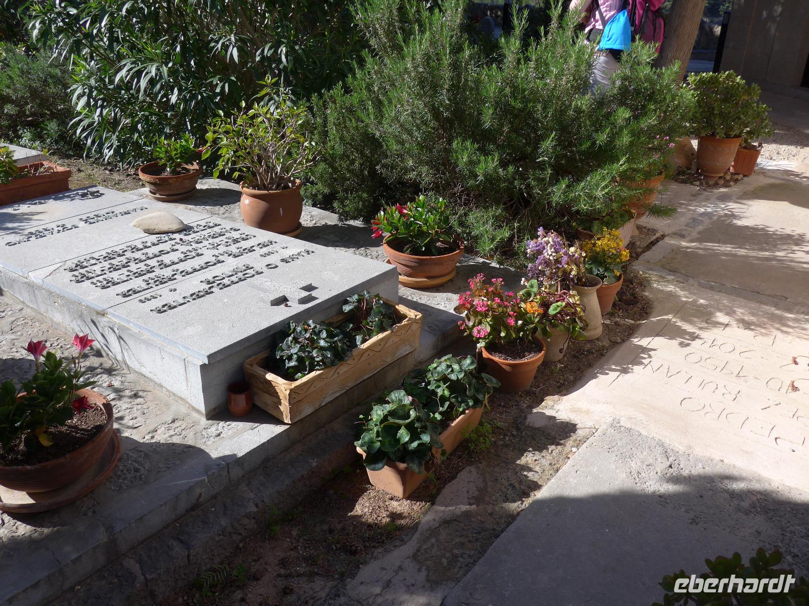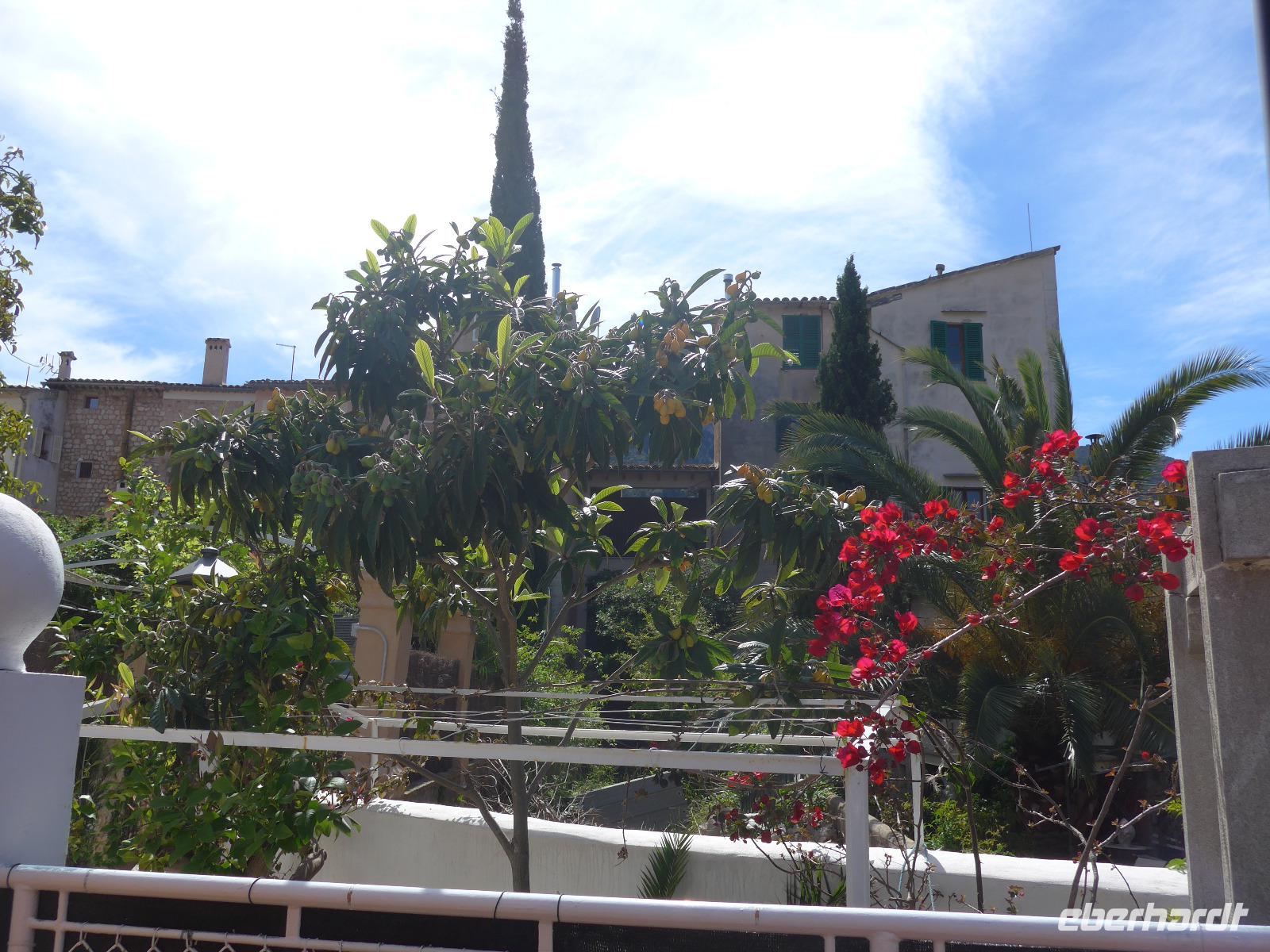 Heute bekamen wir einen ganz neuen Bus, der uns nach Deia brachte. Wir fuhren über Valdemossa und Dieter erzählte uns von der ersten Touristengruppe - Frederic Chopin und George Sand, die hier den Winter 1838/39 im Kloster verbrachten. Aber auch Mallorcas wichtigste Heilige - Catalina Tomas wurde hier 1531 geboren und dadurch berühmt und heilig gesprochen, weil ihre Gebeine nicht verwesten nach ihrem Tod. Dann kamen wir am Anwesen des Erzherzogs Ludwig Salvator vorbei und konnten den kleinen weißen Pavillon gut sehen, der neben den Haus steht und Motiv auf vielen Postkarten ist. In Deia spazierten wir zunächst hinauf zum Friedhof und zur Kirche und danach begann unsere Wanderung auf einem viel begangenem Weg nach Port de Soller. Wir trafen unterwegs viele Wanderer und wagemutige Radfahrer. Unser Platz für die Mittagsrast bot eine traumhafte Aussicht auf die höchsten Berge der Tramuntana mit dem Puig Major. Wieder ein guter Platz für ein Gruppenfoto. Unser Weg führte an alten Terrassen mit Oliven- und Johannesbrotbäumen vorbei und dann war auch schon die geschützte Bucht von Port de Soller zu sehen. Wir gingen steil bergab bis zum Strand.