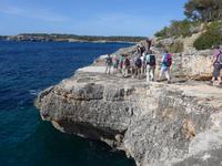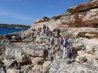 Heute gab es kein Lunchpaket für Jeden, sondern ganz viele verschiedene „Zutaten“ für ein Picknick. Die Sachen wurden auf die Rücksäcke verteilt und so trug ein Jeder zum Gelingen des Picknicks bei. Zunächst aber fuhren wir mit dem Bus gen Osten und Dieter berichtete über den Getreideanbau auf Mallorca und den wieder in Mode gekommenen Urweizen. Außerhalb von Porto Pedro stiegen wir aus und begaben uns an die Küste. Der Weg führte an steilen Abbrüchen vorbei und wir mußten ständig rauf und runter steigen. Das Meer war von hellblau über türkis bis dunkelblau gefärbt und in den Steinen fanden wir Abdrücke von Muscheln. Wir mußten jede Bucht umlaufen und hätten gern auch gebadet. Aber Dieter hatte Feuerquallen entdeckt und so verzichteten wir auf den Badespaß. Das Wetter war traumhaft, Sonne, Wind und milde Temperaturen begleiteten unsere Wanderung.
