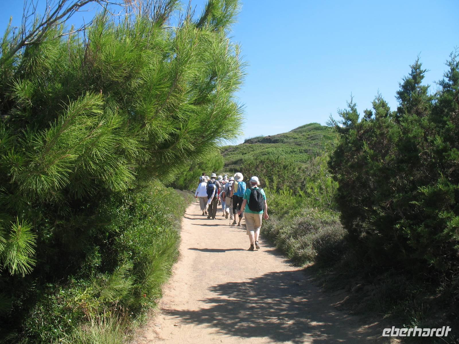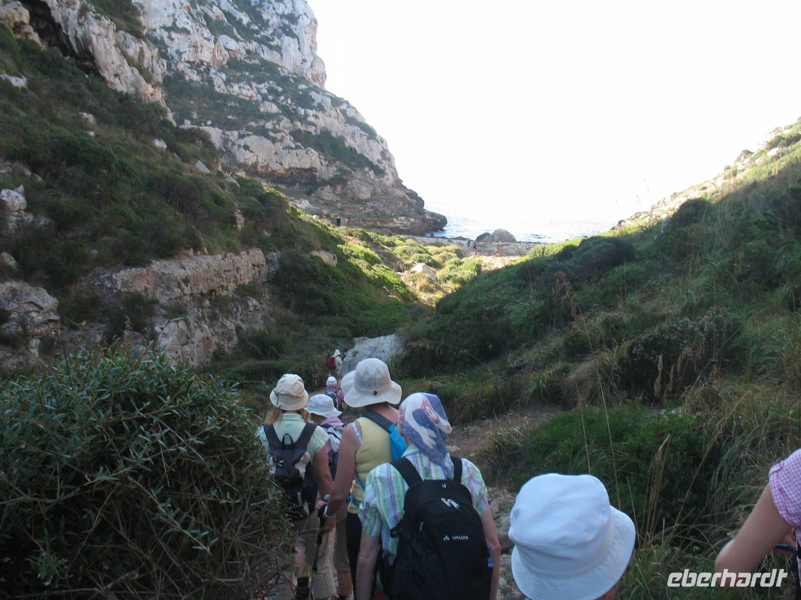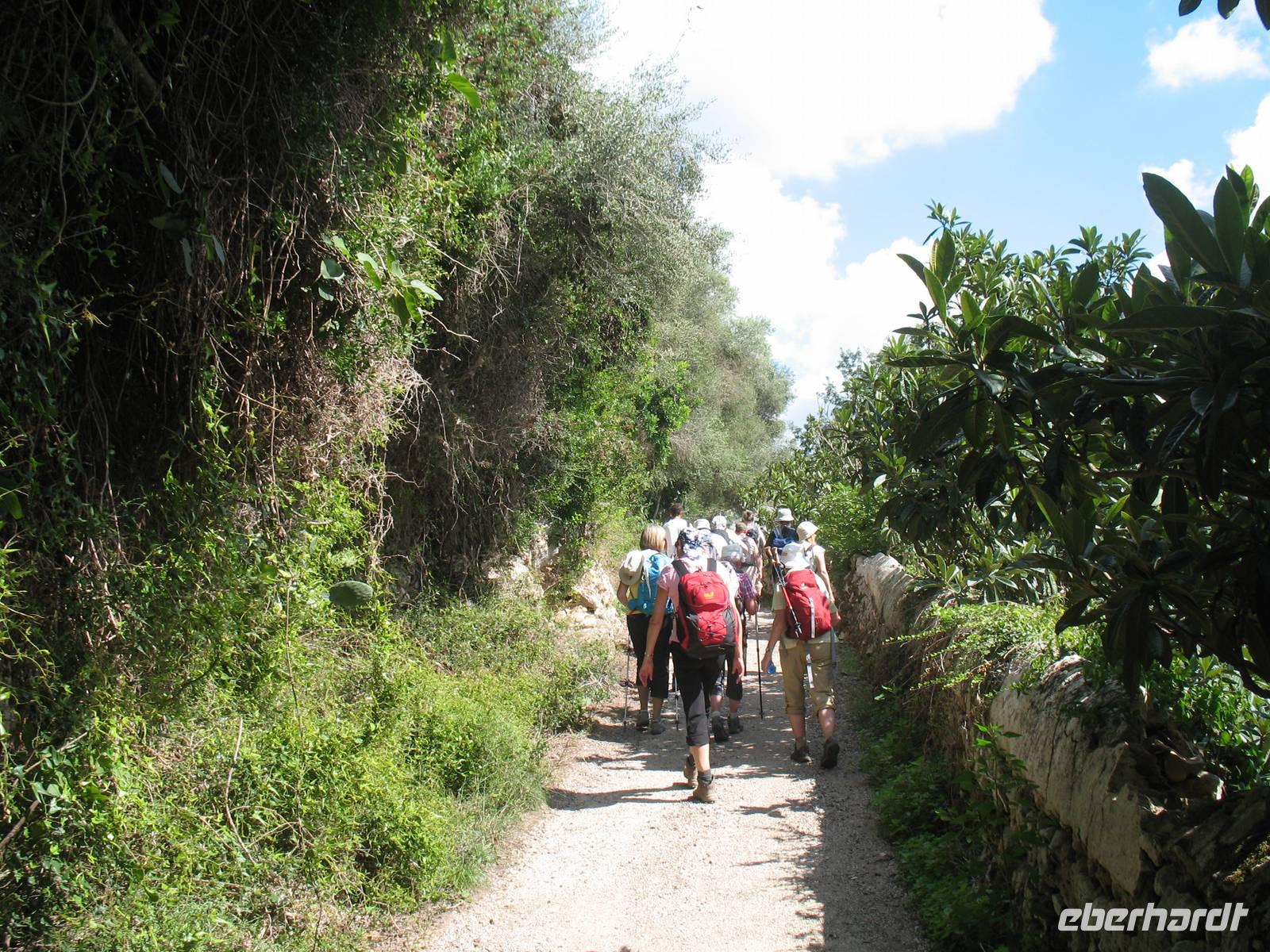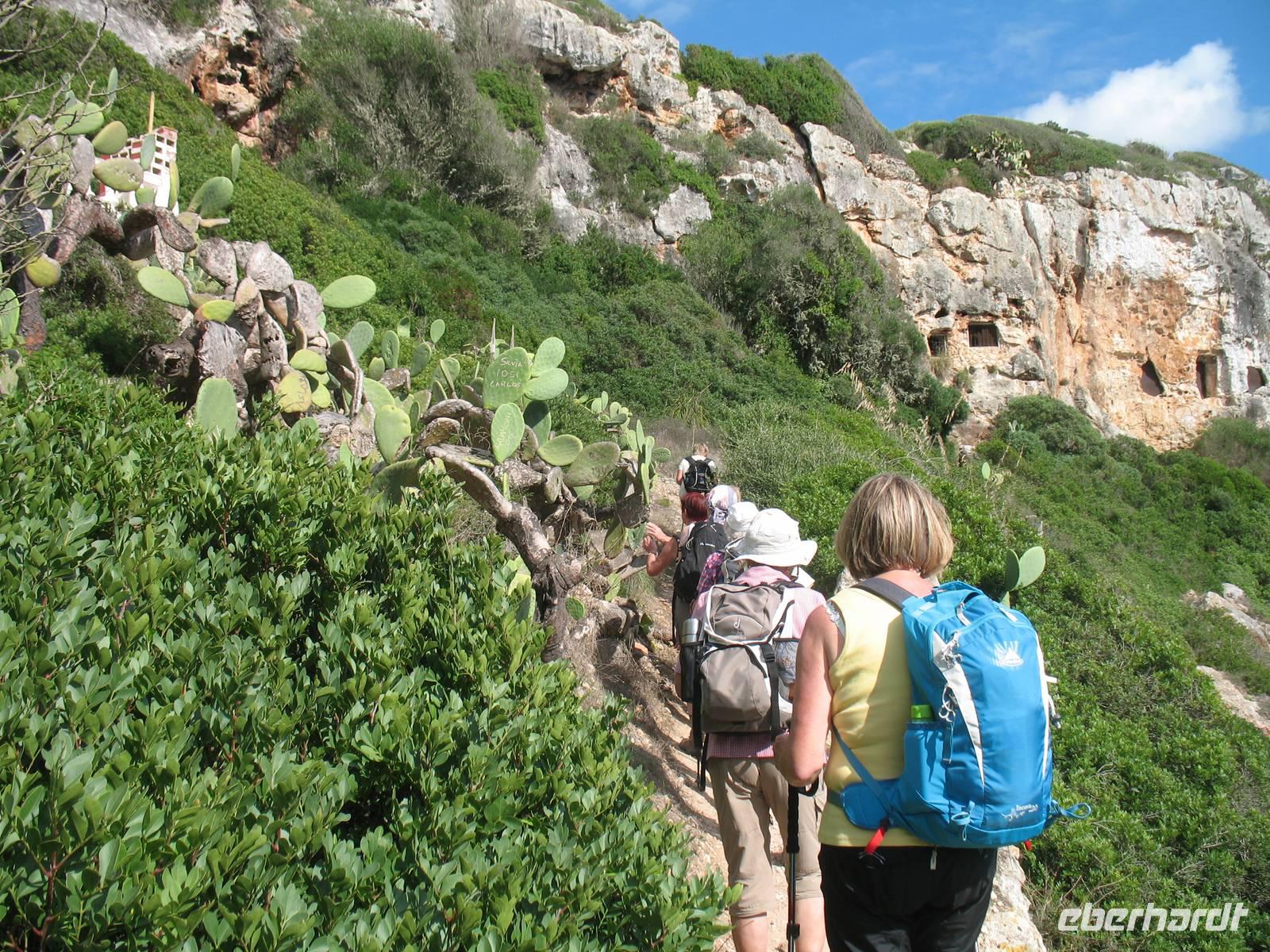 Bei strahlendem Sonnenschein starten wir in einen spannenden Tag :-) Das Frühstück ist sehr lecker und wir finden uns frisch gestärkt zu unserem heutigen Ausflug oder Wanderung in der Hotellobby ein. Während sich die Wanderer noch ihr Lunchpaket abholen, starten unsere Gäste mit kulturellem Programm mit ihrem Reiseführer Otto zum Naveta des Tudons, welche die berühmteste prähistorische Grabanlage Menorcas ist. Das Bauwerk in Form eines umgedrehten Schiffes wurde aus Trockenmauerwerk in der Bauweise der Megalithkultur in der Bronzezeit vor über 3.000 Jahren errichtet. Nächste Etappe ist ein nicht geplanter, aber überraschend schöner Besuch im Steinbruchmuseum - Pedreres de S'Hostal. Die Stiftung für die Steinbrüche des Marés aus Menorca, die Líthica - Pedreres De S'Hostal, ist für die Wahrung, Sanierung und Wiederherstellung der Steinbrüche seit 1994 verantwortlich. Im Gartenlabyrinth, dem "Jardins De S'Hostal - El Laberint Dels Vergers", können die verschiedenen Steinbrüche zum Beispiel der Orangenbäume, der Ölbäume, der Mandelbäume, der Olivenbäume, der Hartlaubgewächse, des Wäldchen, der Dornen, der Zitronenbäume oder der Granatäpfel bestaunt werden. Zudem gibt es noch einen mittelalterlichen Garten mit von Essig-Rose (Rosa gallica), Bauernrose (Alba maxima) oder Heckenrose (Rosa canina) eingebetteten Brunnen oder auch den medizinischen Kräutergarten. Den Vormittag verbringen unsere Gäste dann in Ciutadella. Am westlichsten Punkt der Insel gelegen, wurde die zweitgrößte Stadt Menorcas einst von Karthagern gegründet und war lange Zeit die Insel-Hauptstadt. Mehr als die Hälfte der rund 70.000 Einwohner der Inseln leben in der Hauptstadt Maó - Mahón und auch Ciutadella. Bei einem Stadtrundgang lernen sie die malerischen Altstadtgassen kennen und haben auch Zeit für eine individuelle Erkundung. Gegen späten Nachmittag sind unsere Rundreise-Gäste wieder im Hotel zurück. Während das kulturelle Programm sehr entspannt ist, haben die Wanderer heute eine zwar abwechslungsreiche geführte Wanderung im Süden Menorcas, welche aber auch sehr anstrengend werden wird. Wilde und liebliche Schluchten, mauergesäumtes Bauernland, weiße Sandbuchten und prähistorische Grabhöhlen in der Felsküste zeichnen diese Wanderung auf dem Camí de Cavalls, dem Pferdeweg, aus. Dieser Pferdeweg diente früher militärischen Zwecken und er folgt der Küstenlinie einmal rund um die gesamte Insel Menorcas, circa 220 Kilometer. Von Son Bou aus, dem längsten Strand Menorcas, passieren wir die abrupte wilde Schlucht von Llucalari, queren das Hochplateau mit seinem endlos scheinenden Netz von Steinmauern und den im Frühling bunt blühenden Feldern, folgen dem Verlauf des Barranc des Rellotge, wo heute noch windgeschützt die größten Obstbaumplantagen der Insel zu finden sind. Diese Schlucht stößt am Strand von Cala en Porter wieder aufs Meer. Die Wanderung ist eigentlich ganz angenehm, nur bei 27 Grad Hitze wirklich anstrengend. Aber zum Glück haben wir alle unsere zwei Liter Wasser dabei :-) Unterwegs sehen wir immer wieder die Trockensteinmauern und auch Durchgänge, welche die Tanques, also die Koppeln, mit dem Vieh vieler Landstücke miteinander verbindet. Auf unserem Weg begegnen wir auch ein paar ganz niedlichen Eseln :-) Die Durchgänge, auch Portells genannt, sind meist mit einem Gattertor aus Holz verschlossen. Wir legen unter anderem einen Stopp beim Torre d'en Galmés ein, wo wir auch unsere Mittagspause verbringen. Nach Durchqueren der Feriensiedlung von Cala en Porter geleitet uns der "Camí de Cavalls" direkt nach Cales Coves, eine Doppelbucht, in deren Felsabsätzen sich zahlreiche Grabhöhlen aus der talayotischen Epoche finden, die größte Nekropole dieser Art auf den Balearen. Noch einmal geht es das Plateau hinauf weiter nach Osten, bis wir mit der kleinen Cala Es Canutells unser heutiges Ziel erreichen. Dann werden wir wieder zum Hotel zurück gefahren. Um 19.30 Uhr treffen wir uns alle gemeinsam zum Abendessen. Wanderer und Rundreise-Gäste tauschen sich über ihren tollen Tag bei leckerem Essen und guten Drinks aus. Anschließend geht es weiter auf die Terrasse, wo um 21.30 Uhr abermals eine tolle Show mit musikalischem Gesang stattfindet. Wir sind ganz begeistert von den zwei Tenören. Wirklich ein gelungener Abschluss :-)