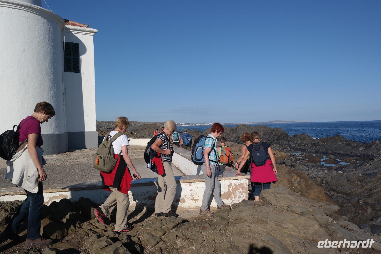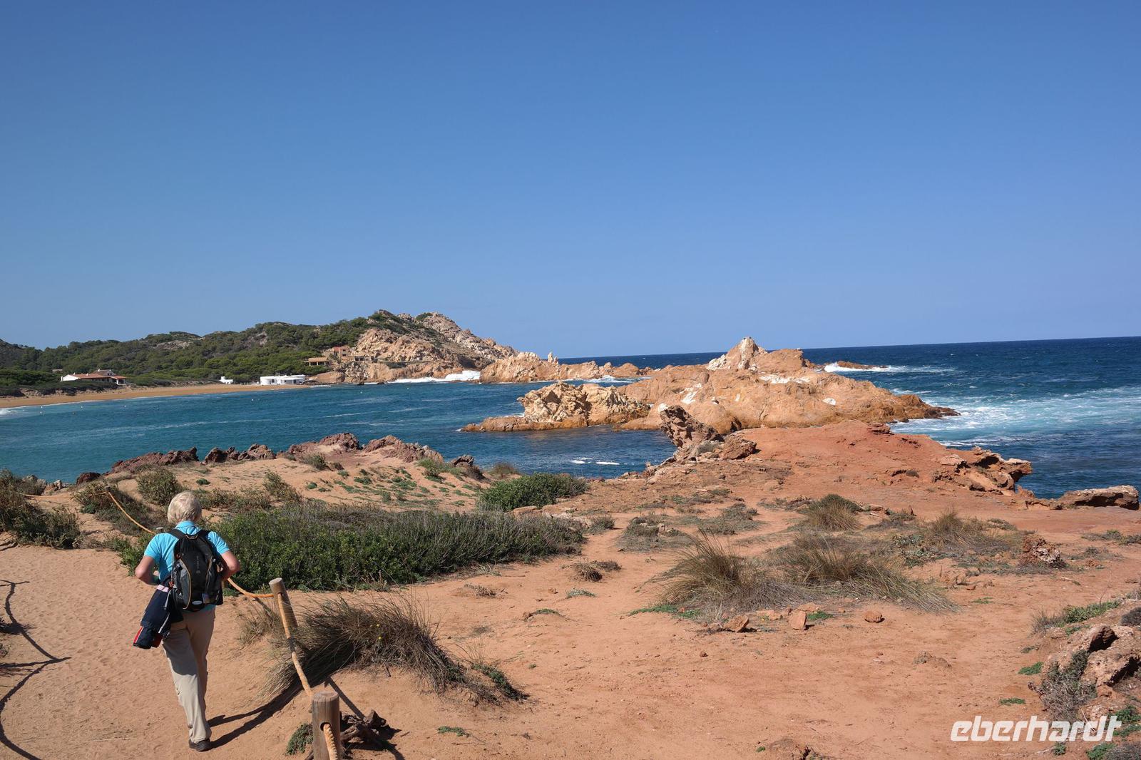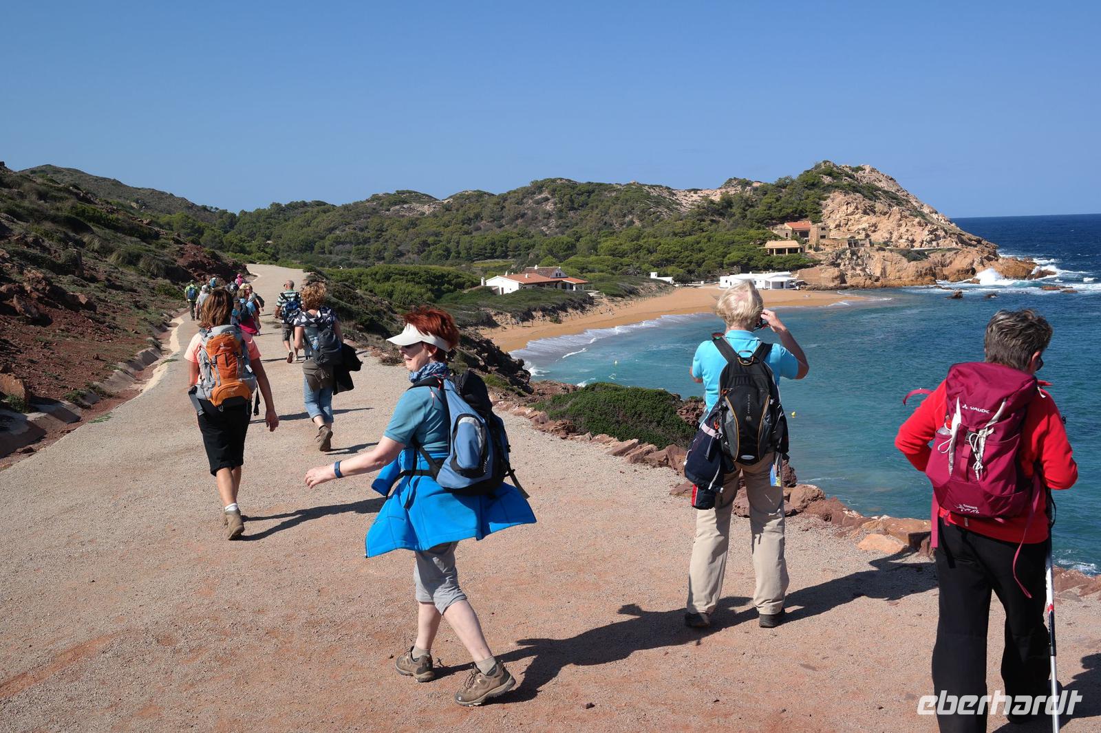 Warme Sonnenstrahlen und ein strahlender George begrüßen uns und wir fahren mit dem Bus zunächst in den Norden der Insel. In unseren Rucksäcken haben wir ausreichend Marschverpflegung und Getränke verstaut - wir sind bereit für die erste Etappe auf dem Cami de Cavalls (Pferdeweg). Dieser Weg (rund 186 km) wurde ursprünglich angelegt, um die Küste der kleinen Insel zu bewachen. Federleicht scheint George über das Gelände zu schweben - wir strengen uns an, ihm zu folgen, seinen Erklärungen zu lauschen und genießen die wunderbaren Aussichten auf die Küsten und Strände im Norden der Insel. Die Auf- und Abstiege, das gute Tempo und unsere wohl zu schweren Rucksäcke beschleunigen Puls und Atmung - George nimmt das wahr und ruft in gewissen Abständen zu Trink- und Obstpausen, ja er „gewährt" uns sogar ein längere Rast um verbrauchte Energien aufzufrischen . Schritt zu halten, dabei fotografieren, sich unterhalten, die schönen Aussichten genießen und Eindrücke zu verarbeiten ist nicht so einfach, wie es scheint. Wir meistern die erste Herausforderung und genießen vor allem die wild-romantische Natur, die wärmende Sonne und die salzige Luft, die über die Küste weht. Am zeitigen Nachmittag zieht es die ersten zu einem erfrischenden Bad im Mittelmeer - andere ziehen weiter in ein lauschiges Gartenlokal, wo uns unser George als Kellner empfängt. Gut eingewandert freuen wir uns auf den kommenden Tag.