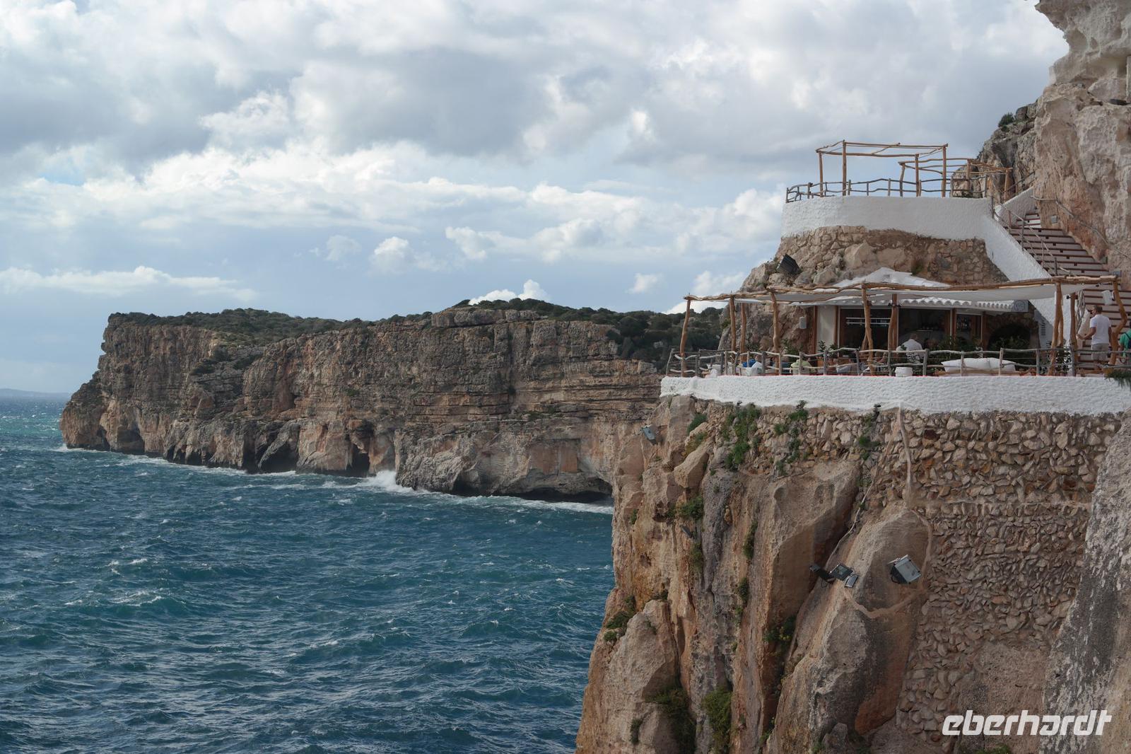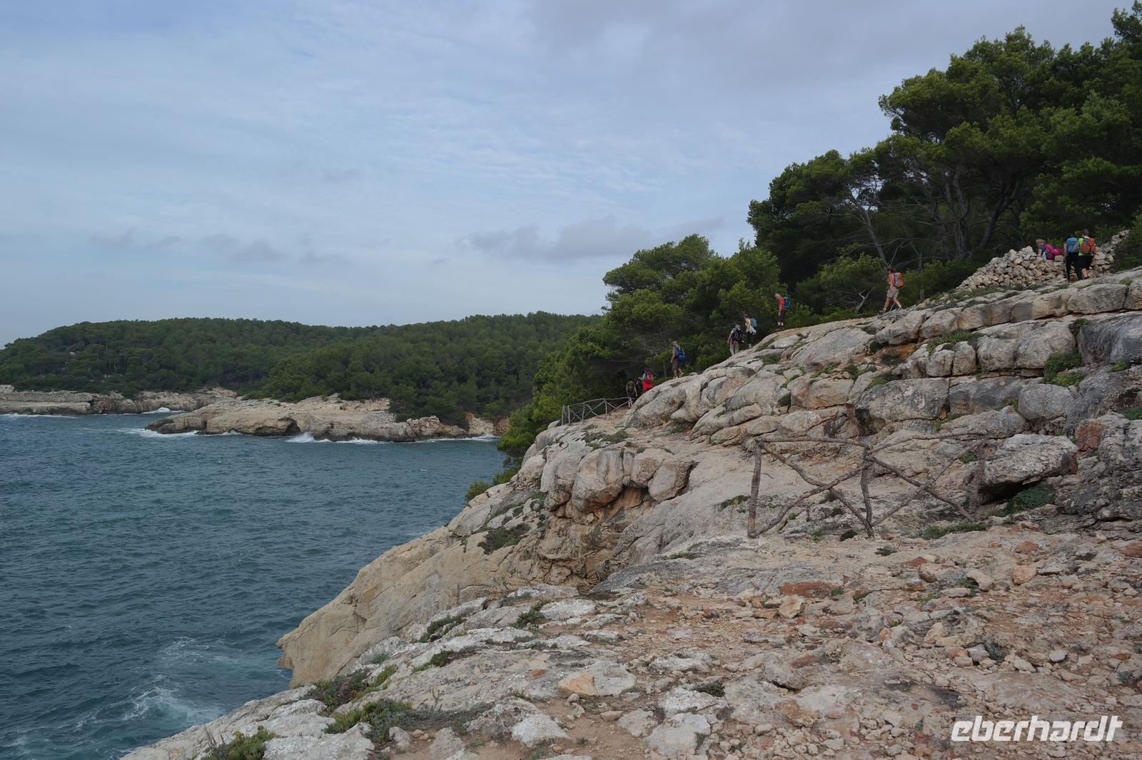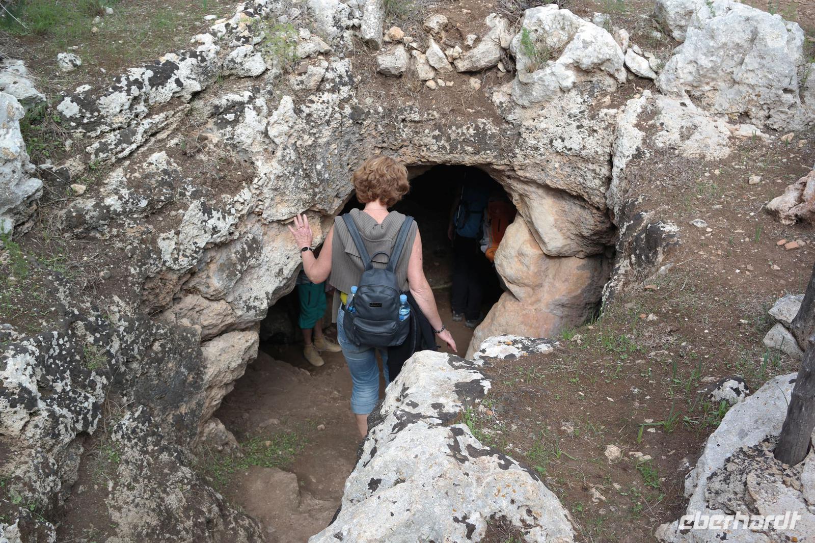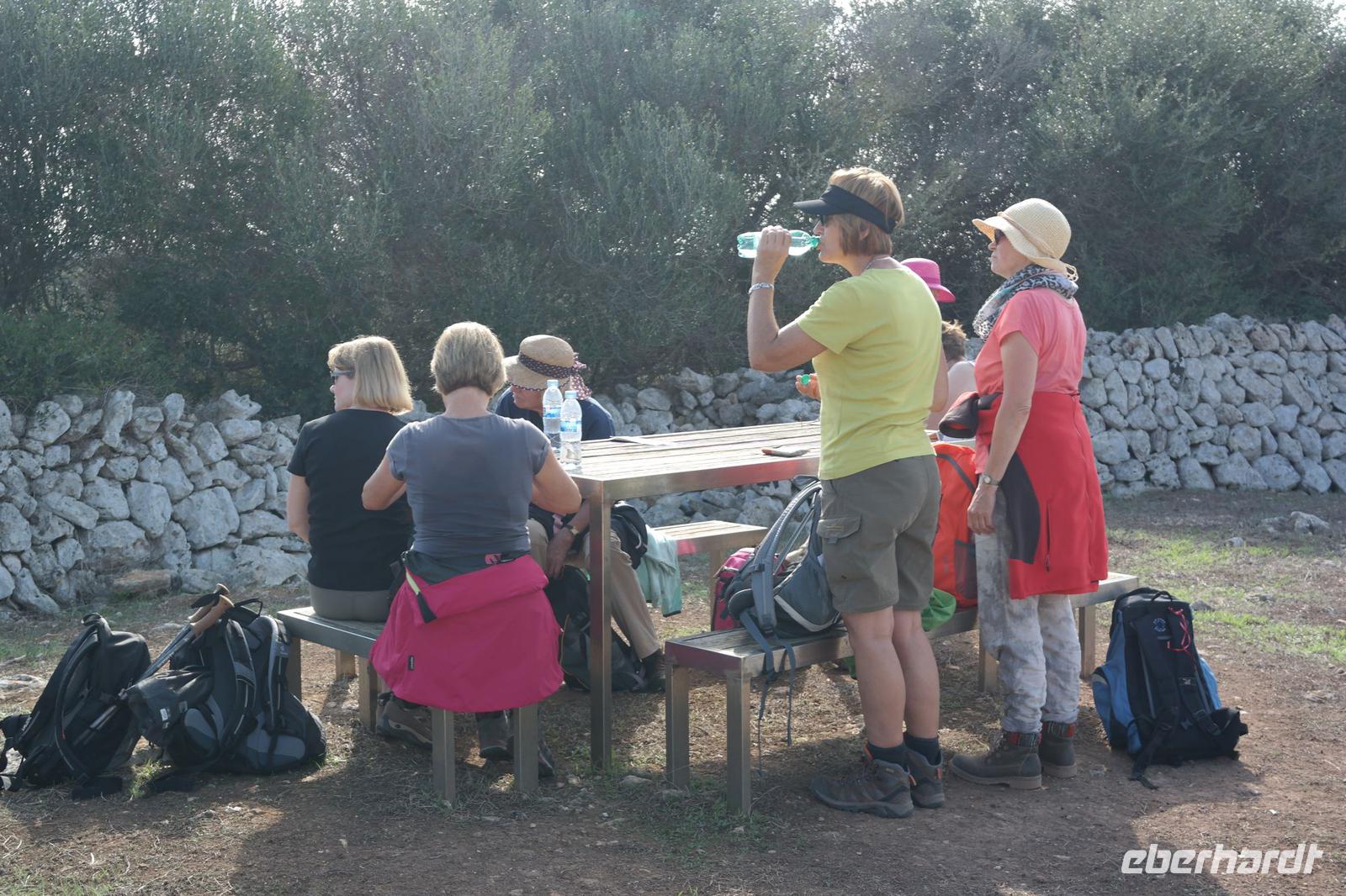 Am Morgen lacht die Sonne schon wieder und unser George lädt uns ein auf eine neue, tolle Wanderung. Direkt am Hotel beginnen wir, gehen zunächst hinunter zum Strand, vorbei an steinmauer-umgebenen kleinen Feldern und eine romantische Schlucht hinunter bis zum Meer. Georges verschmitztes Lachen lässt uns ahnen, dass es jetzt wieder steil nach oben geht zu einem kleinen Plateau und weiter in die Ausgrabung einer talaiotischen Siedlung. Wir kommen aus dem Staunen nicht heraus. Wie konnten Menschen 2000 Jahre v.Chr. mit einfachsten Mitteln schwere Steine (zum Teile einige Tonnen schwer) zu Mauern, Rundbauten, Türmen und Brücken formen, uns bereiten dagegen der Bau eine Flughafens oder Bahnhofs mit modernsten Mitteln mehr als Kopfzerbrechen . Wir lösen das Rätsel nicht - außerdem sind wir ja hier zum Wandern. Also geht es wieder bergab und bergauf, jetzt durch die grüne Natur von alten Wäldern, die einige Obstplantagen vor den heftigen Küstenwinden schützen. In der Bucht von Cales Coves bestaunen wir die größte Grabhöhle aus der talaiotischen Epoche - sie diente tausende Jahre später den Einheimischen als Zufluchtstätte vor Piraten und den Piraten und Schmugglern als Versteck, selbst Hippies in den 70ern hausten hier - weil heute alle auf der Insel ordentliche Häuser und Wohnungen haben, kommen nur noch Wanderer. In der Bucht von Cala Es Canutells entdecken wir zwei kleine Höhlen - und müssen diese auch noch erforschen. Dazu entsenden wir 5 wagemutige Wanderer (die anderen werden noch gebraucht ), die den steilen Weg erklimmen und berichten, dass beide Höhlen vor kurzen wohl für jüngere Gäste als Unterkunft gedient haben müssen. In einer kleinen Tapas-Bar erfrischen wir uns und sind recht froh, als uns unser Bus zurück zum Hotel bringt.
