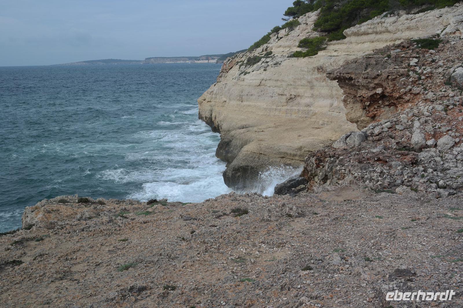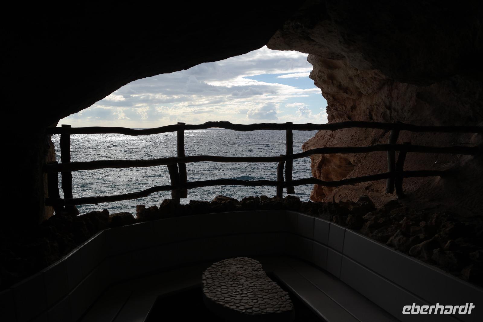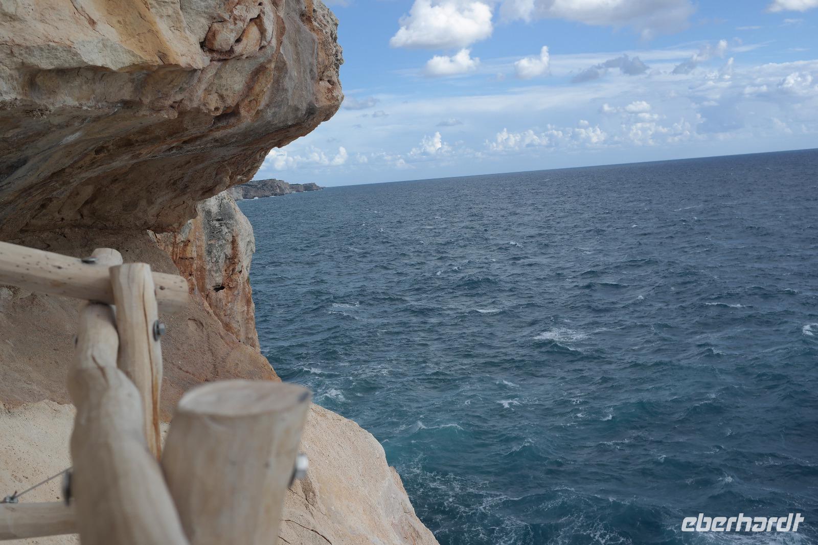 Am Morgen lacht die Sonne schon wieder und unser George lädt uns ein auf eine neue, tolle Wanderung. Direkt am Hotel beginnen wir, gehen zunächst hinunter zum Strand, vorbei an steinmauer-umgebenen kleinen Feldern und eine romantische Schlucht hinunter bis zum Meer. Georges verschmitztes Lachen lässt uns ahnen, dass es jetzt wieder steil nach oben geht zu einem kleinen Plateau und weiter in die Ausgrabung einer talaiotischen Siedlung. Wir kommen aus dem Staunen nicht heraus. Wie konnten Menschen 2000 Jahre v.Chr. mit einfachsten Mitteln schwere Steine (zum Teile einige Tonnen schwer) zu Mauern, Rundbauten, Türmen und Brücken formen, uns bereiten dagegen der Bau eine Flughafens oder Bahnhofs mit modernsten Mitteln mehr als Kopfzerbrechen . Wir lösen das Rätsel nicht - außerdem sind wir ja hier zum Wandern. Also geht es wieder bergab und bergauf, jetzt durch die grüne Natur von alten Wäldern, die einige Obstplantagen vor den heftigen Küstenwinden schützen. In der Bucht von Cales Coves bestaunen wir die größte Grabhöhle aus der talaiotischen Epoche - sie diente tausende Jahre später den Einheimischen als Zufluchtstätte vor Piraten und den Piraten und Schmugglern als Versteck, selbst Hippies in den 70ern hausten hier - weil heute alle auf der Insel ordentliche Häuser und Wohnungen haben, kommen nur noch Wanderer. In der Bucht von Cala Es Canutells entdecken wir zwei kleine Höhlen - und müssen diese auch noch erforschen. Dazu entsenden wir 5 wagemutige Wanderer (die anderen werden noch gebraucht ), die den steilen Weg erklimmen und berichten, dass beide Höhlen vor kurzen wohl für jüngere Gäste als Unterkunft gedient haben müssen. In einer kleinen Tapas-Bar erfrischen wir uns und sind recht froh, als uns unser Bus zurück zum Hotel bringt.