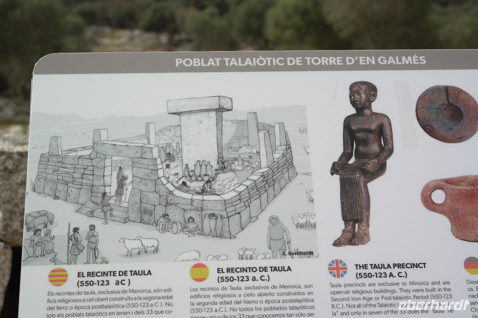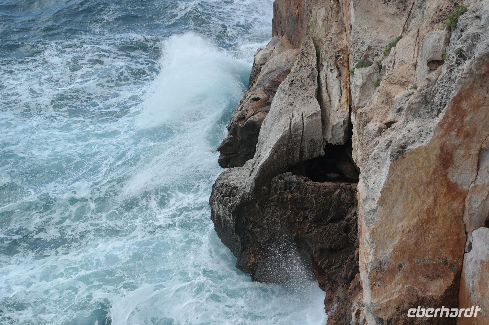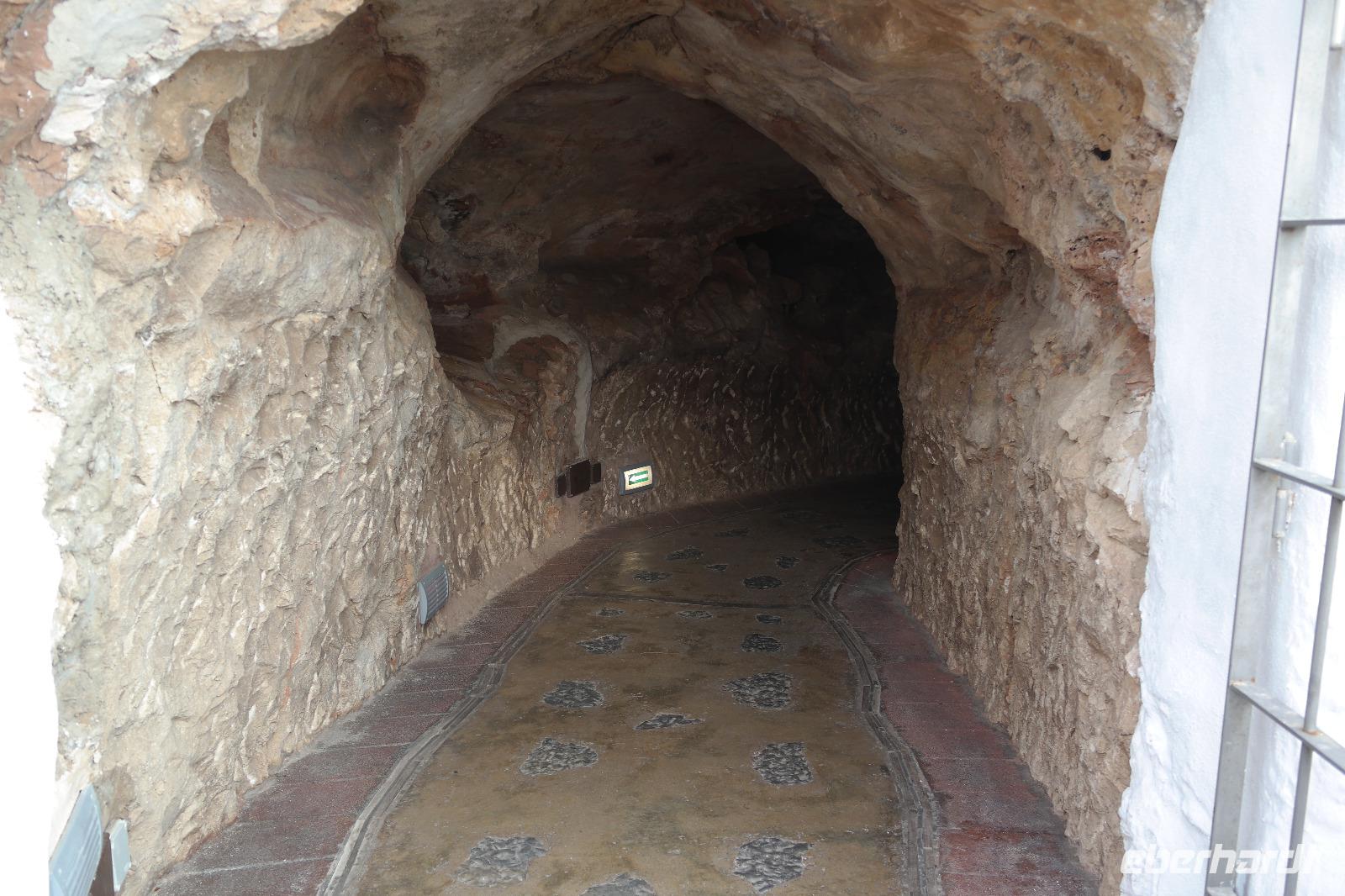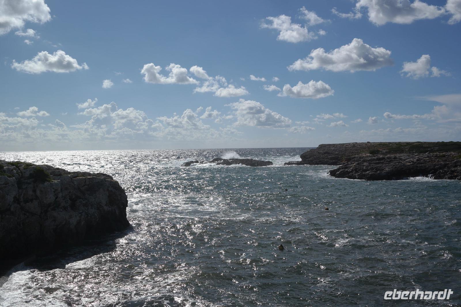 Am Morgen lacht die Sonne schon wieder und unser George lädt uns ein auf eine neue, tolle Wanderung. Direkt am Hotel beginnen wir, gehen zunächst hinunter zum Strand, vorbei an steinmauer-umgebenen kleinen Feldern und eine romantische Schlucht hinunter bis zum Meer. Georges verschmitztes Lachen lässt uns ahnen, dass es jetzt wieder steil nach oben geht zu einem kleinen Plateau und weiter in die Ausgrabung einer talaiotischen Siedlung. Wir kommen aus dem Staunen nicht heraus. Wie konnten Menschen 2000 Jahre v.Chr. mit einfachsten Mitteln schwere Steine (zum Teile einige Tonnen schwer) zu Mauern, Rundbauten, Türmen und Brücken formen, uns bereiten dagegen der Bau eine Flughafens oder Bahnhofs mit modernsten Mitteln mehr als Kopfzerbrechen . Wir lösen das Rätsel nicht - außerdem sind wir ja hier zum Wandern. Also geht es wieder bergab und bergauf, jetzt durch die grüne Natur von alten Wäldern, die einige Obstplantagen vor den heftigen Küstenwinden schützen. In der Bucht von Cales Coves bestaunen wir die größte Grabhöhle aus der talaiotischen Epoche - sie diente tausende Jahre später den Einheimischen als Zufluchtstätte vor Piraten und den Piraten und Schmugglern als Versteck, selbst Hippies in den 70ern hausten hier - weil heute alle auf der Insel ordentliche Häuser und Wohnungen haben, kommen nur noch Wanderer. In der Bucht von Cala Es Canutells entdecken wir zwei kleine Höhlen - und müssen diese auch noch erforschen. Dazu entsenden wir 5 wagemutige Wanderer (die anderen werden noch gebraucht ), die den steilen Weg erklimmen und berichten, dass beide Höhlen vor kurzen wohl für jüngere Gäste als Unterkunft gedient haben müssen. In einer kleinen Tapas-Bar erfrischen wir uns und sind recht froh, als uns unser Bus zurück zum Hotel bringt.